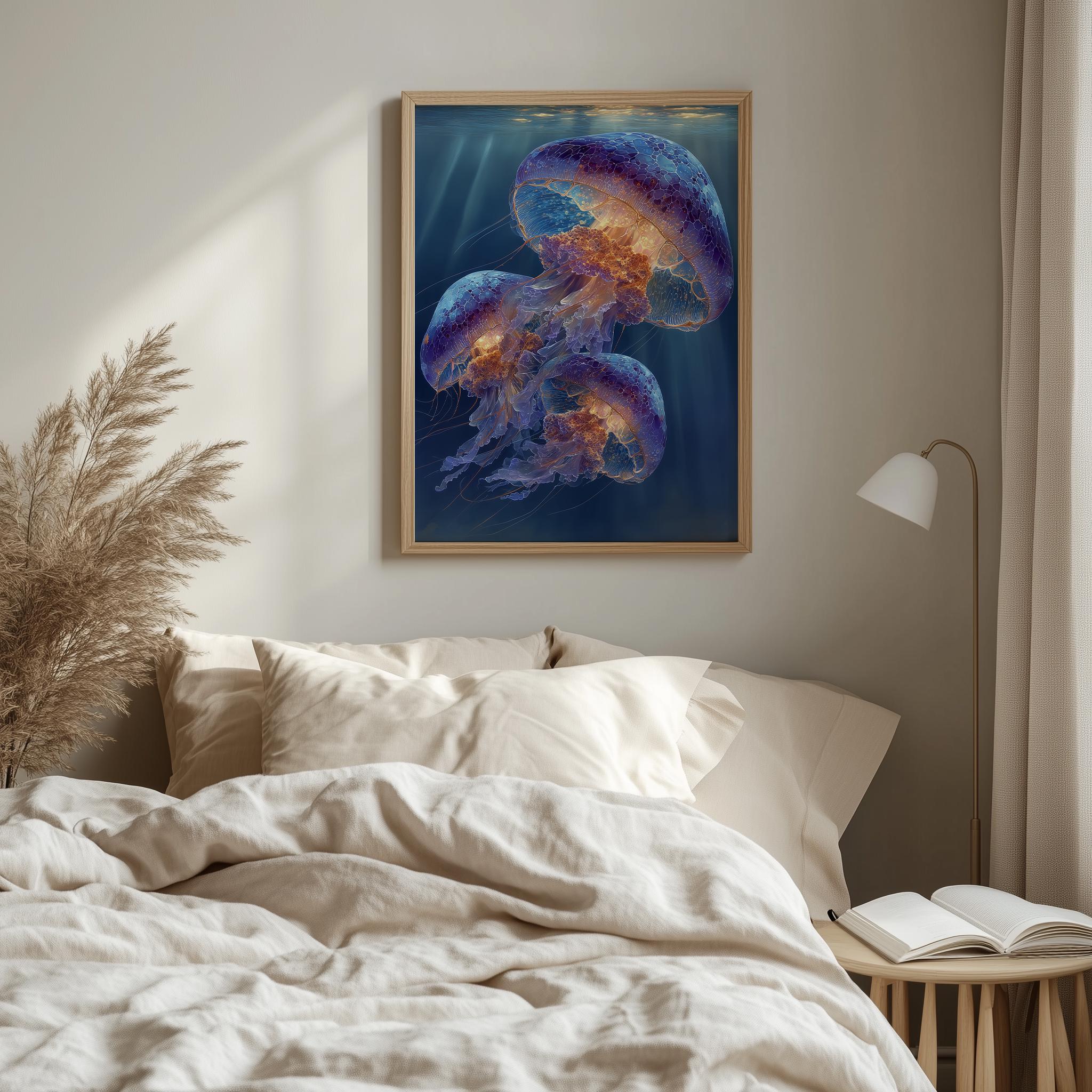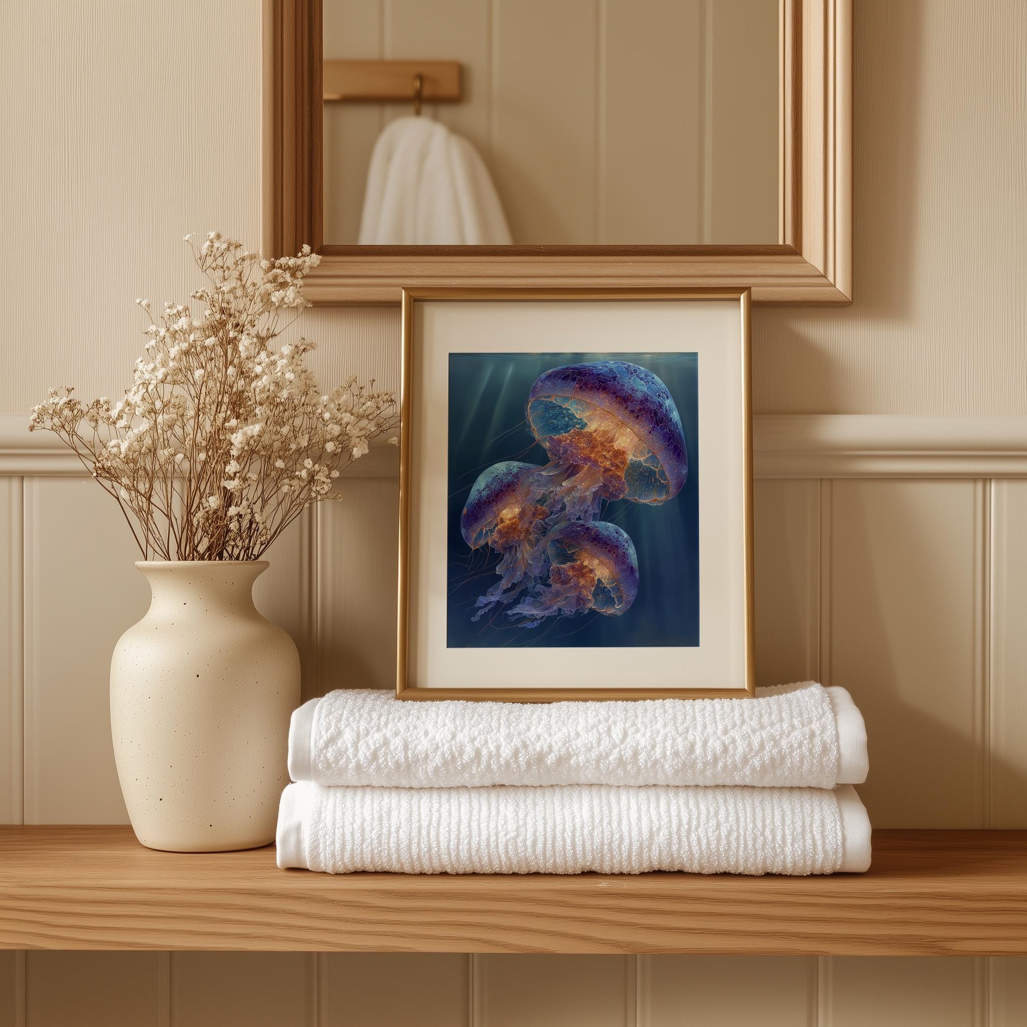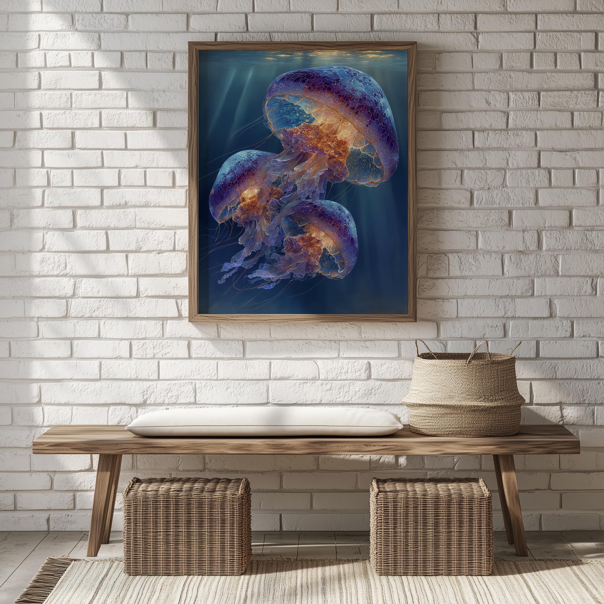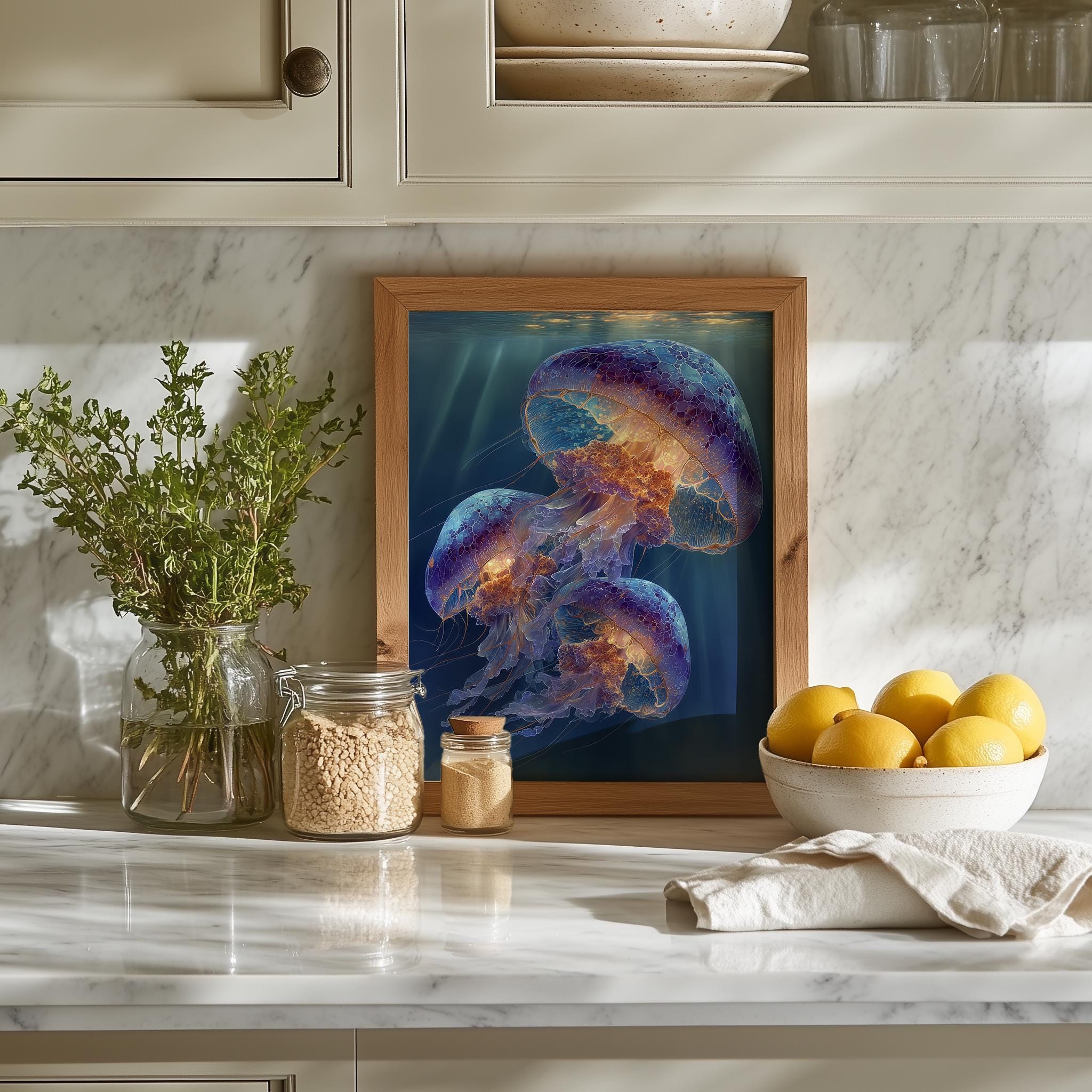 Immerse yourself in the charm of this painting of a mesmerizing moon jellyfish gracefully gliding through deep ocean waters. An instantly downloadable print, it's perfect for elevating your decor with budget-friendly charm. This gives you the flexibility to customize the size, frame, and material according to your personal taste and space, ensuring a perfect fit for your walls.