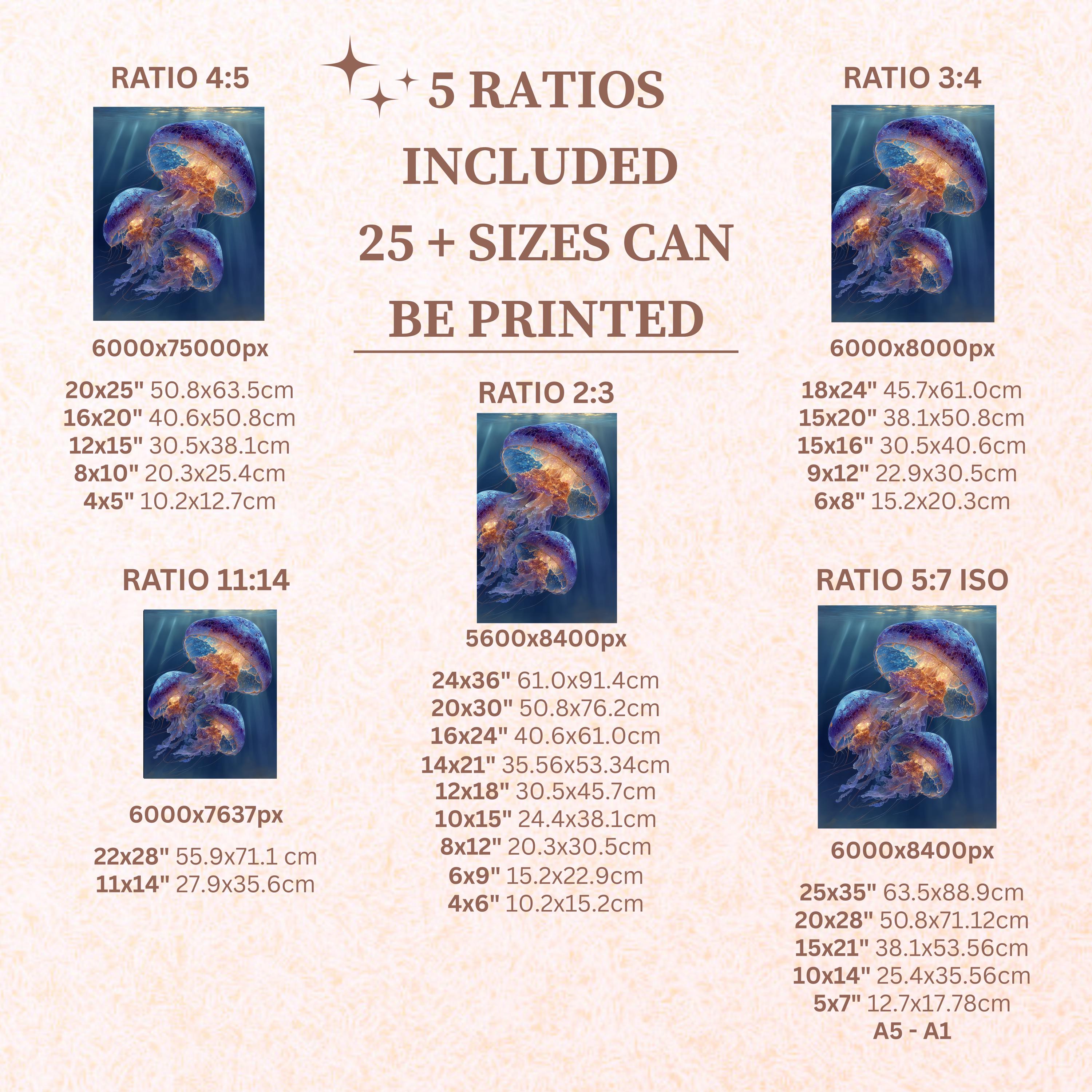 Each artwork includes 5 aspect ratios with 25+ print sizes. Most standard frames are covered. One custom resize per purchase available—message before ordering.