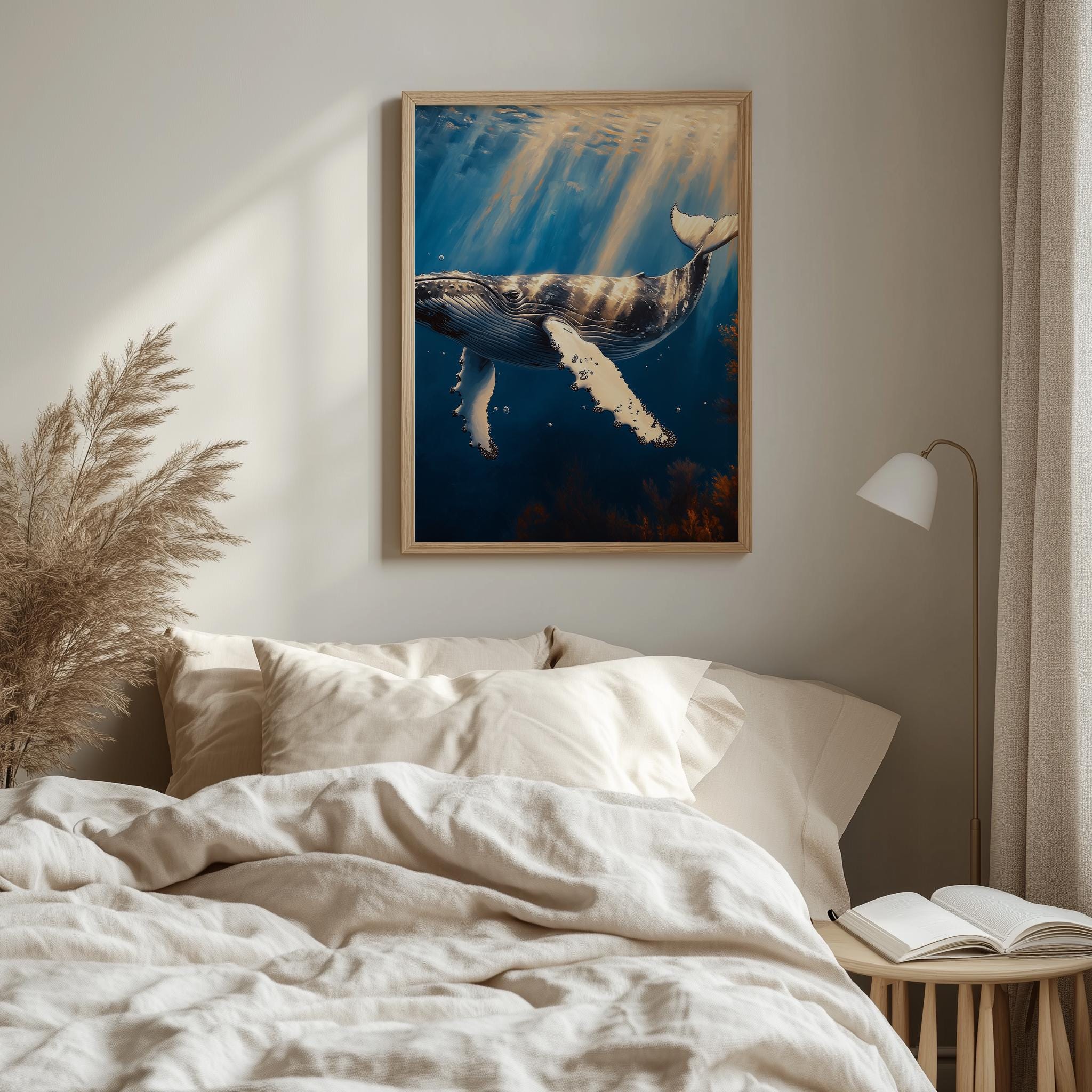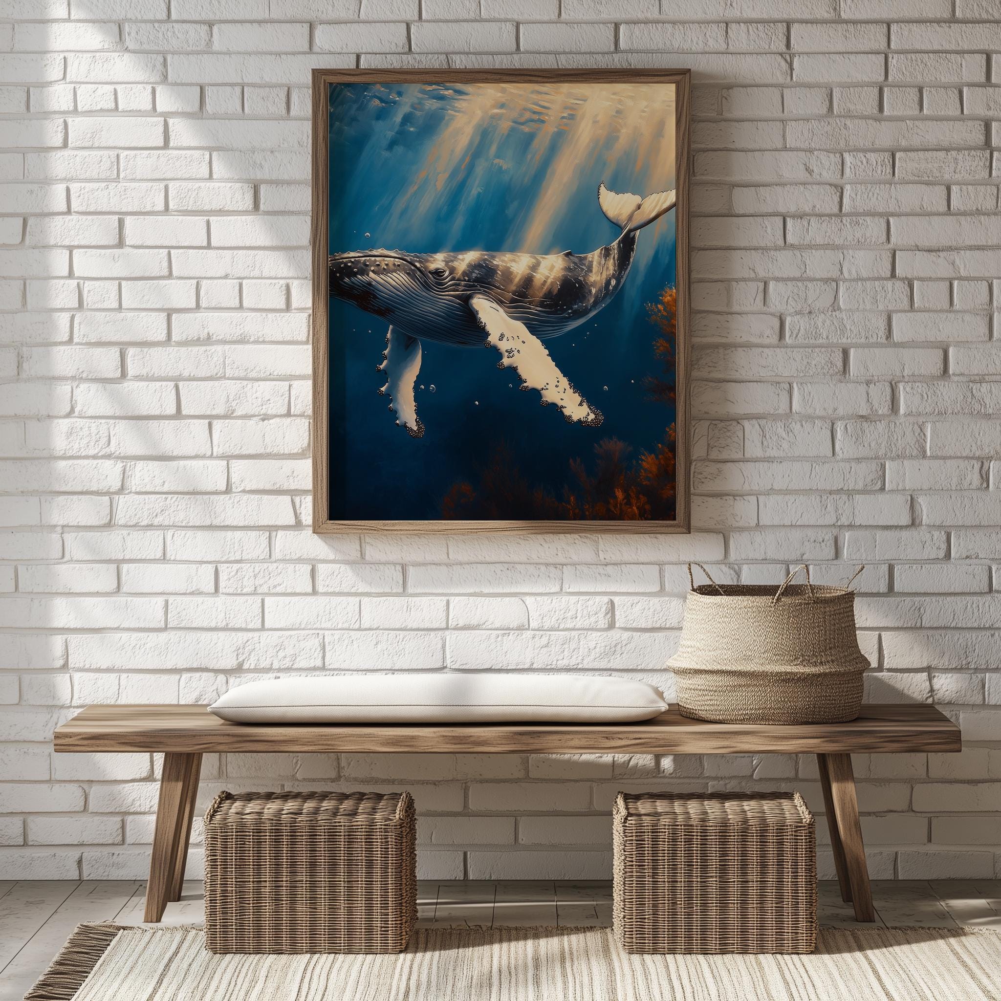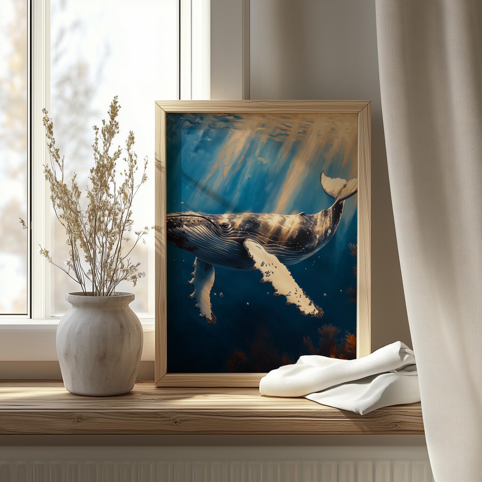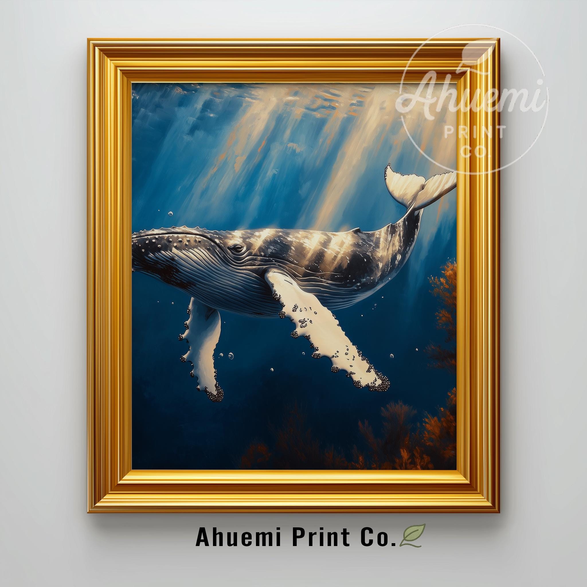 Immerse yourself in the charm of this painting of a majestic humpback whale gracefully swimming through a serene ocean landscape. An instantly downloadable print, it's perfect for elevating your decor with budget-friendly charm. This gives you the flexibility to customize the size, frame, and material according to your personal taste and space, ensuring a perfect fit for your walls.