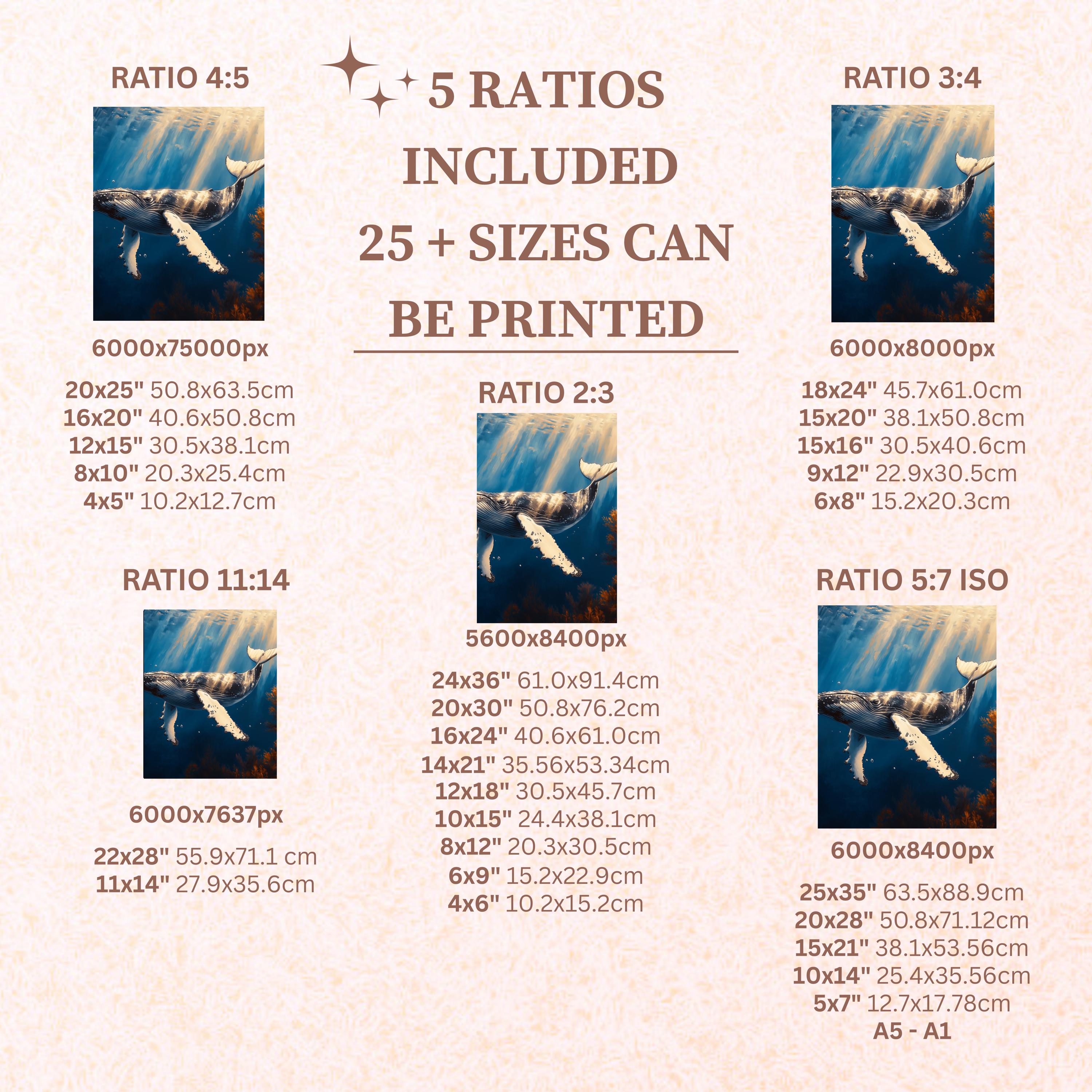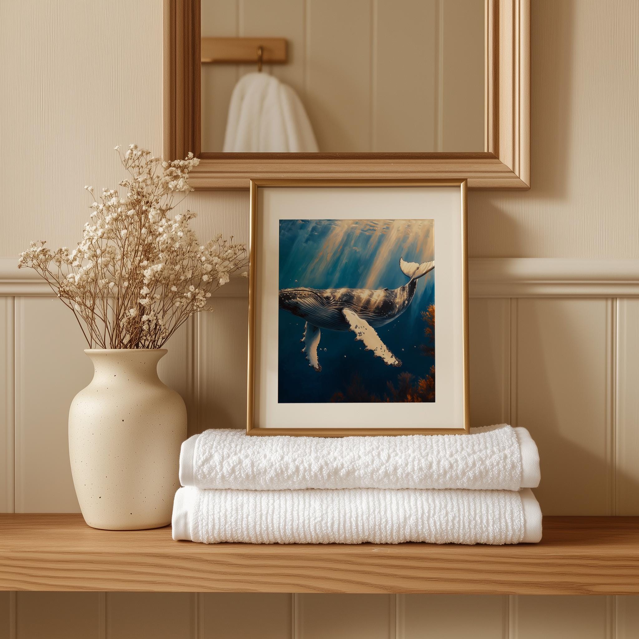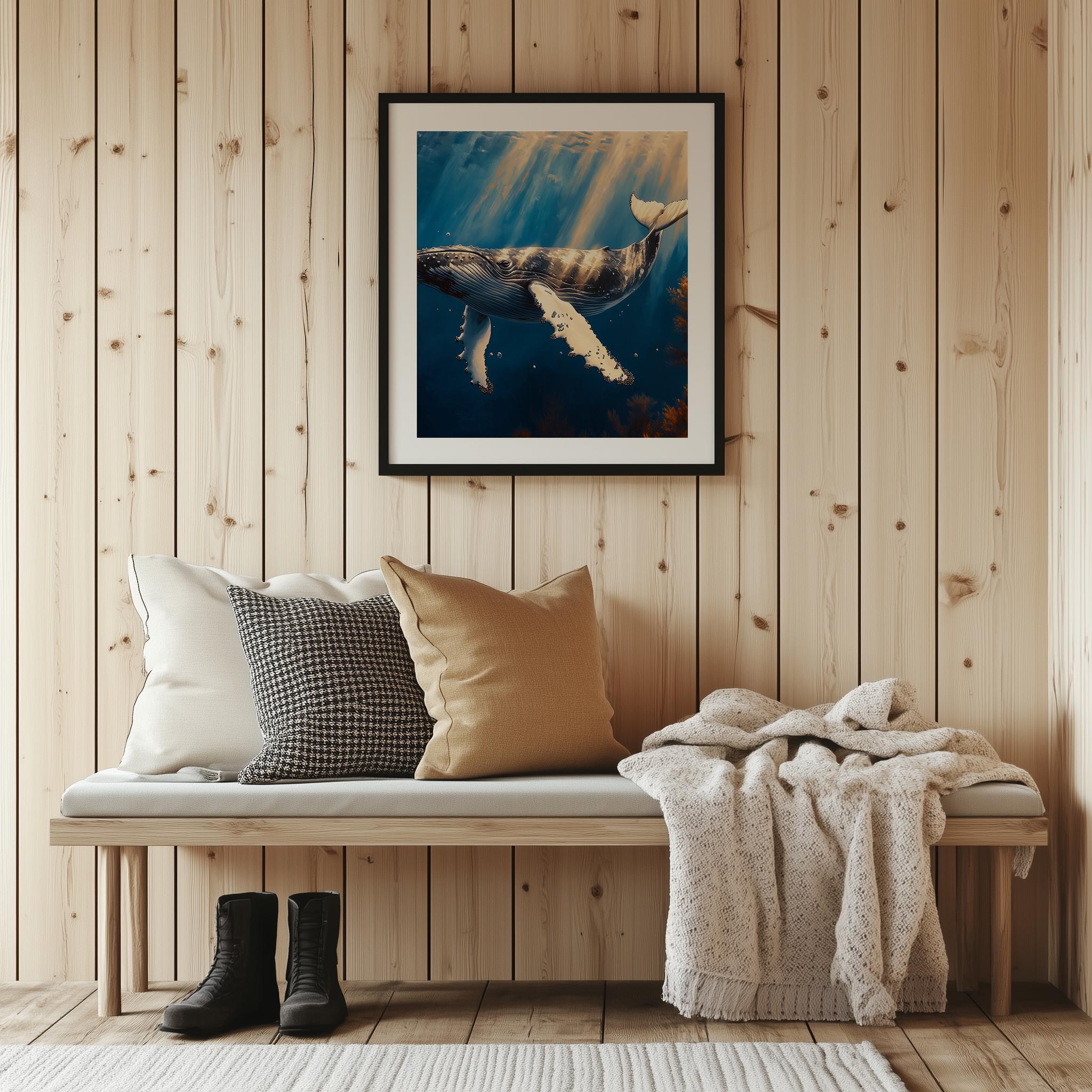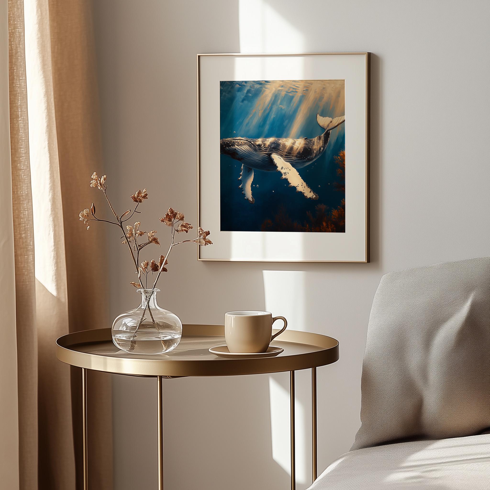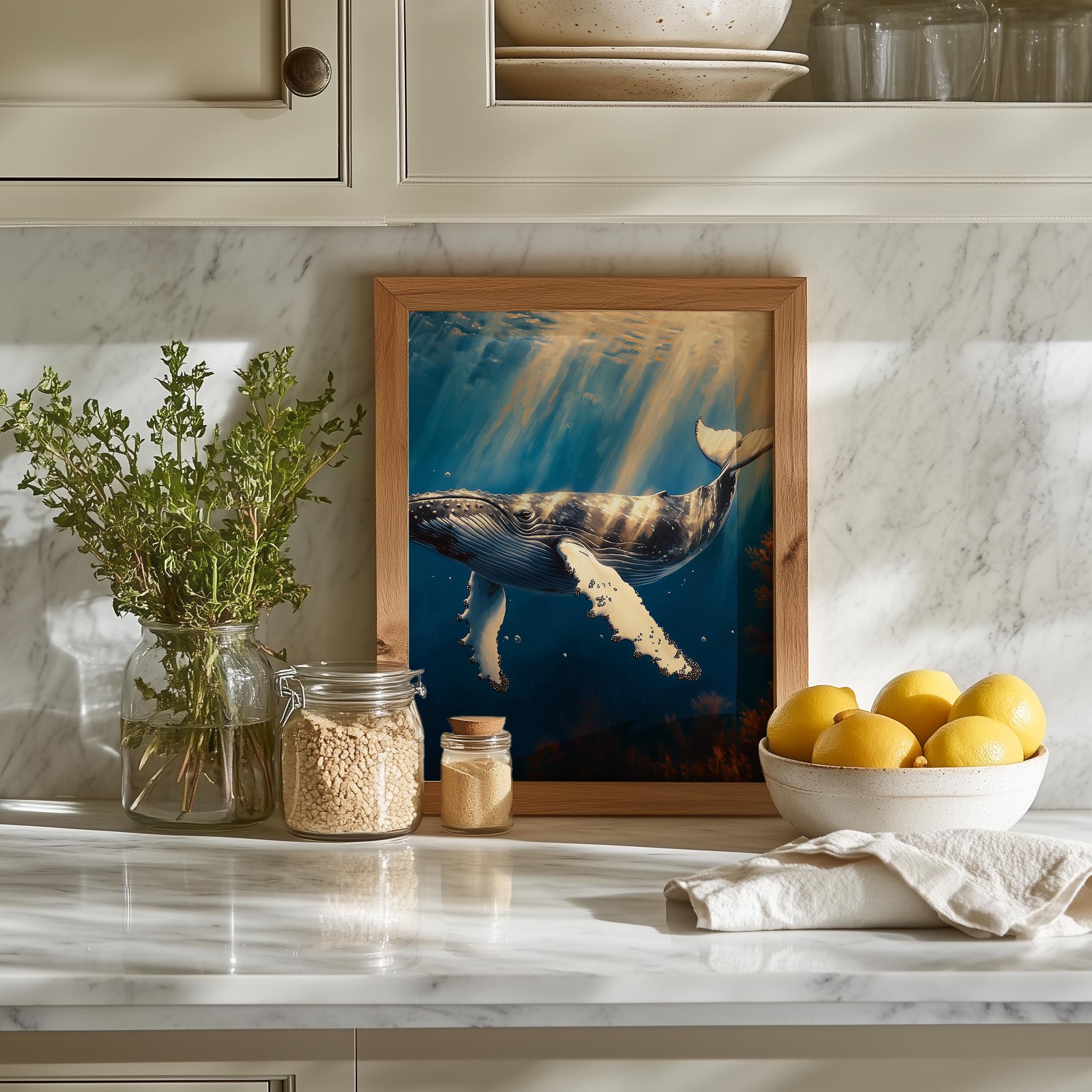 Immerse yourself in the charm of this painting of a majestic humpback whale gracefully swimming through a serene ocean landscape. An instantly downloadable print, it's perfect for elevating your decor with budget-friendly charm. This gives you the flexibility to customize the size, frame, and material according to your personal taste and space, ensuring a perfect fit for your walls.
