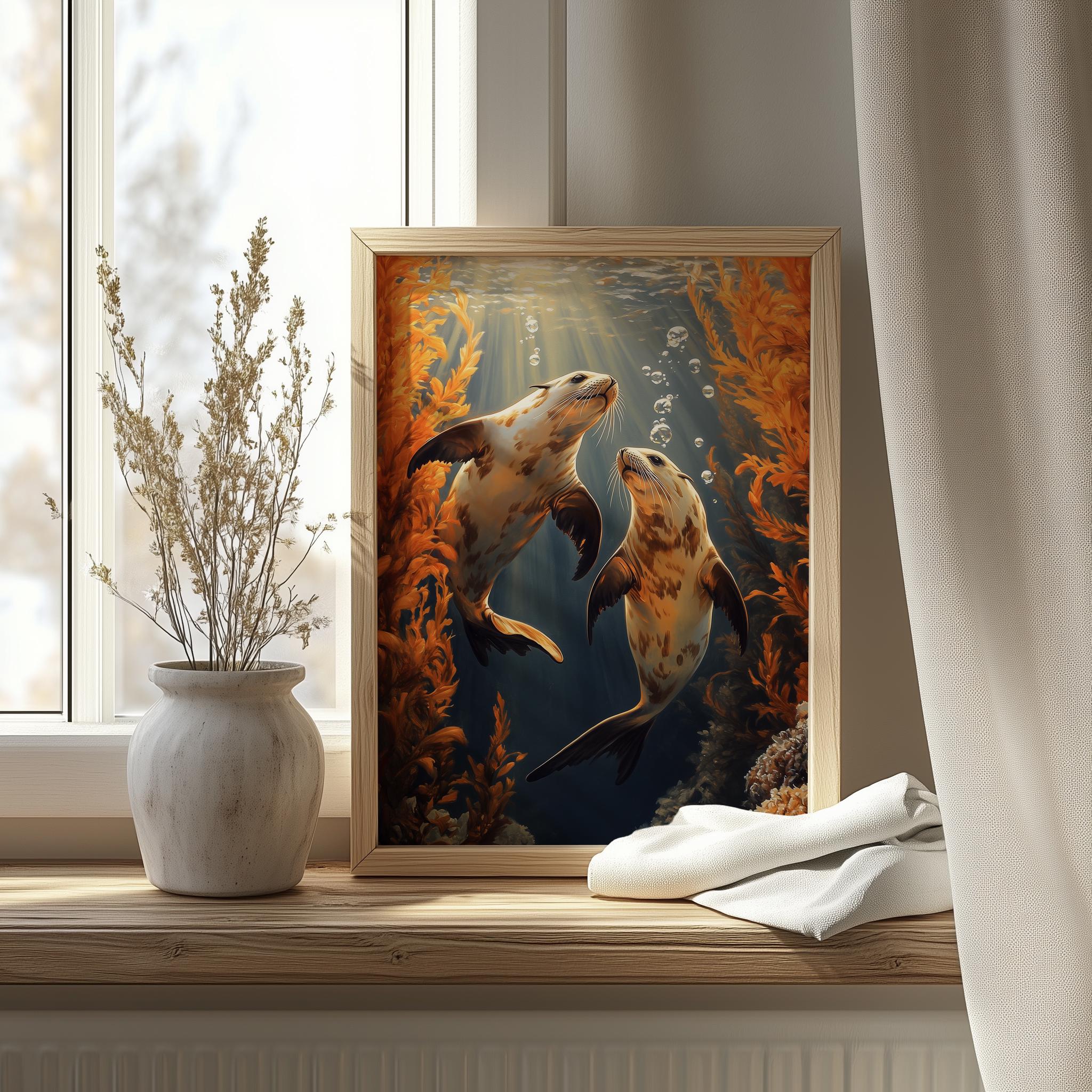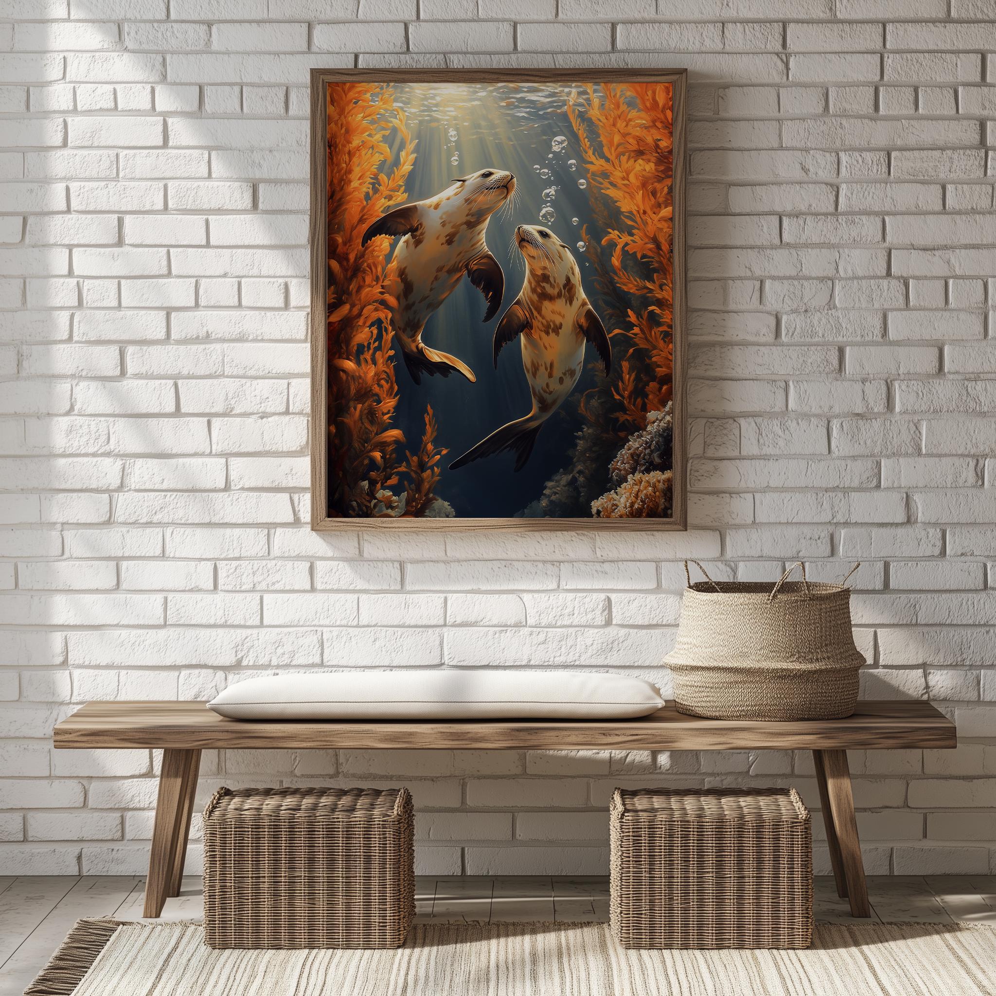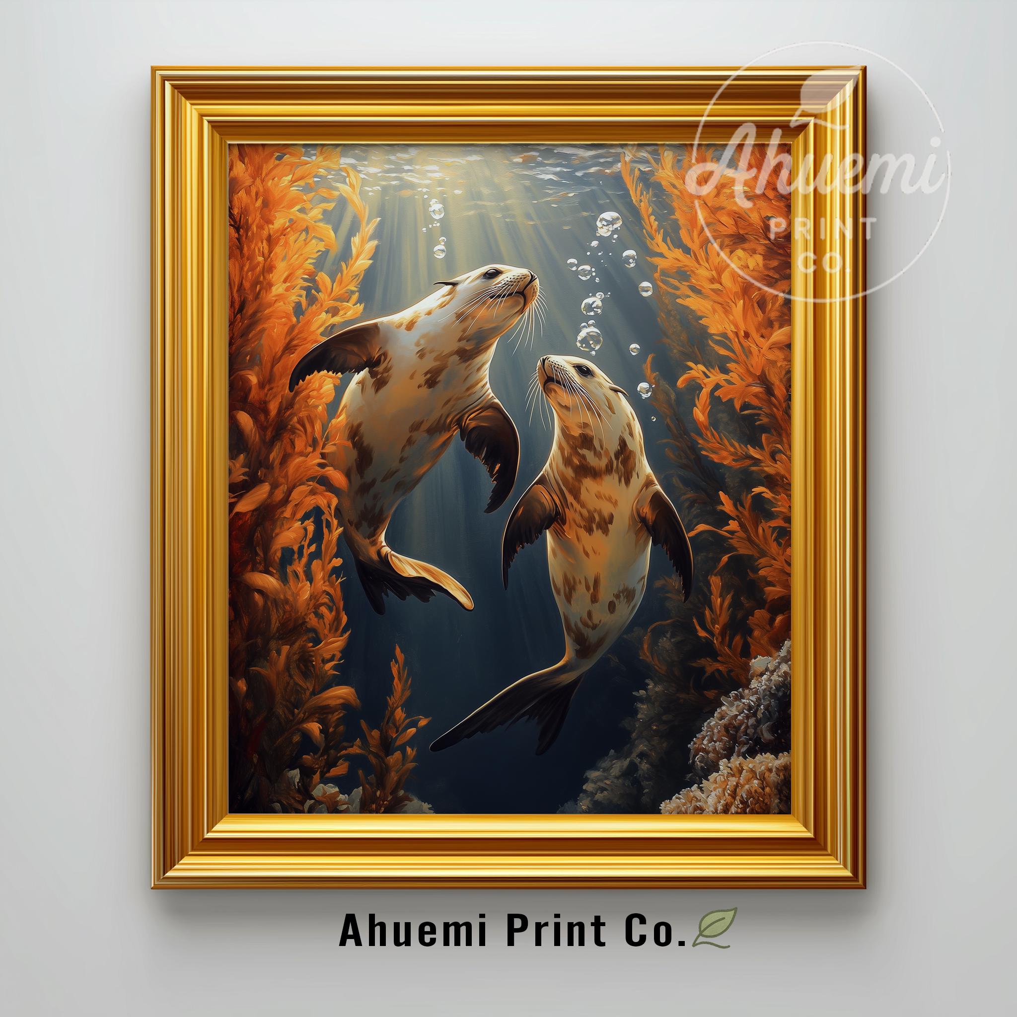Immerse yourself in the charm of this painting of moody sea otters gracefully swimming beneath vibrant amber kelp. An instantly downloadable print, it's perfect for elevating your decor with budget-friendly charm. This gives you the flexibility to customize the size, frame, and material according to your personal taste and space, ensuring a perfect fit for your walls.