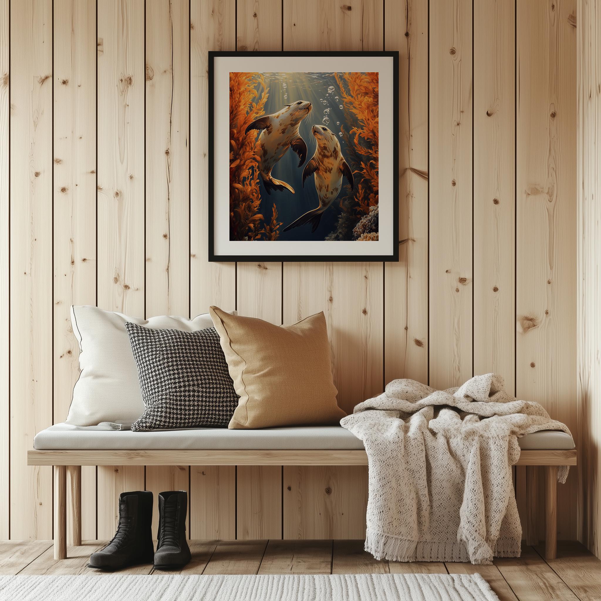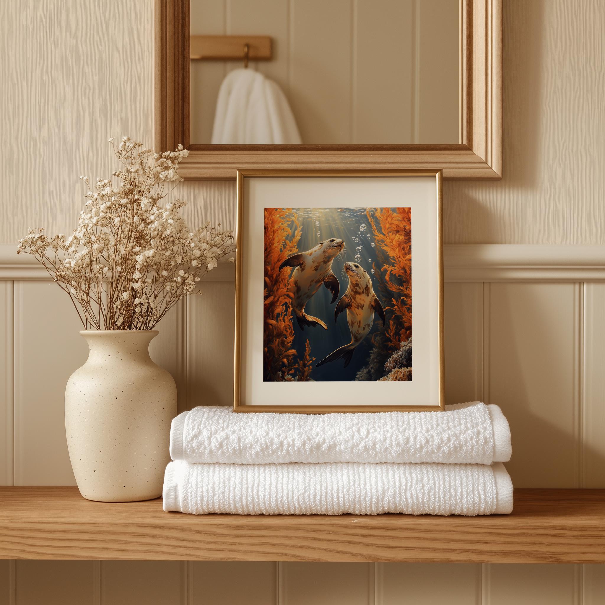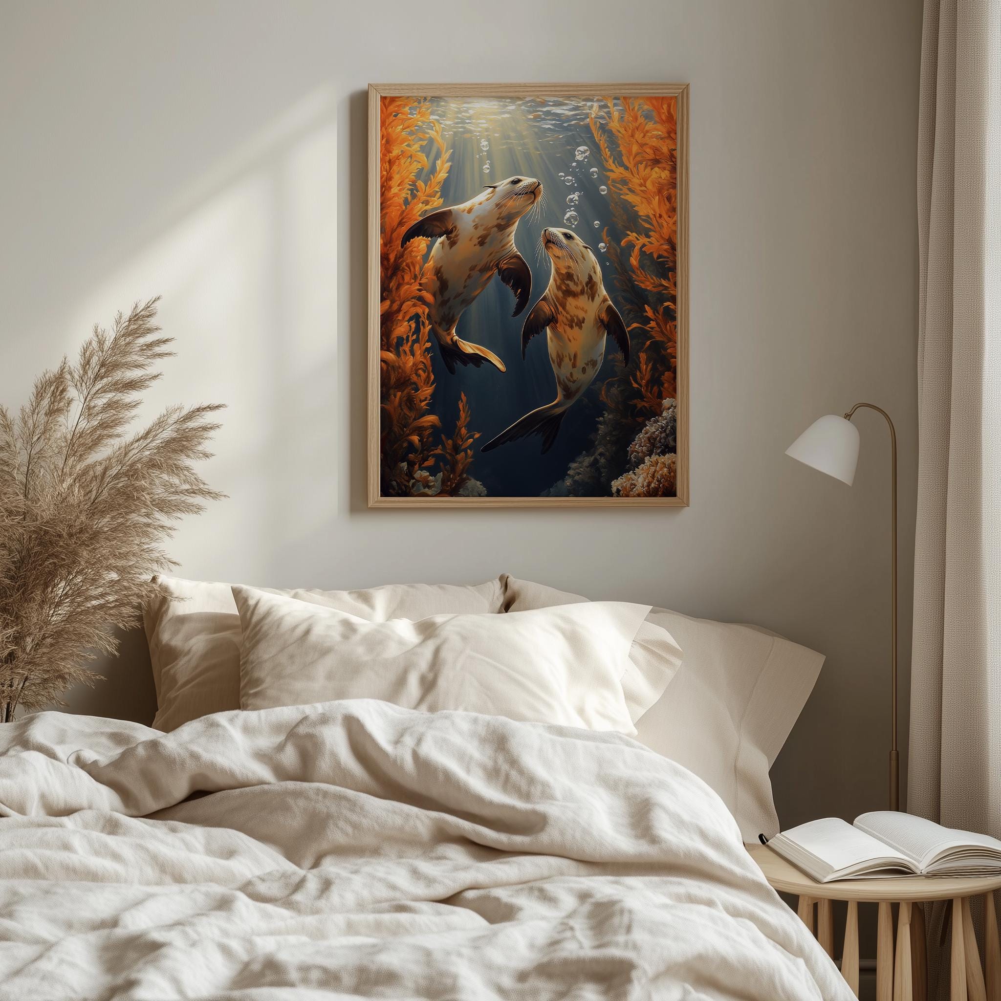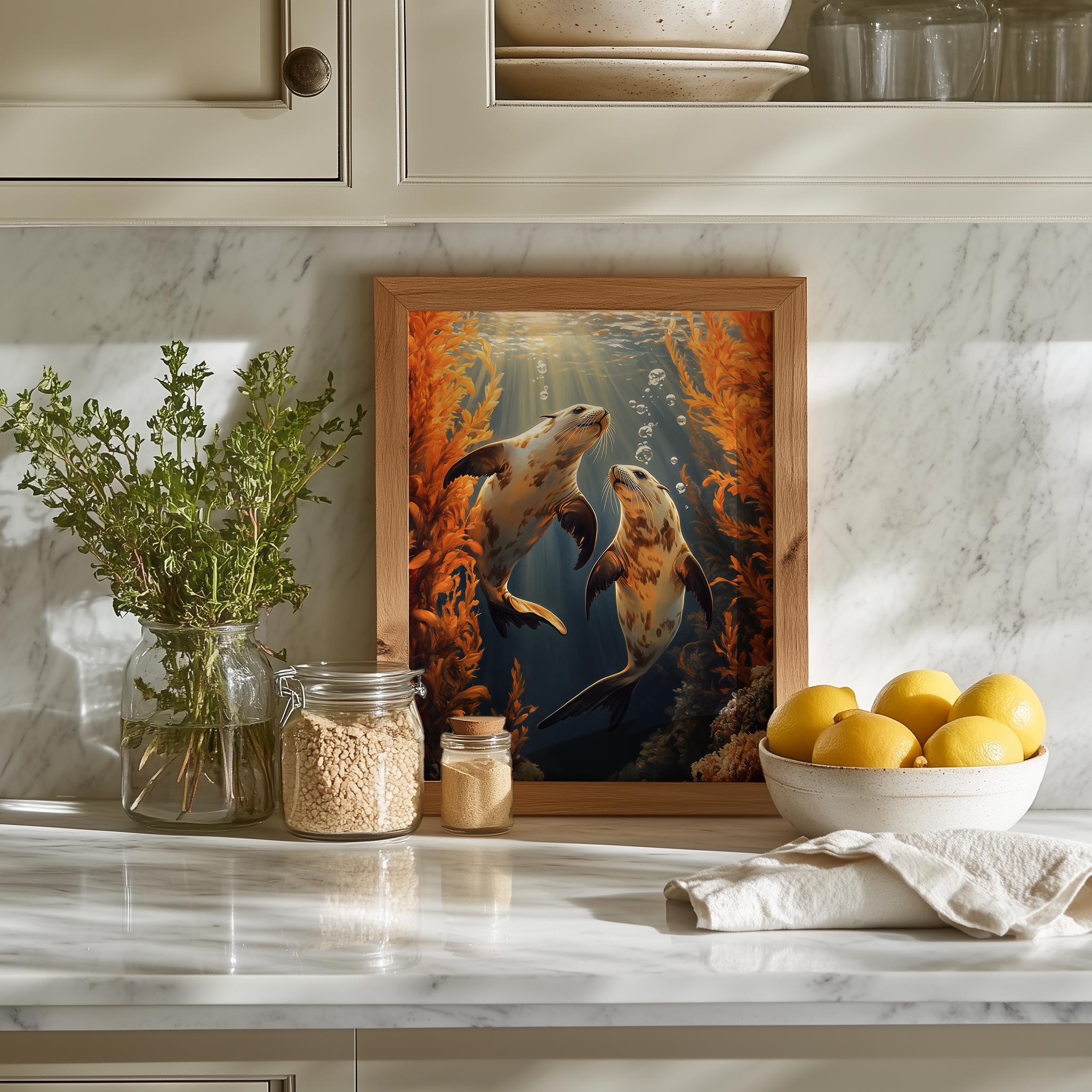 Immerse yourself in the charm of this painting of moody sea otters gracefully swimming beneath vibrant amber kelp. An instantly downloadable print, it's perfect for elevating your decor with budget-friendly charm. This gives you the flexibility to customize the size, frame, and material according to your personal taste and space, ensuring a perfect fit for your walls.