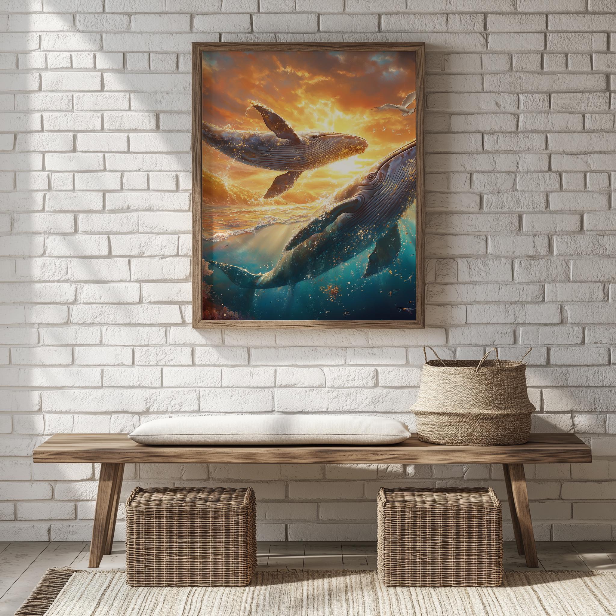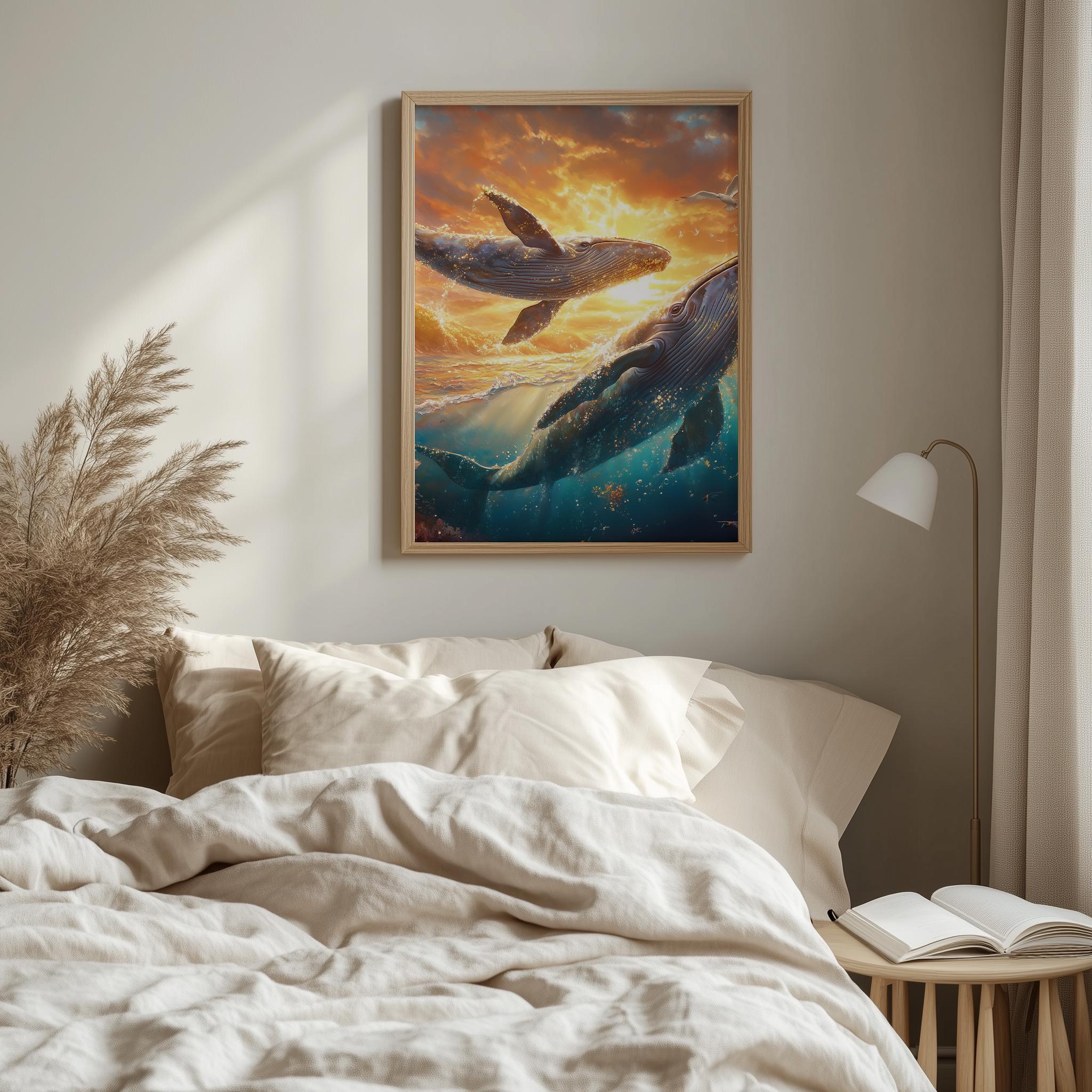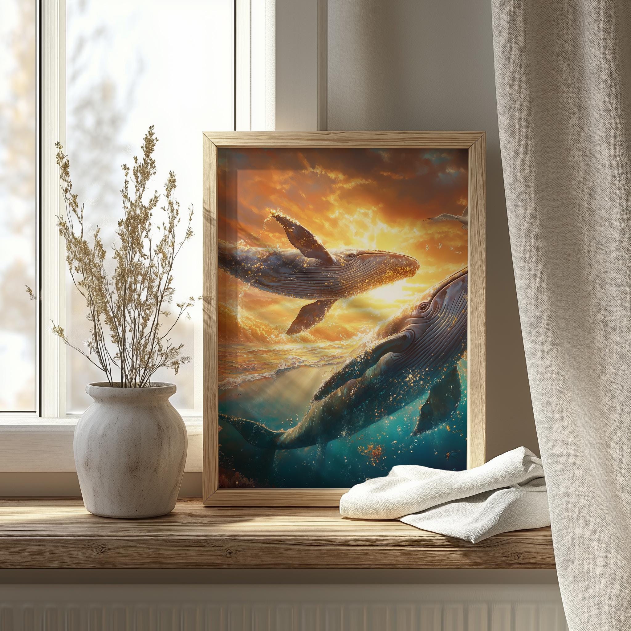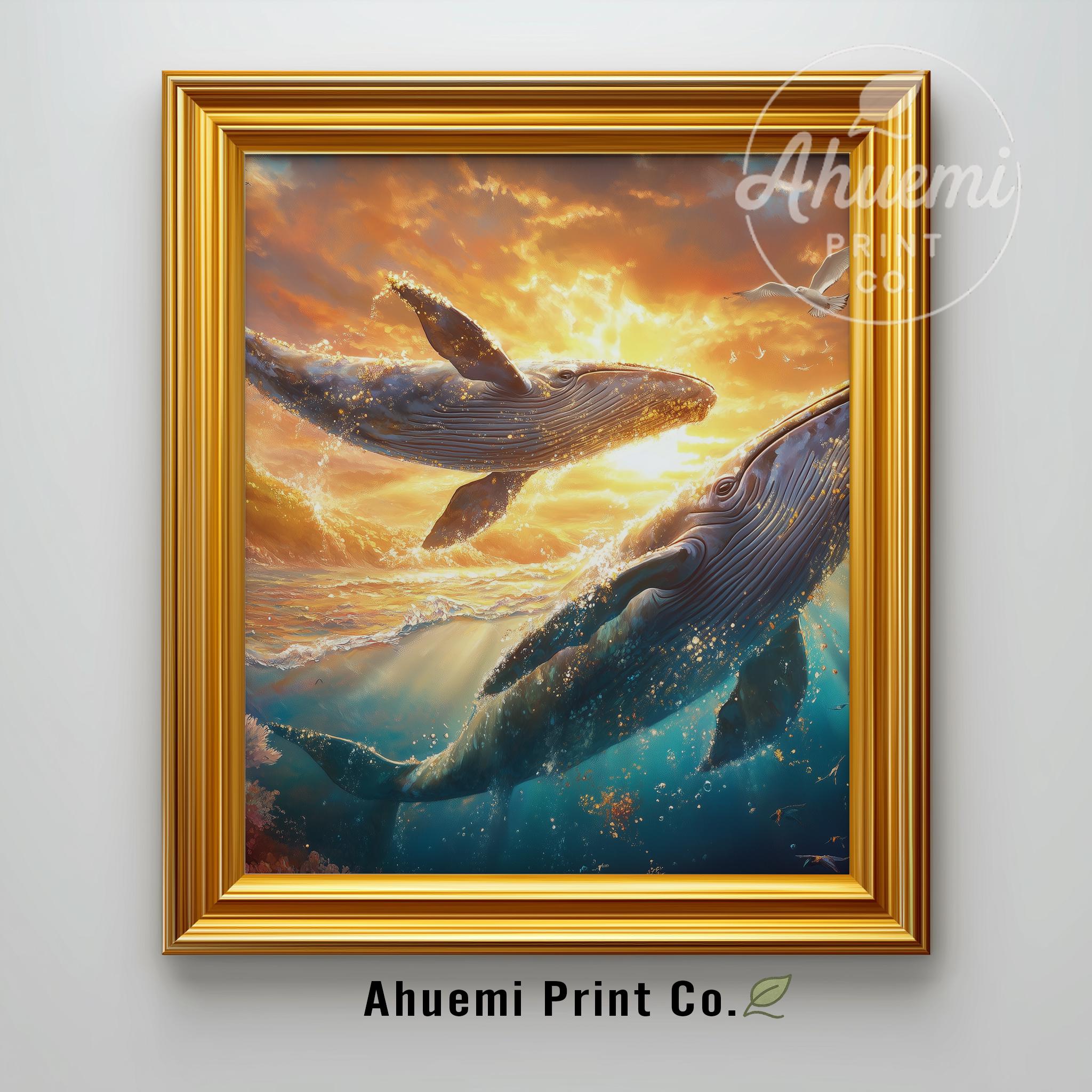 Immerse yourself in the charm of this painting of a magnificent whale gliding through tranquil waters. An instantly downloadable print, it's perfect for elevating your decor with budget-friendly charm. This gives you the flexibility to customize the size, frame, and material according to your personal taste and space, ensuring a perfect fit for your walls.