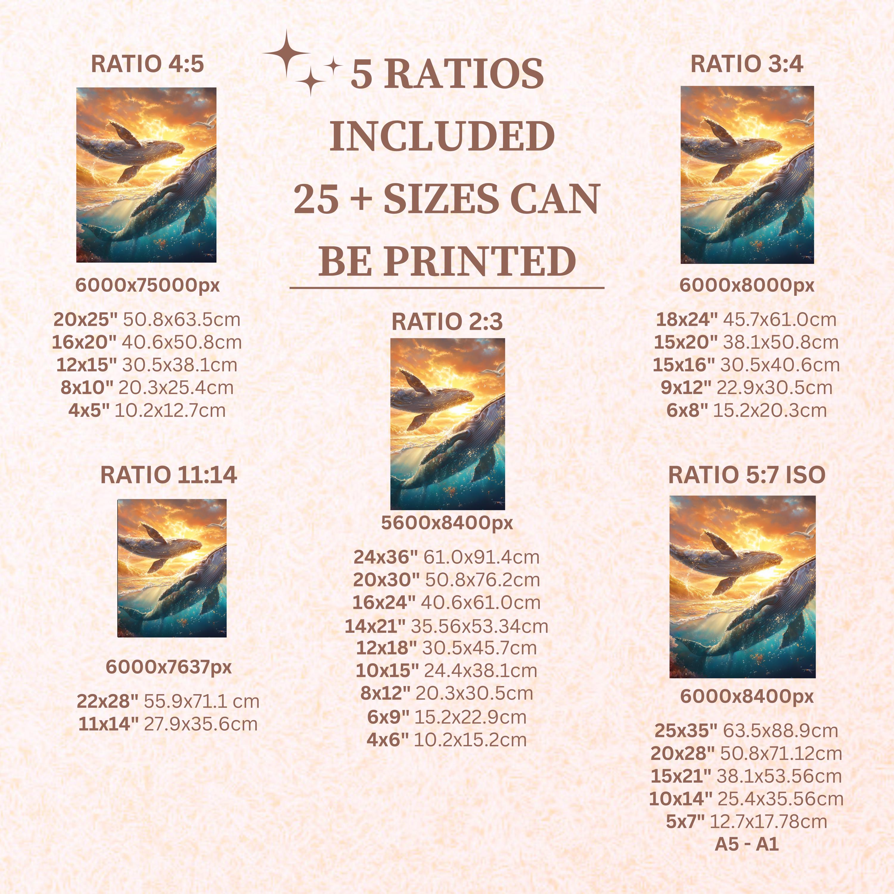 Each artwork includes 5 aspect ratios with 25+ print sizes. Most standard frames are covered. One custom resize per purchase available—message before ordering.
