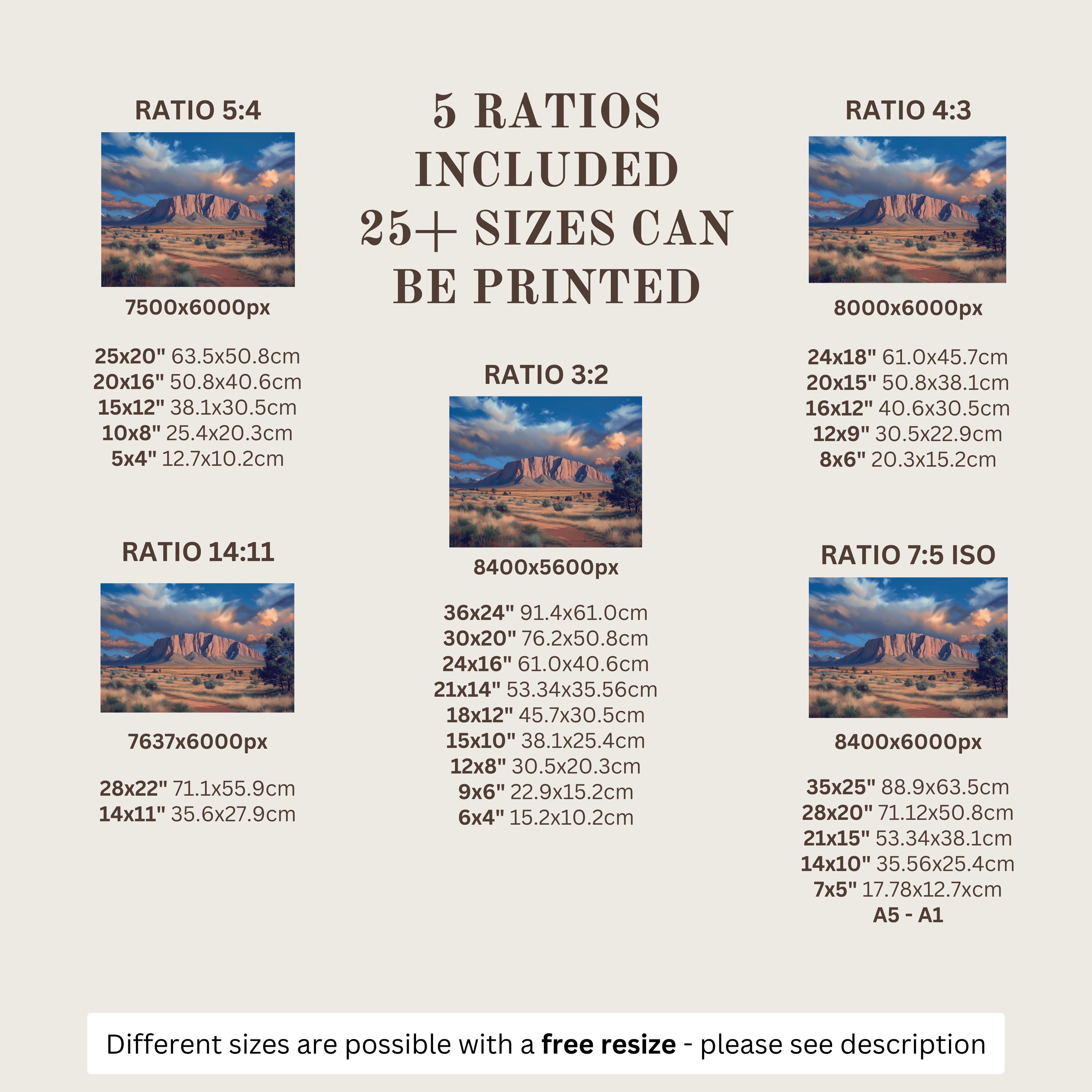Each artwork includes 5 aspect ratios with 25+ print sizes. Most standard frames are covered. One custom resize per purchase available—message before ordering.