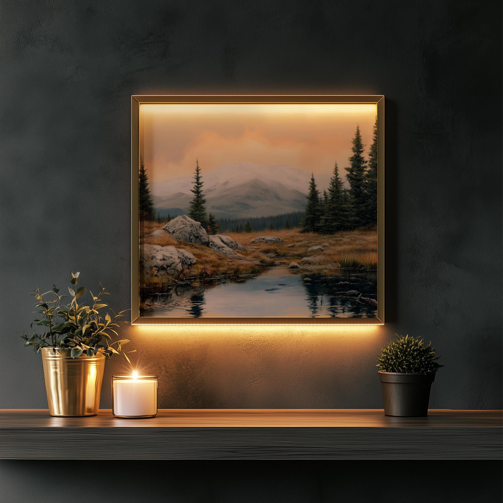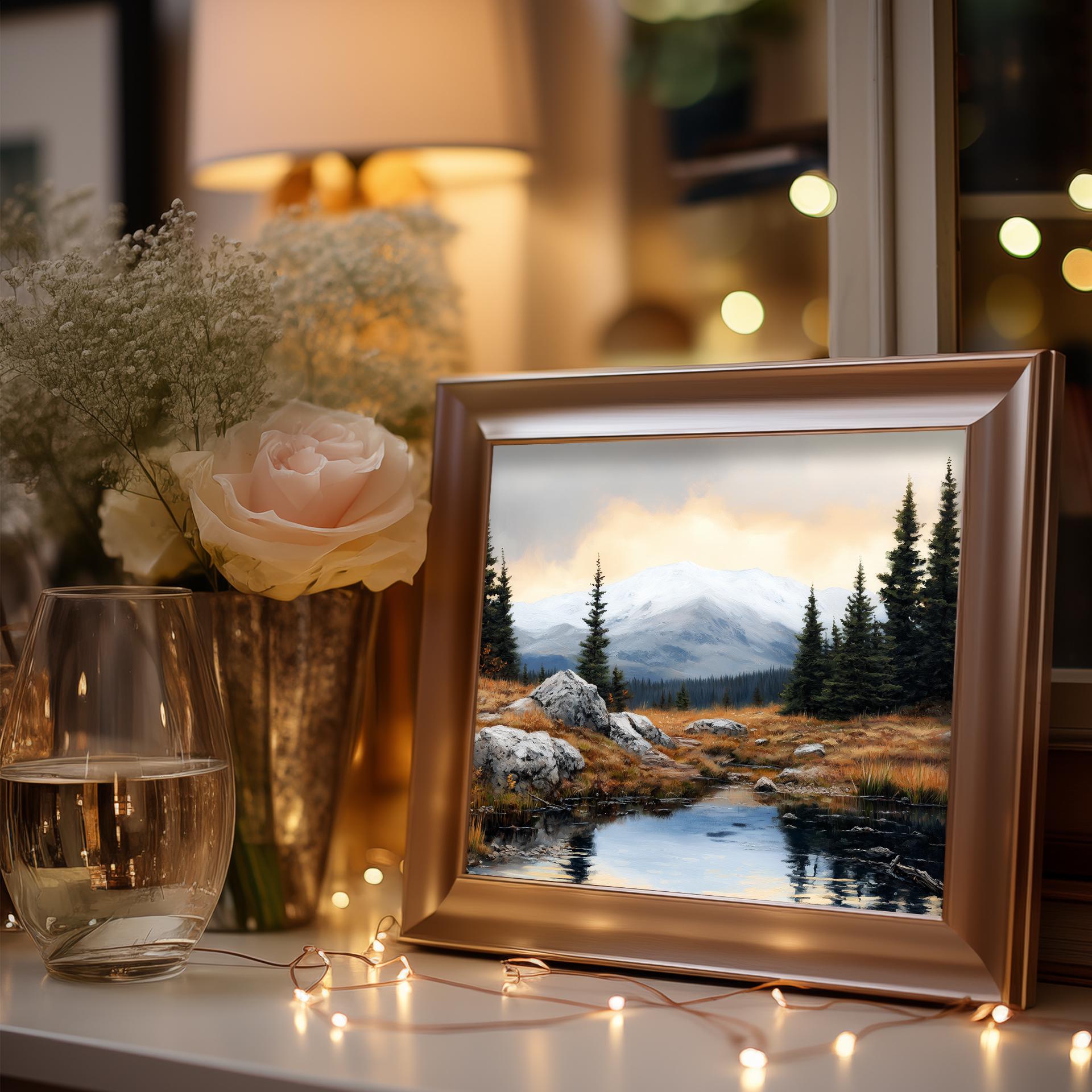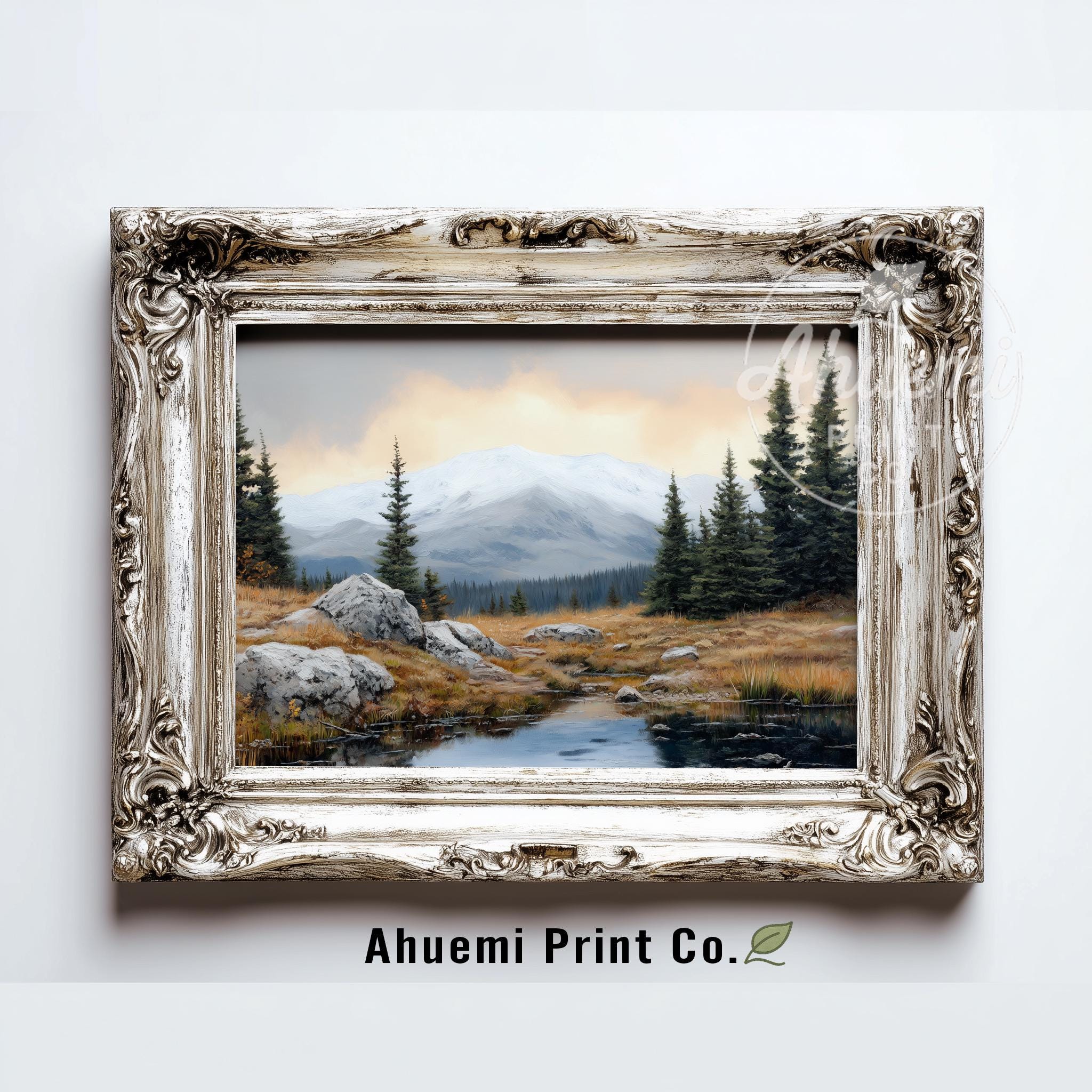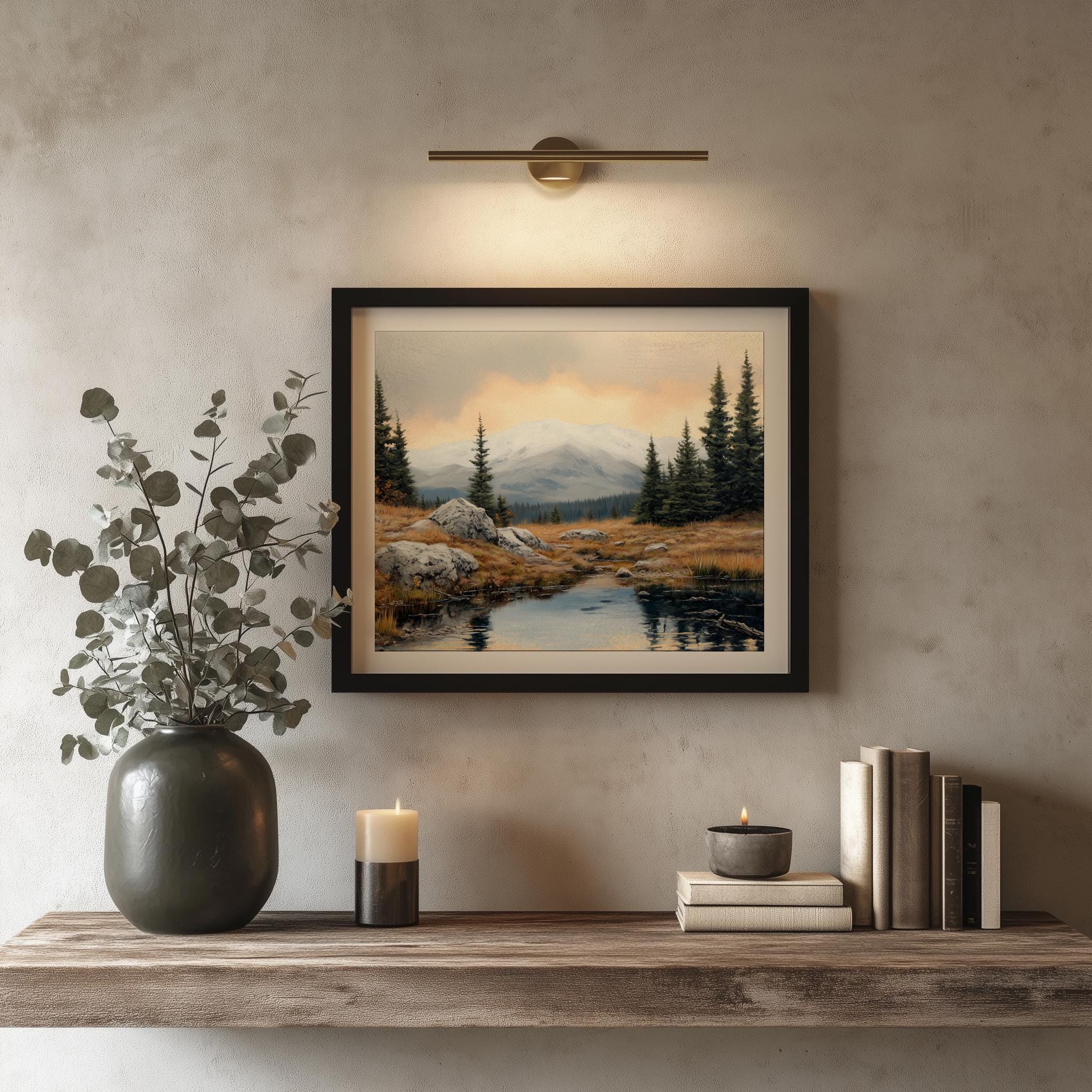 Immerse yourself in the charm with this painting of a serene mountain lake surrounded by evergreen forests and misty peaks. An instantly downloadable print, it's perfect for elevating your decor with budget-friendly charm. This gives you the flexibility to customize the size, frame, and material according to your personal taste and space, ensuring a perfect fit for your walls.