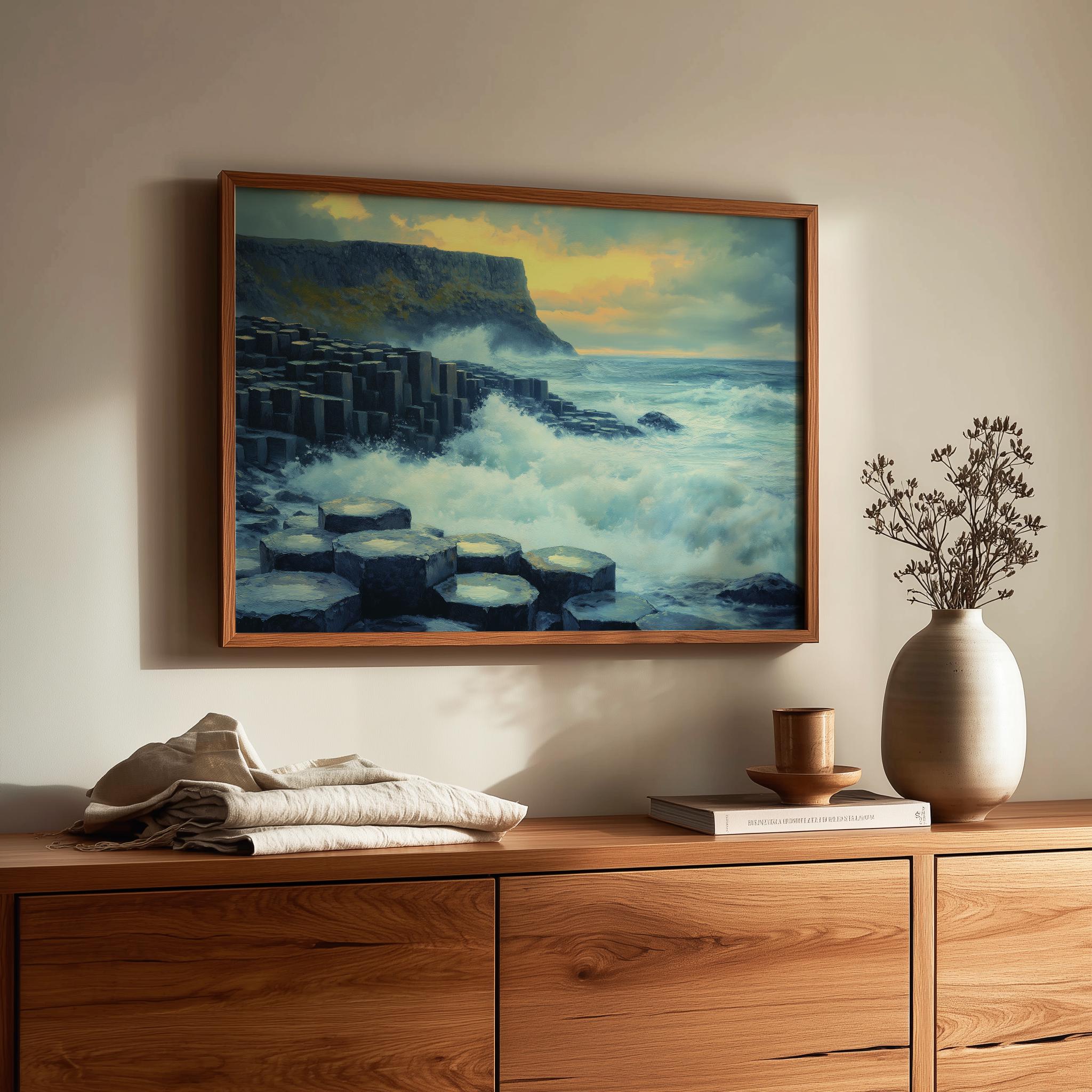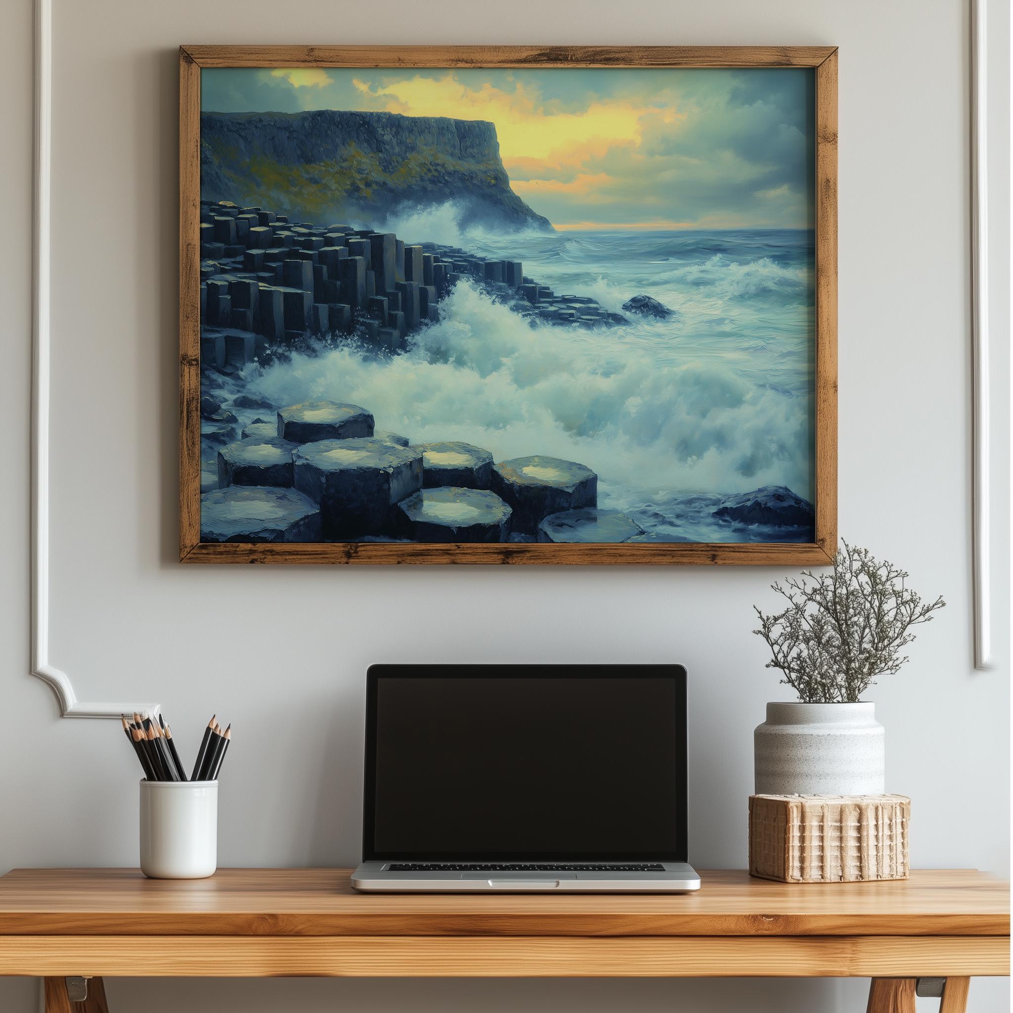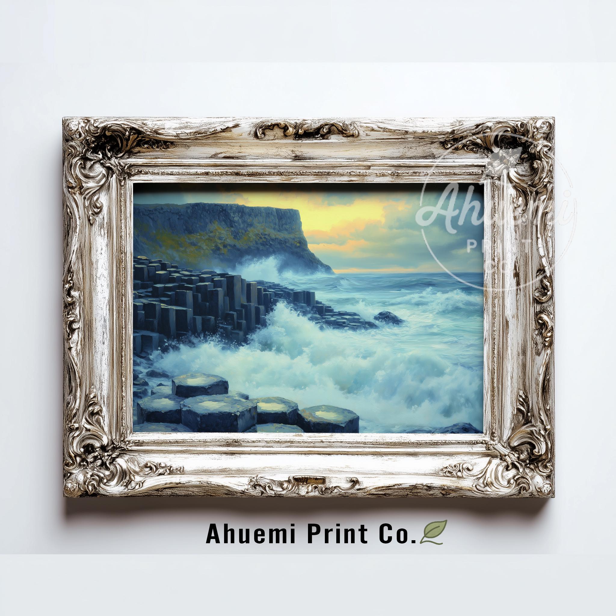 Immerse yourself in the charm with this painting of a dramatic seascape featuring the iconic basalt columns of the Giant's Causeway. An instantly downloadable print, it's perfect for elevating your decor with budget-friendly charm. This gives you the flexibility to customize the size, frame, and material according to your personal taste and space, ensuring a perfect fit for your walls.