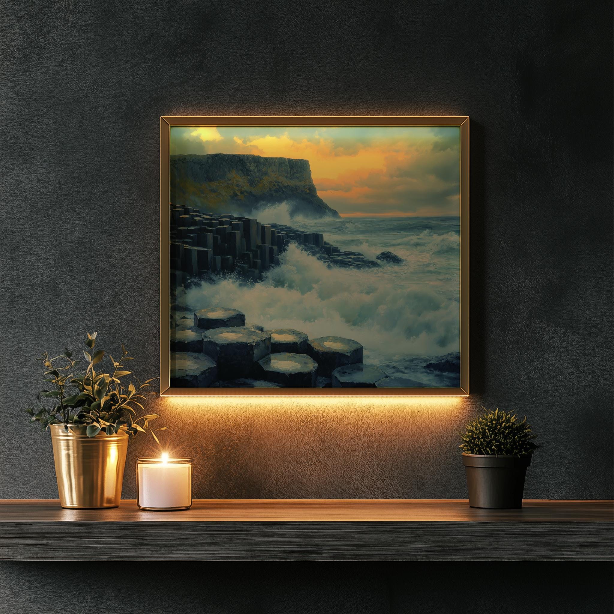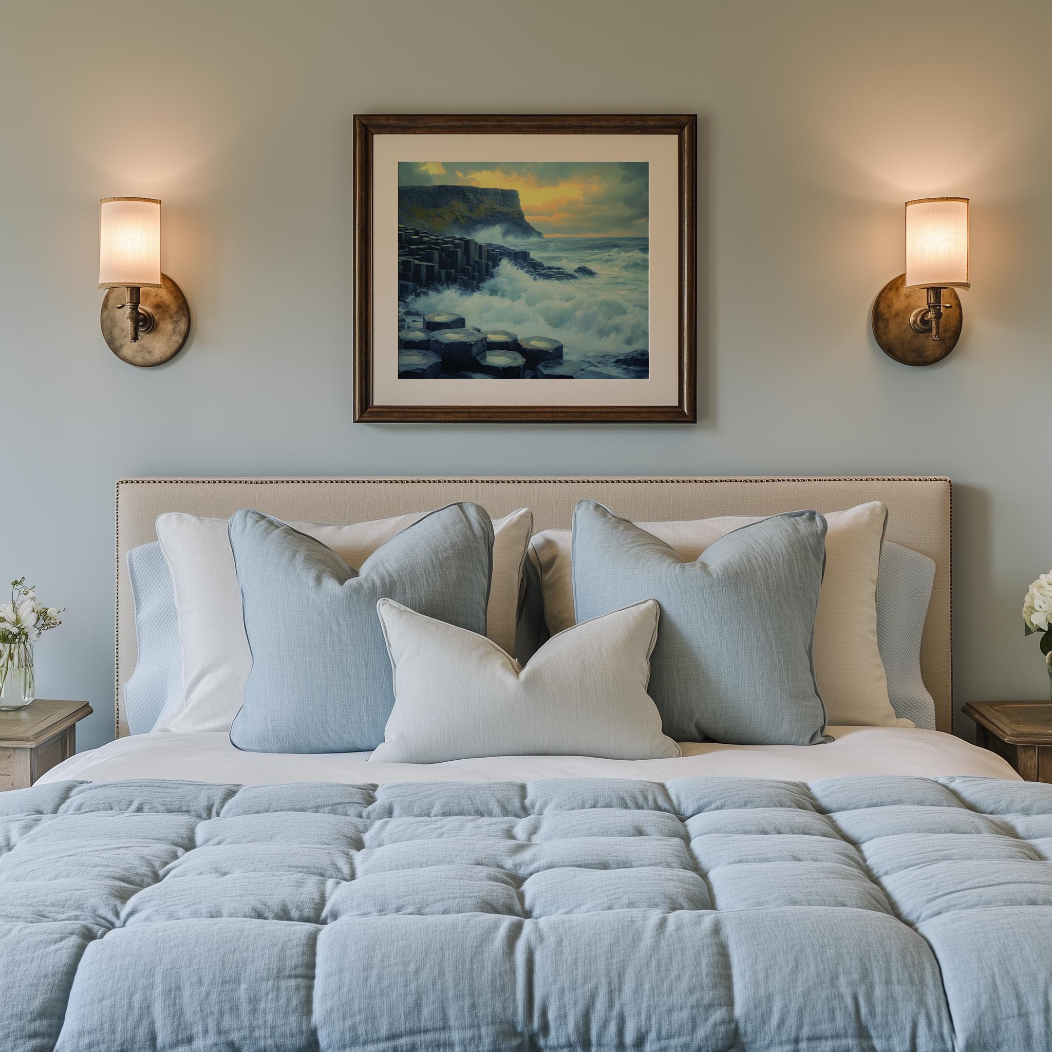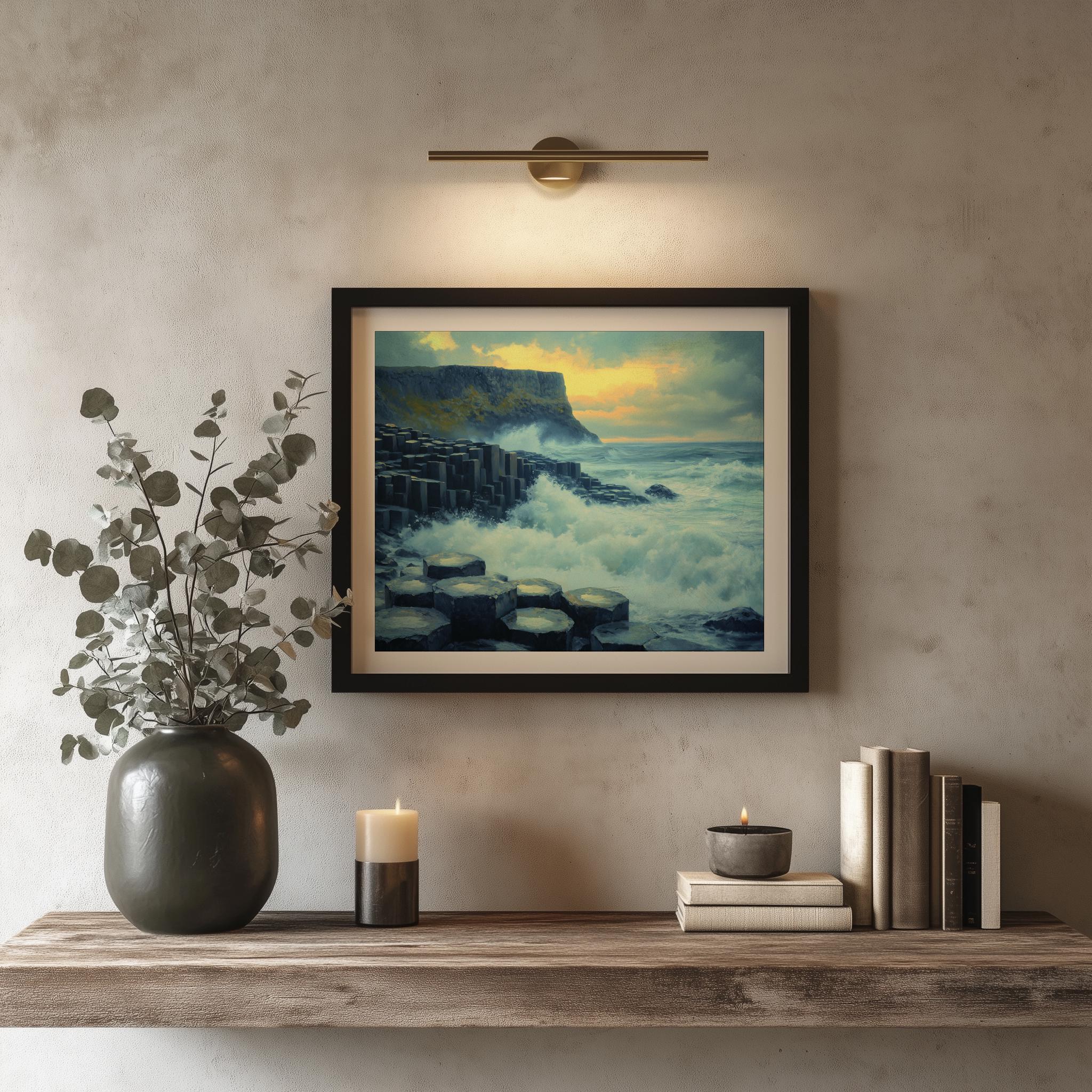 Immerse yourself in the charm with this painting of a dramatic seascape featuring the iconic basalt columns of the Giant's Causeway. An instantly downloadable print, it's perfect for elevating your decor with budget-friendly charm. This gives you the flexibility to customize the size, frame, and material according to your personal taste and space, ensuring a perfect fit for your walls.