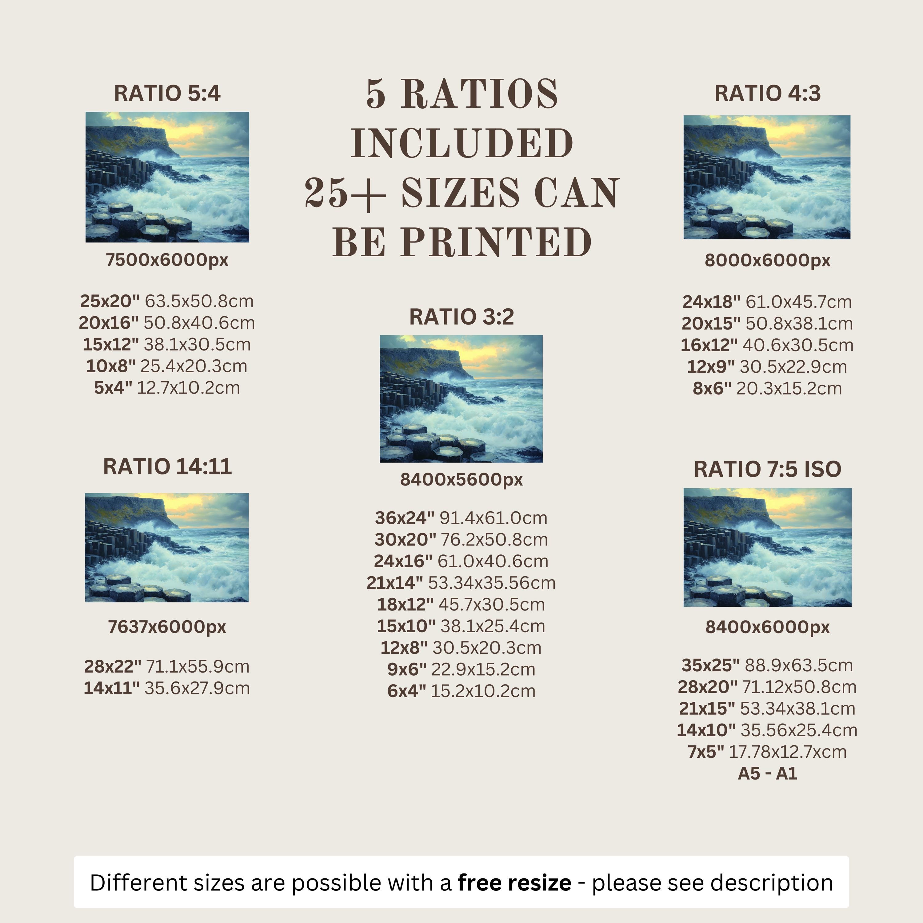 Each artwork includes 5 aspect ratios with 25+ print sizes. Most standard frames are covered. One custom resize per purchase available—message before ordering.
