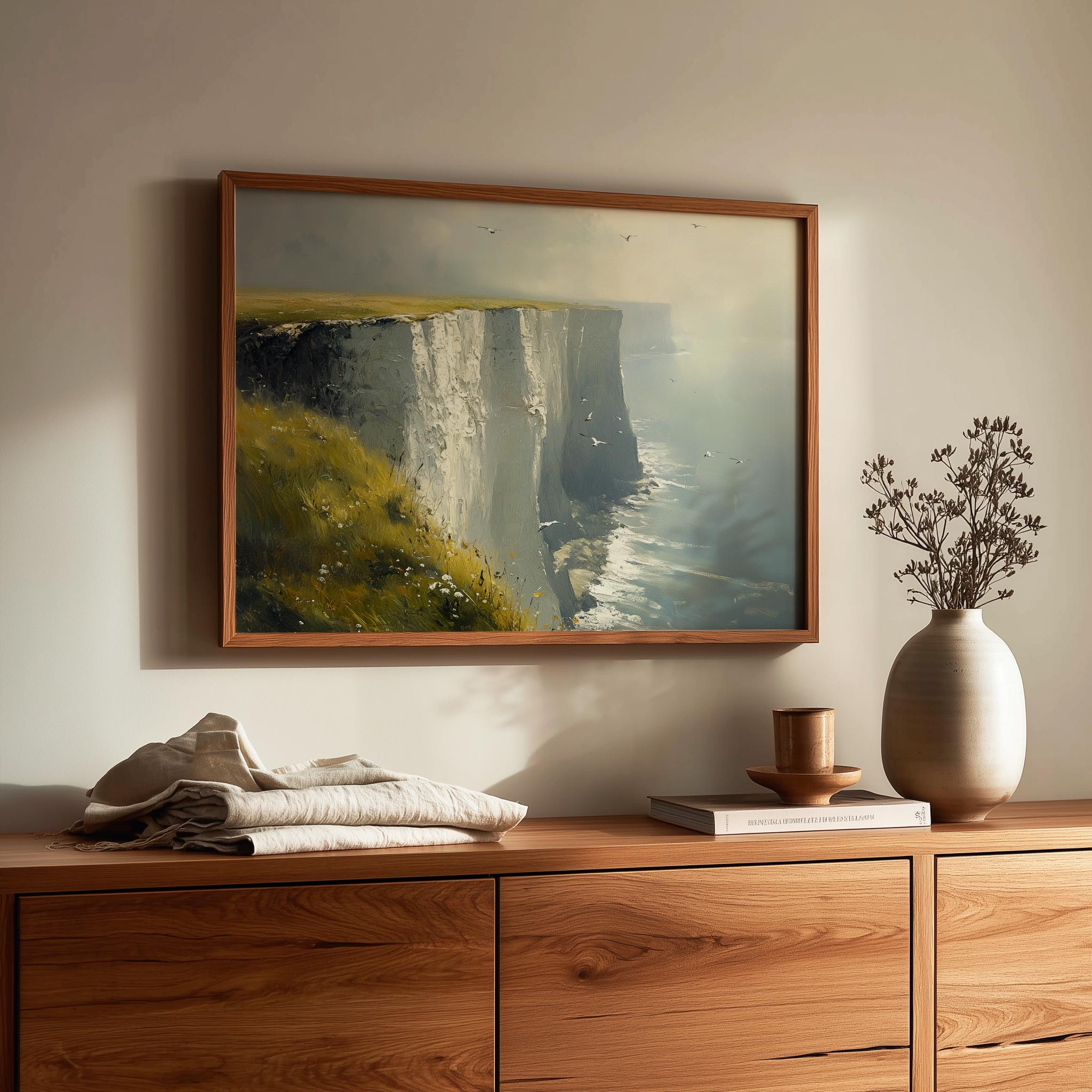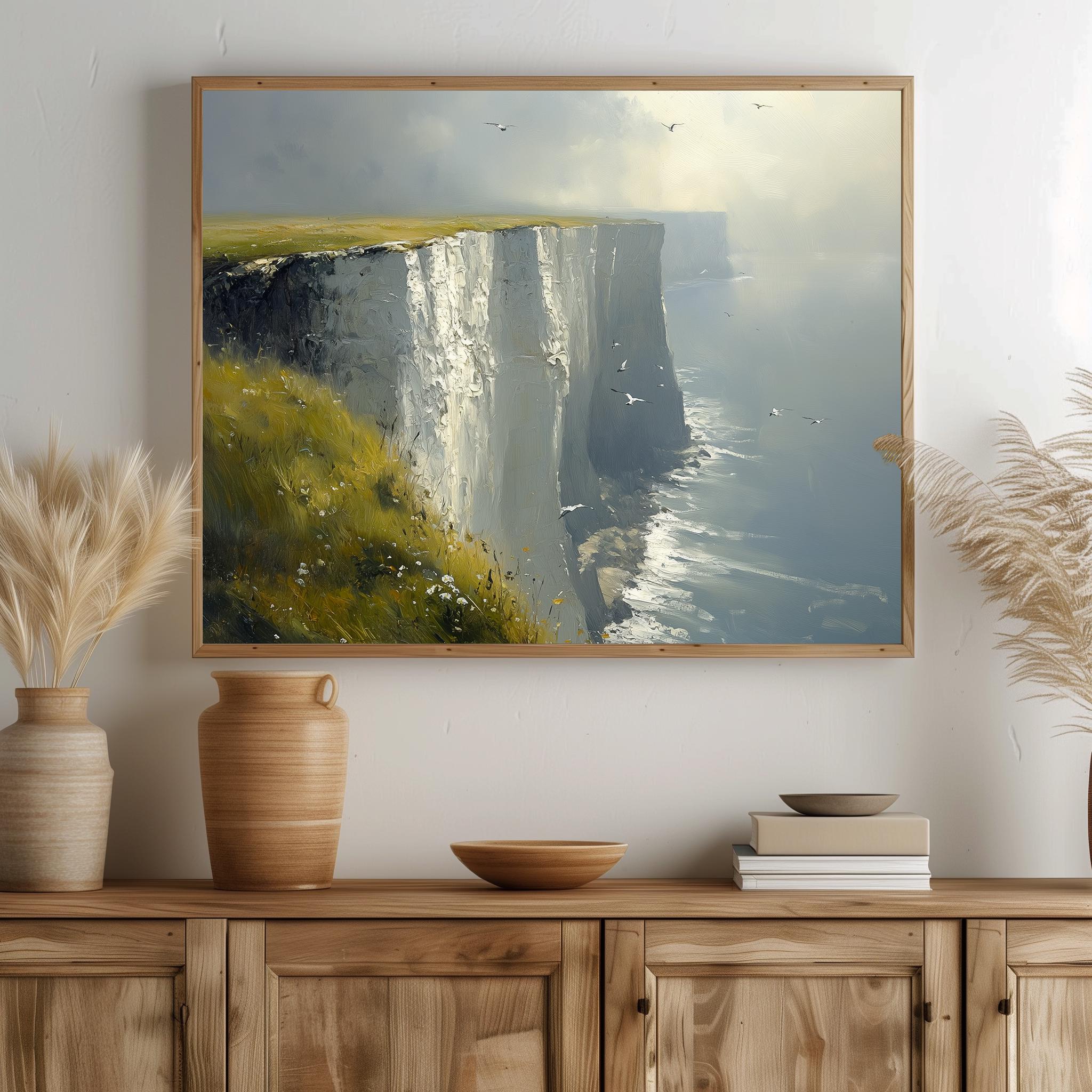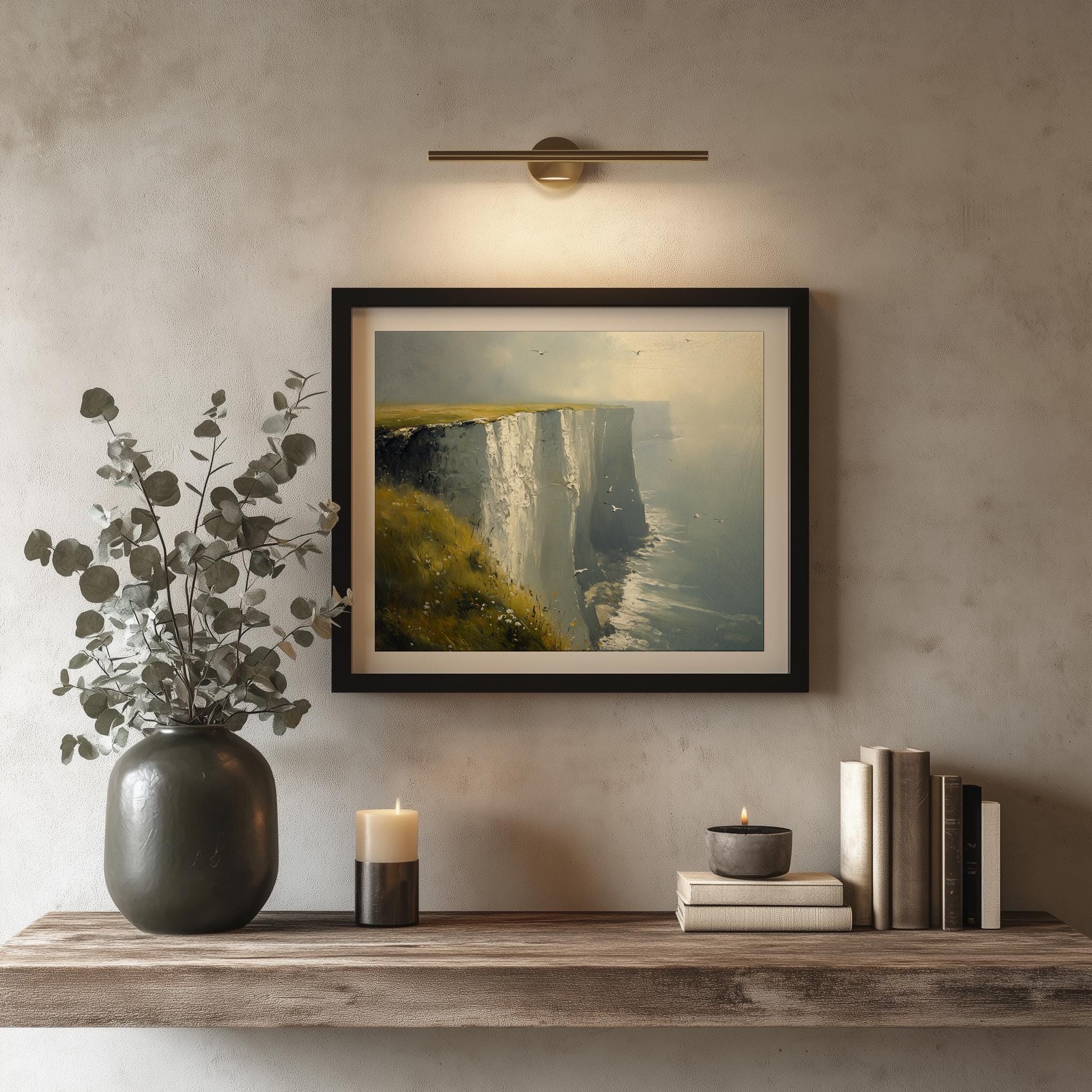 Immerse yourself in the charm with this painting of a moody seascape featuring the iconic White Cliffs of Dover. An instantly downloadable print, it's perfect for elevating your decor with budget-friendly charm. This gives you the flexibility to customize the size, frame, and material according to your personal taste and space, ensuring a perfect fit for your walls.
