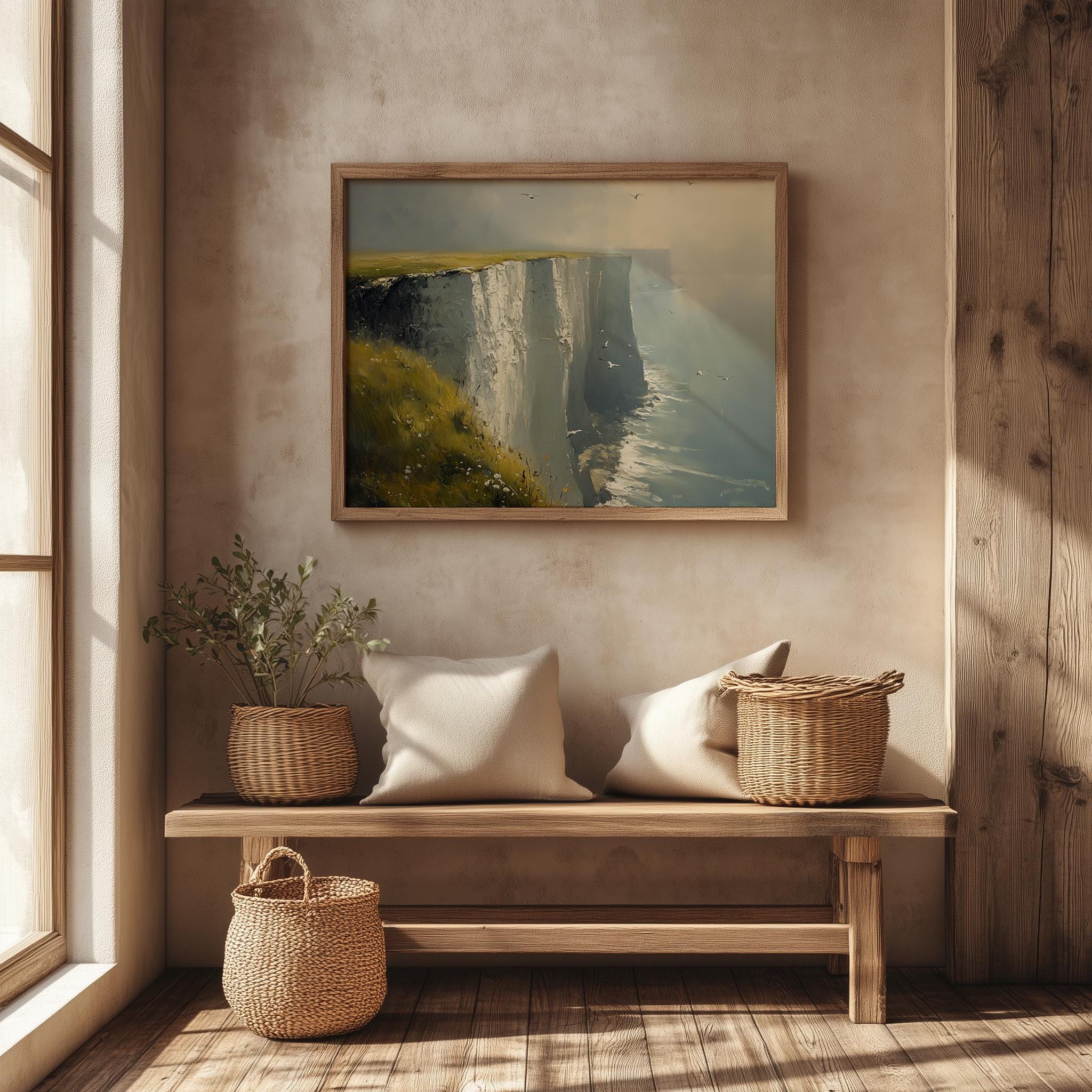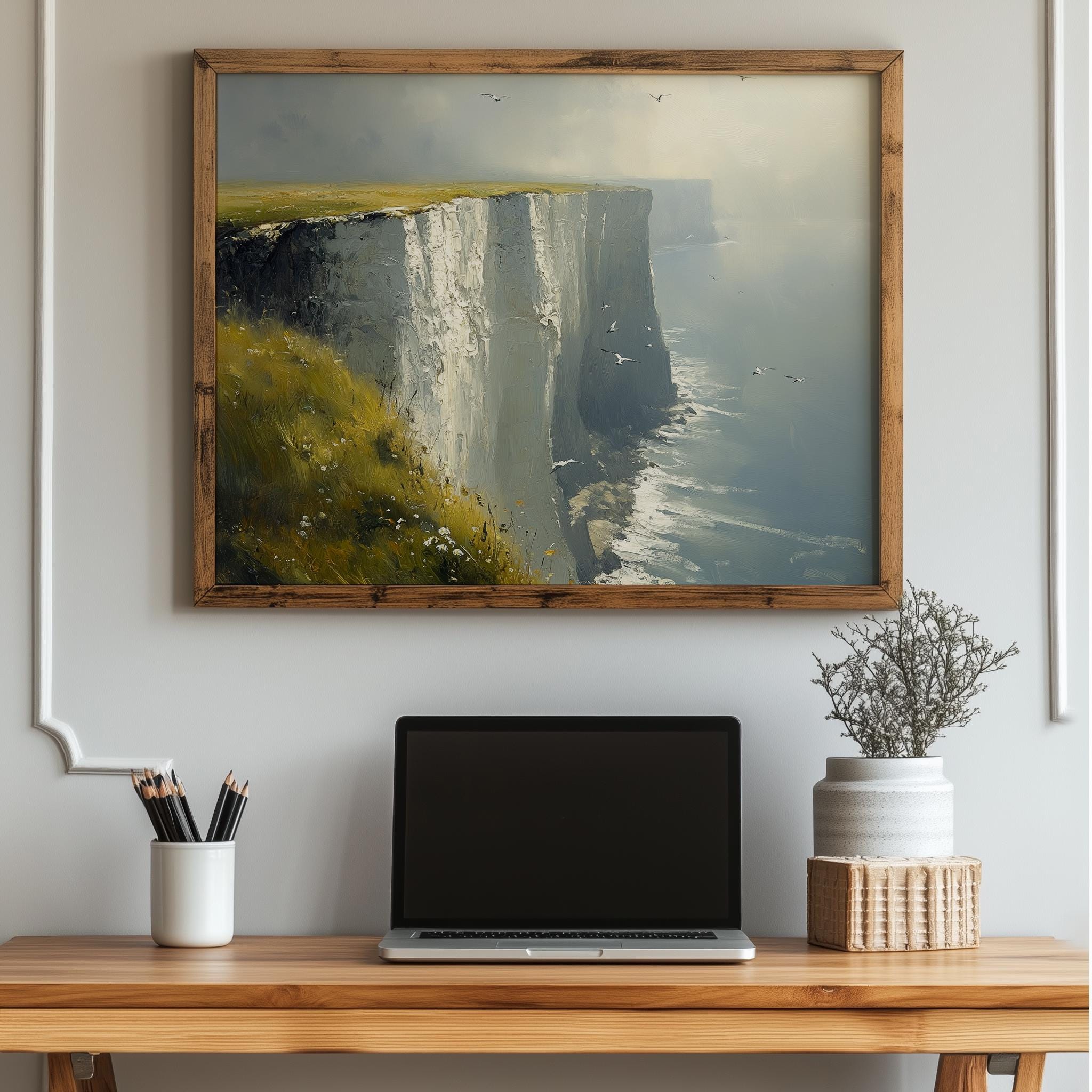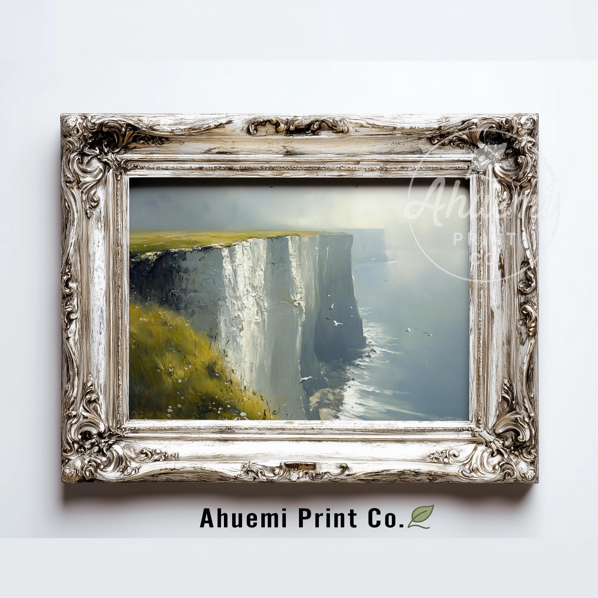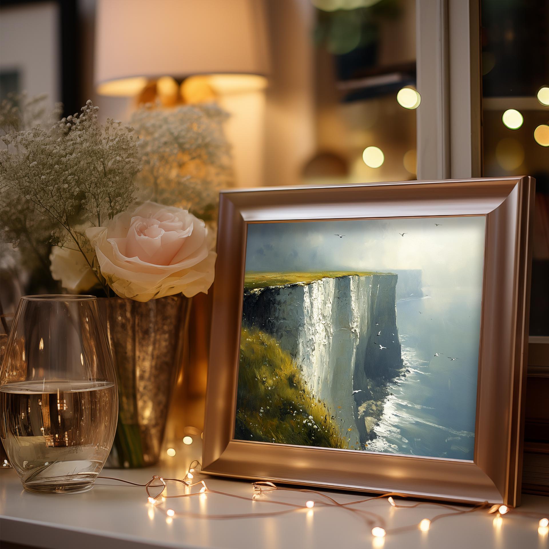 Immerse yourself in the charm with this painting of a moody seascape featuring the iconic White Cliffs of Dover. An instantly downloadable print, it's perfect for elevating your decor with budget-friendly charm. This gives you the flexibility to customize the size, frame, and material according to your personal taste and space, ensuring a perfect fit for your walls.
