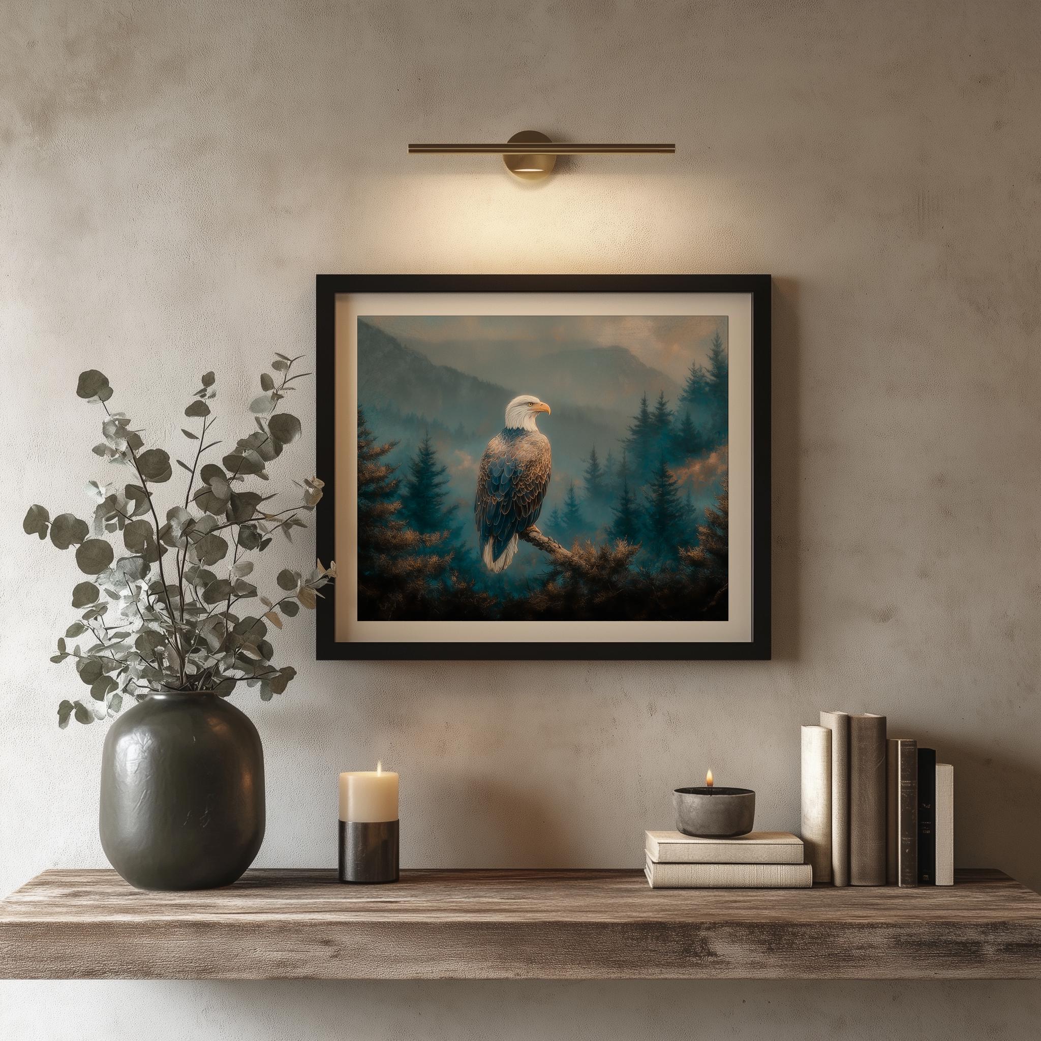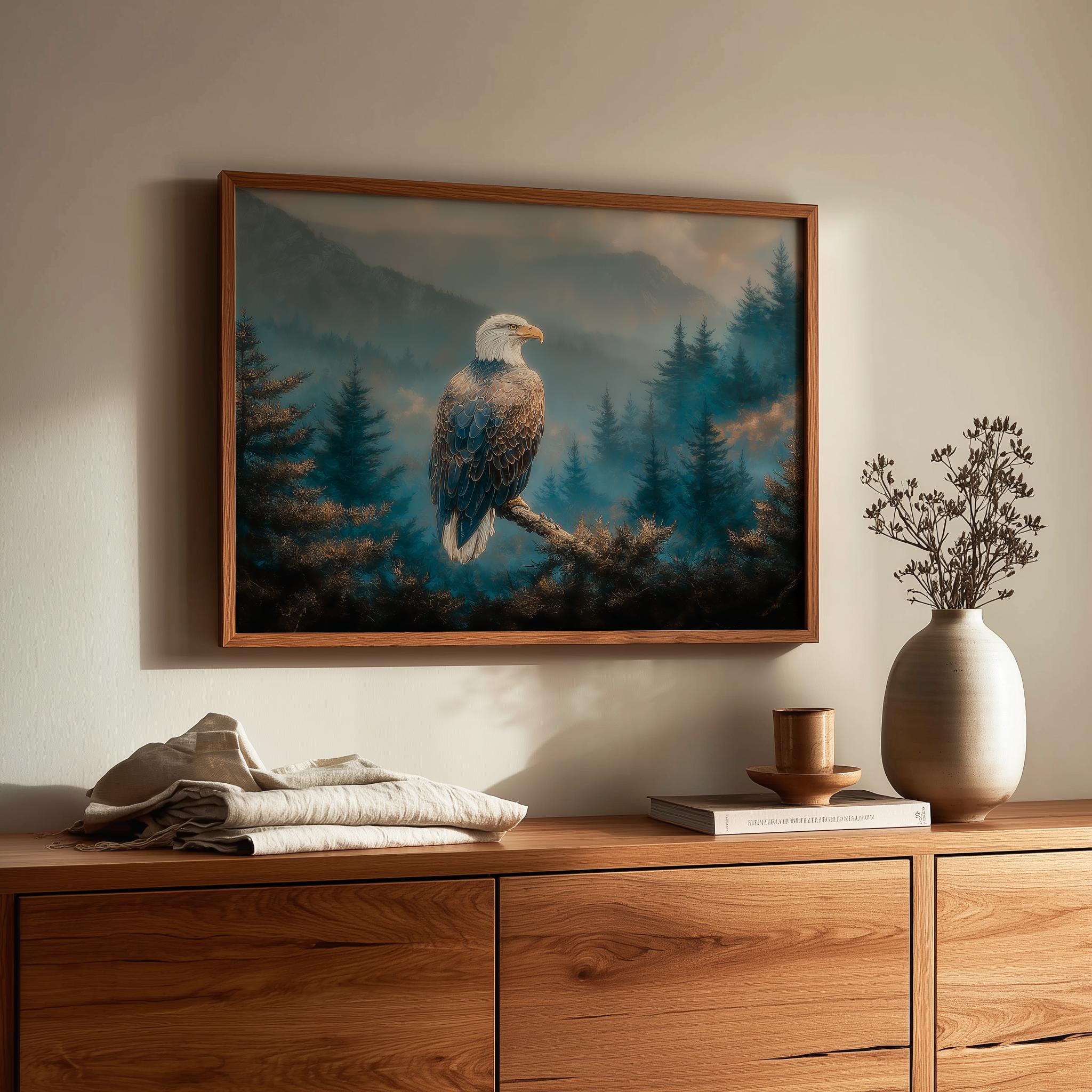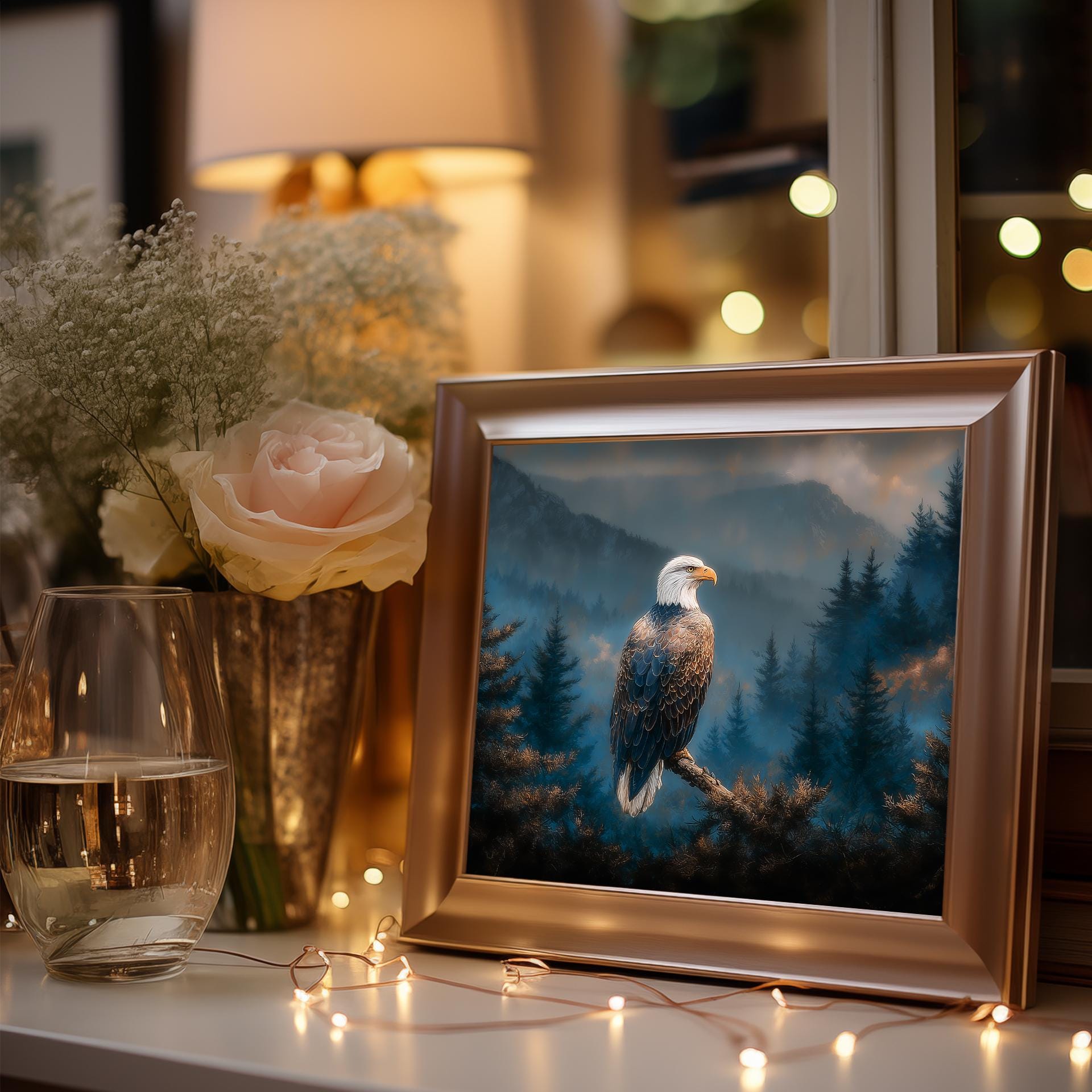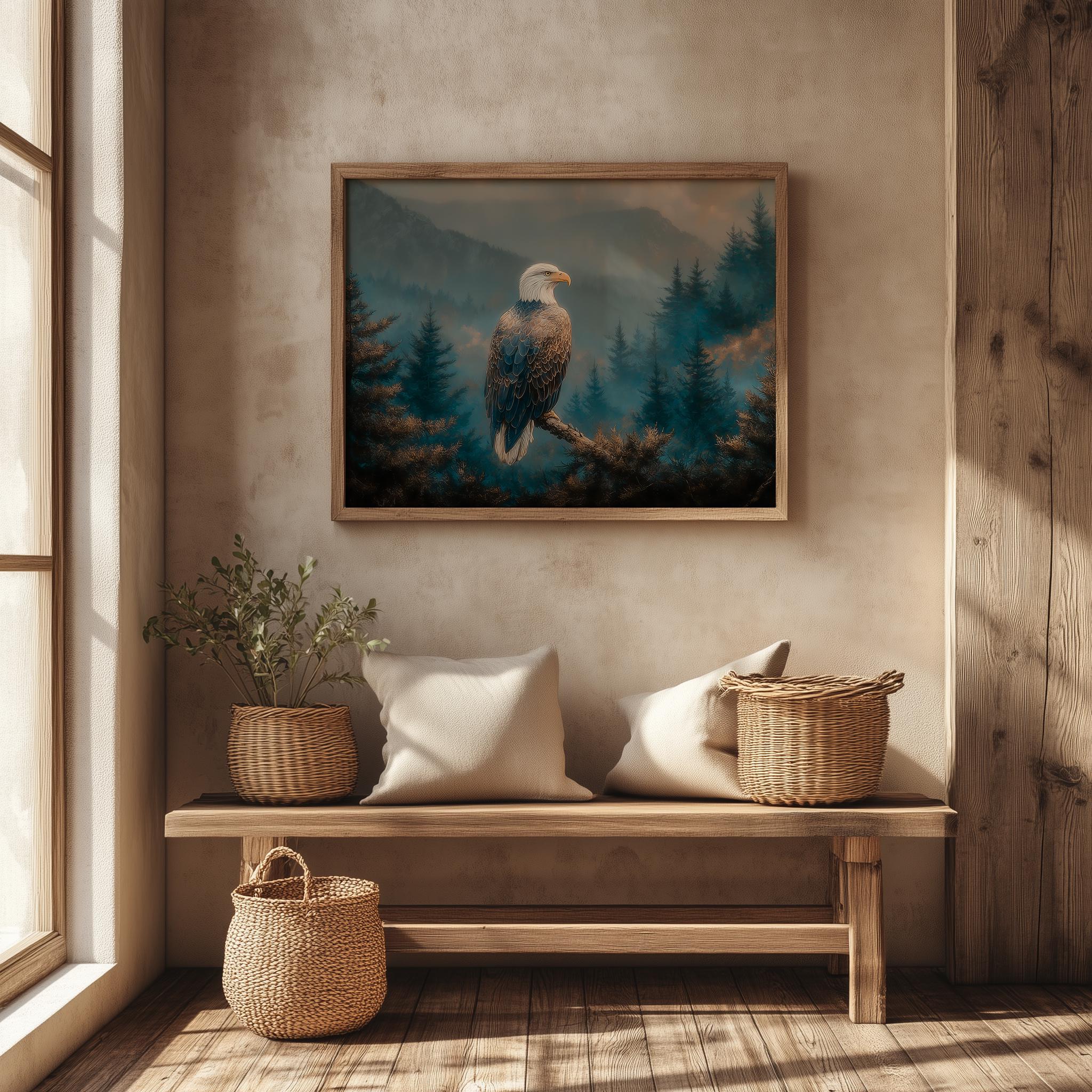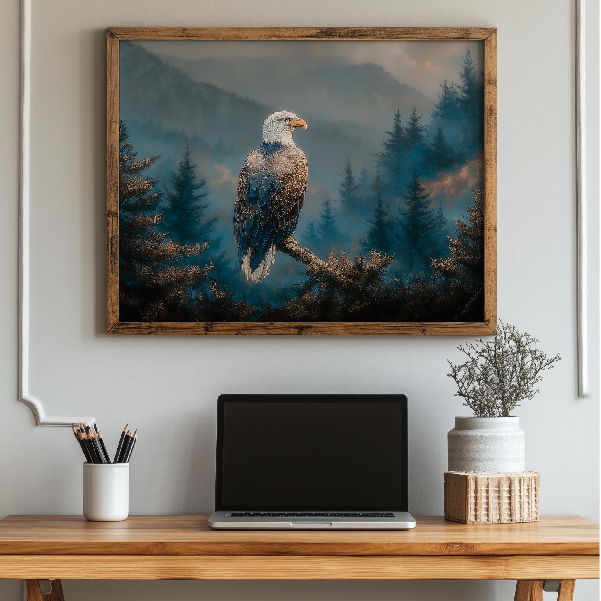 Immerse yourself in the charm with this painting of a majestic bald eagle soaring over a tranquil winter landscape. An instantly downloadable print, it's perfect for elevating your decor with budget-friendly charm. This gives you the flexibility to customize the size, frame, and material according to your personal taste and space, ensuring a perfect fit for your walls.