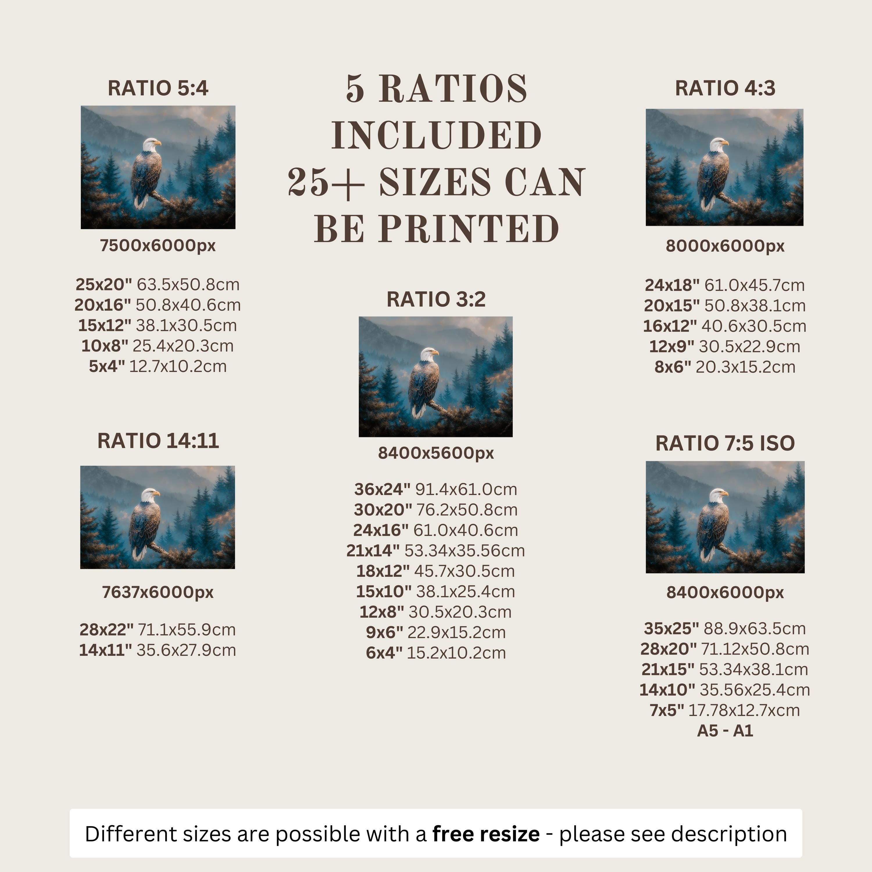 Each artwork includes 5 aspect ratios with 25+ print sizes. Most standard frames are covered. One custom resize per purchase available—message before ordering.