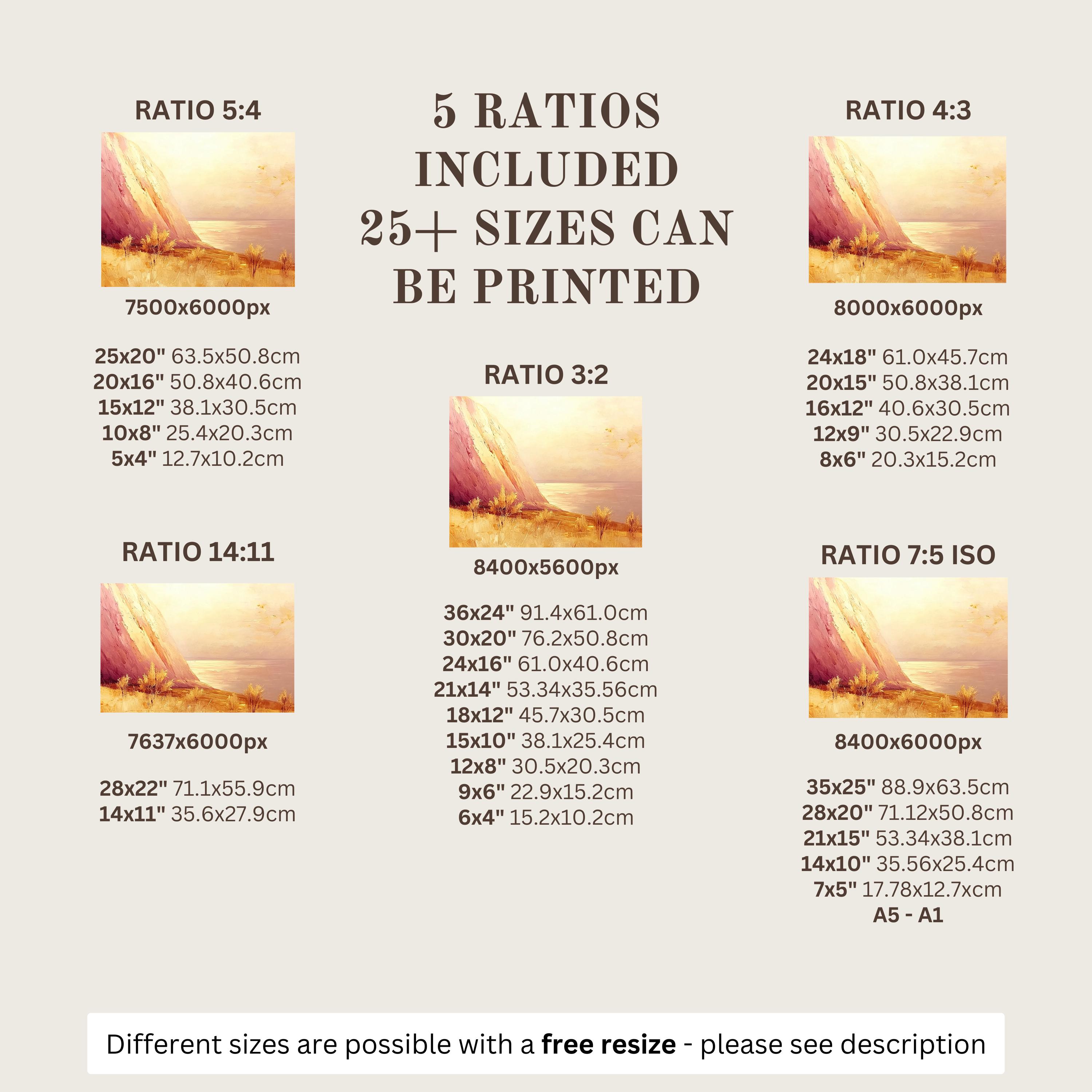 Each artwork includes 5 aspect ratios with 25+ print sizes. Most standard frames are covered. One custom resize per purchase available—message before ordering.