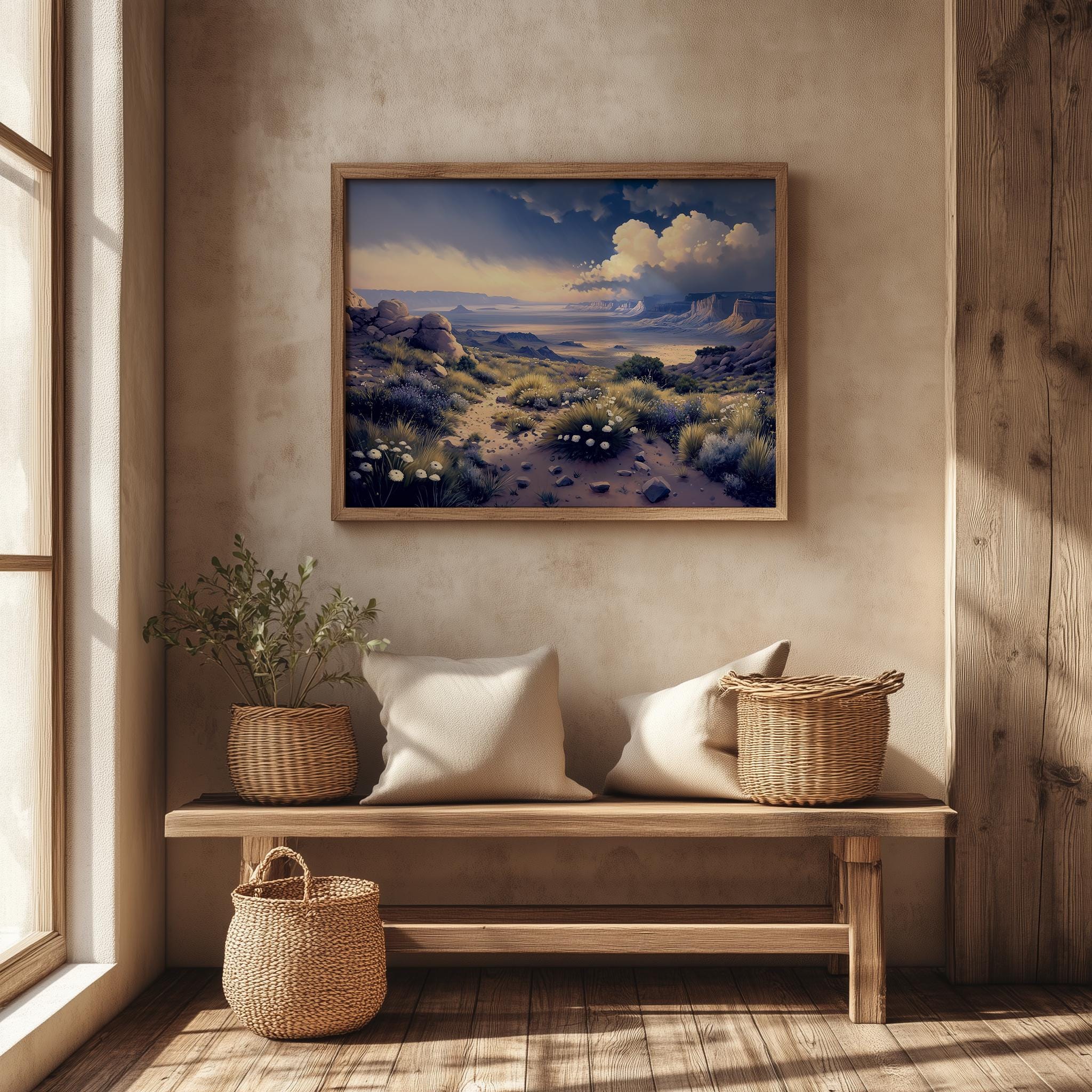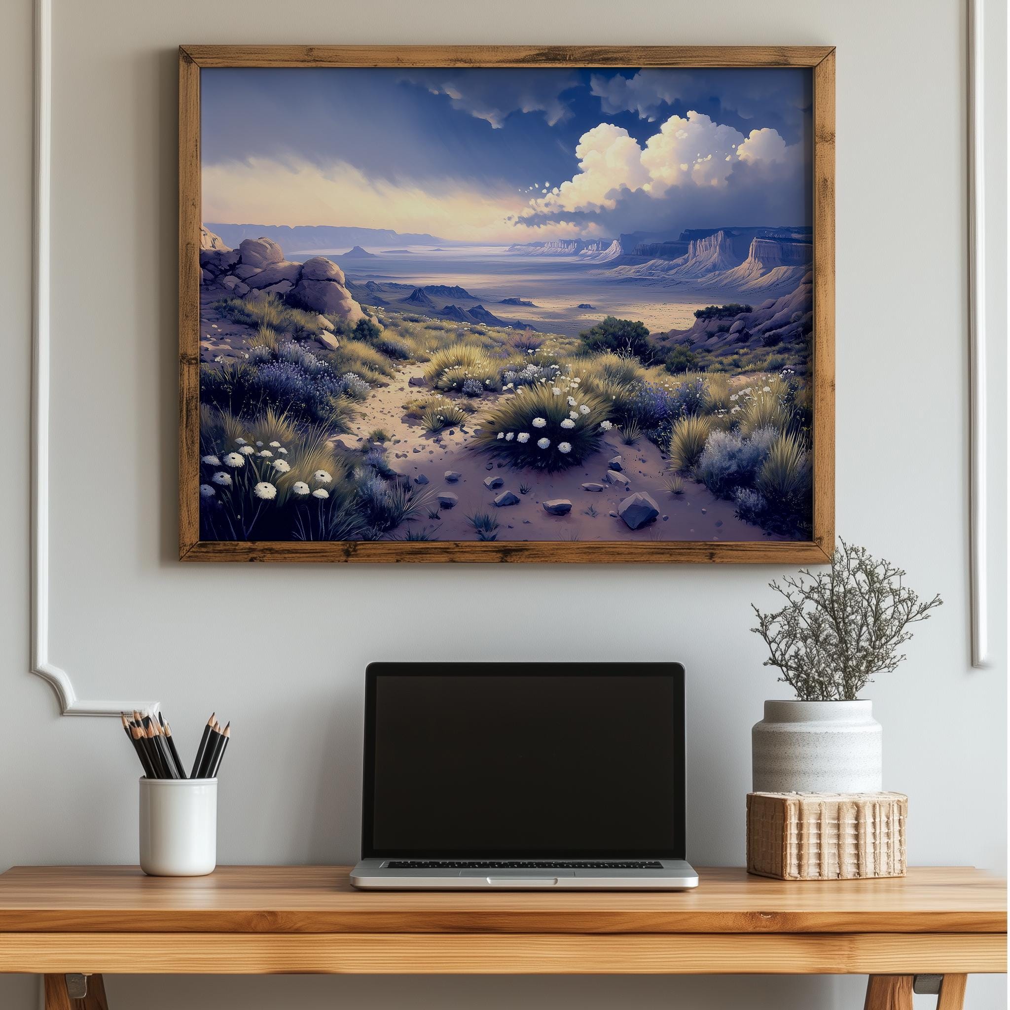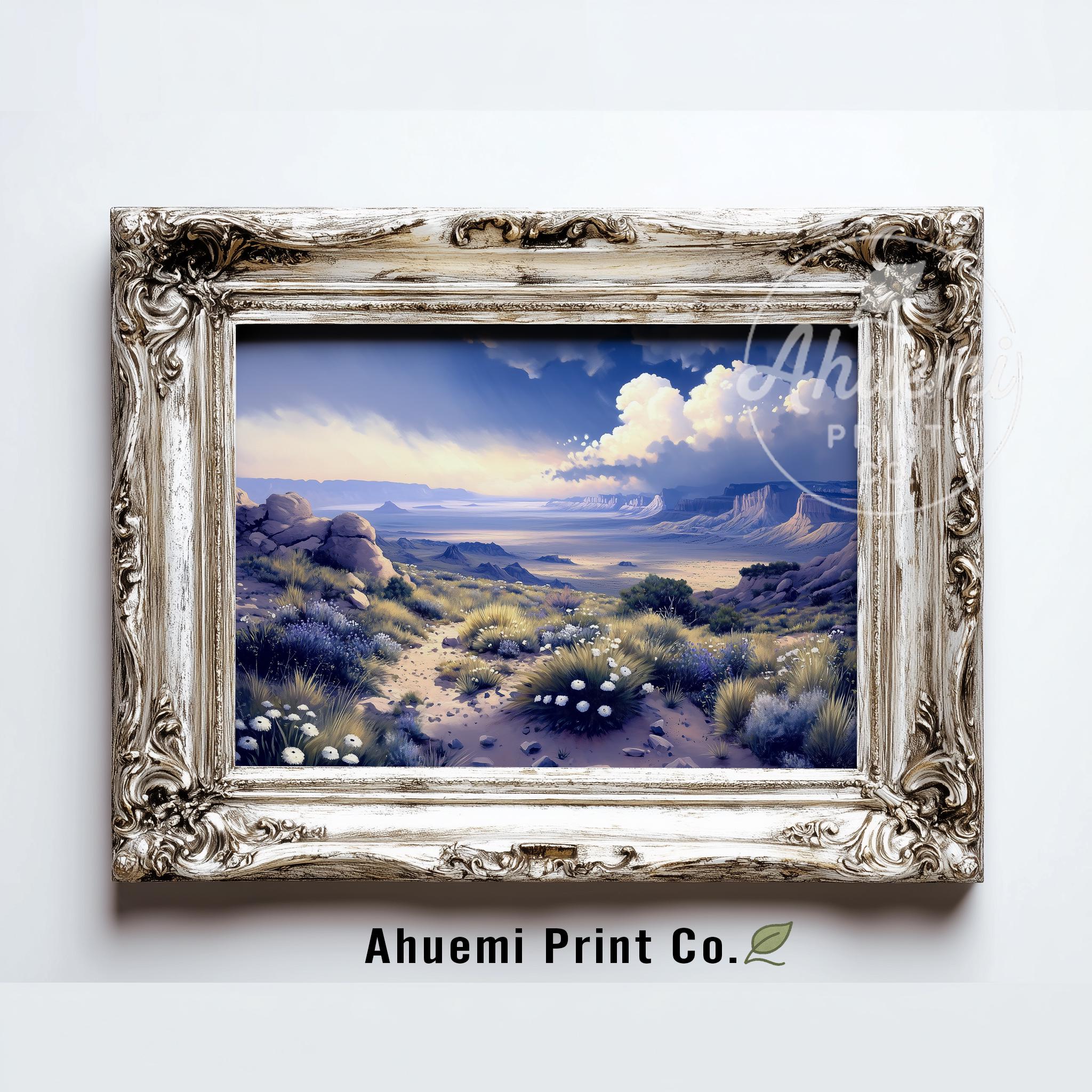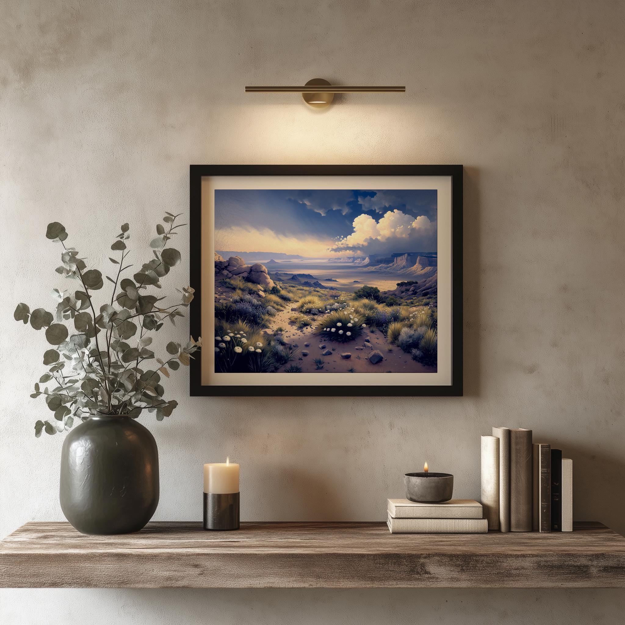Immerse yourself in the charm with this painting of a dramatic desert landscape. An instantly downloadable print, it's perfect for elevating your decor with budget-friendly charm. This gives you the flexibility to customize the size, frame, and material according to your personal taste and space, ensuring a perfect fit for your walls.