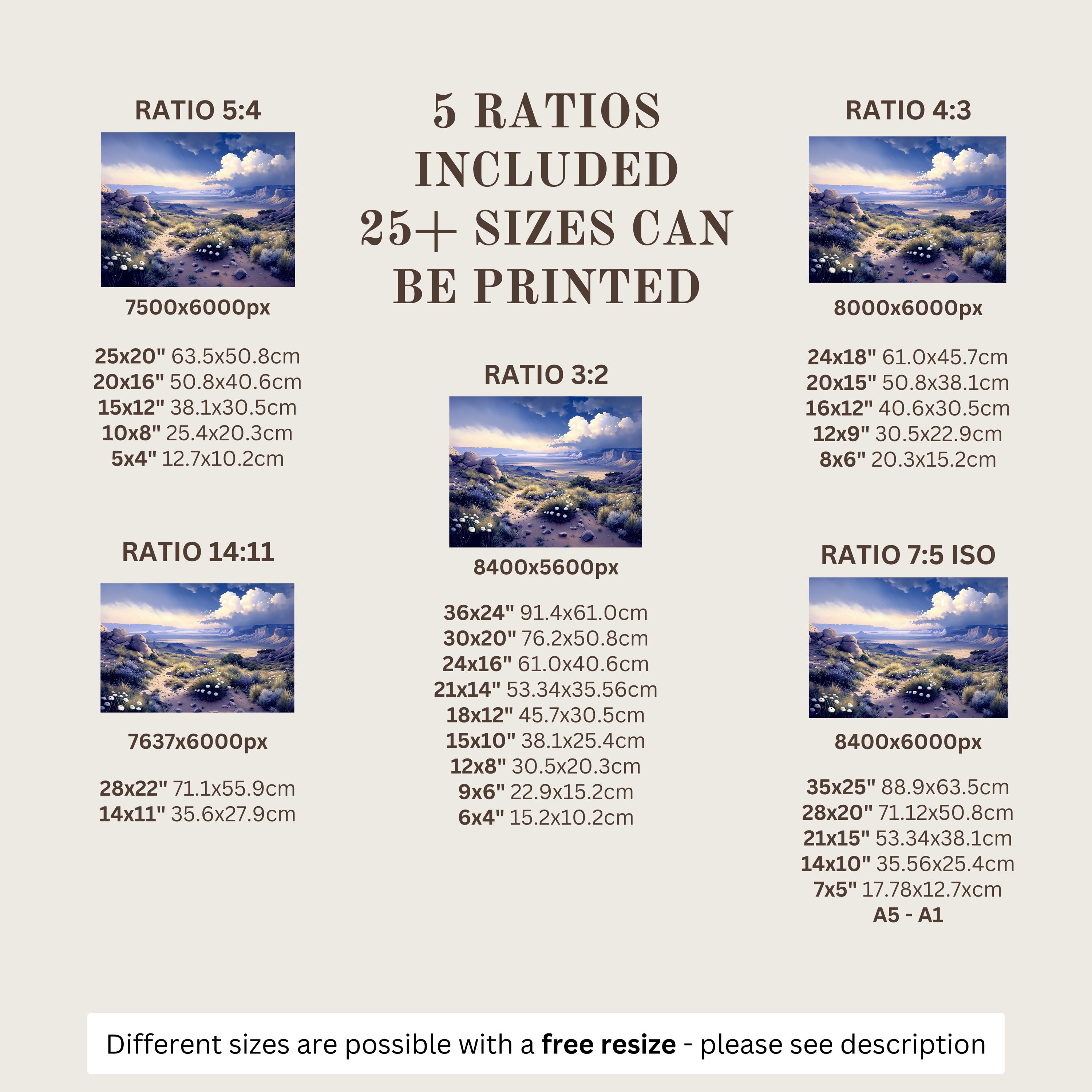 Each artwork includes 5 aspect ratios with 25+ print sizes. Most standard frames are covered. One custom resize per purchase available—message before ordering.