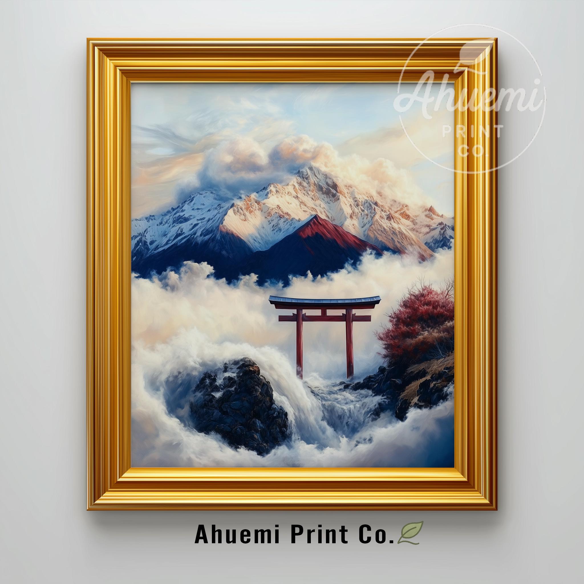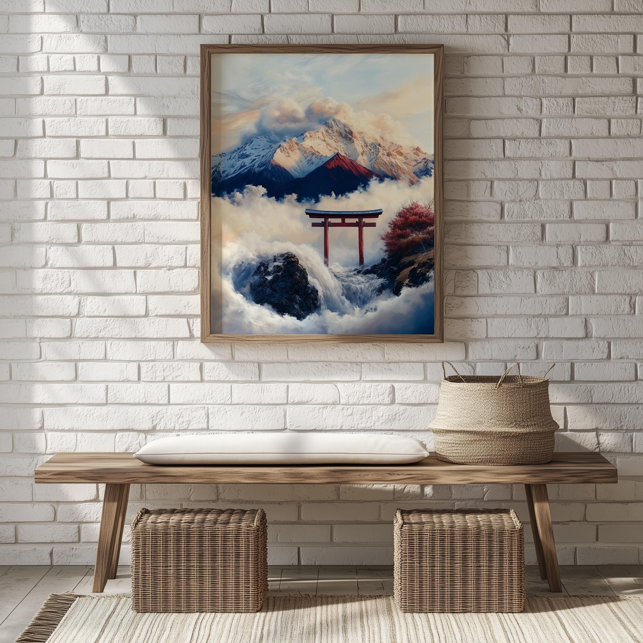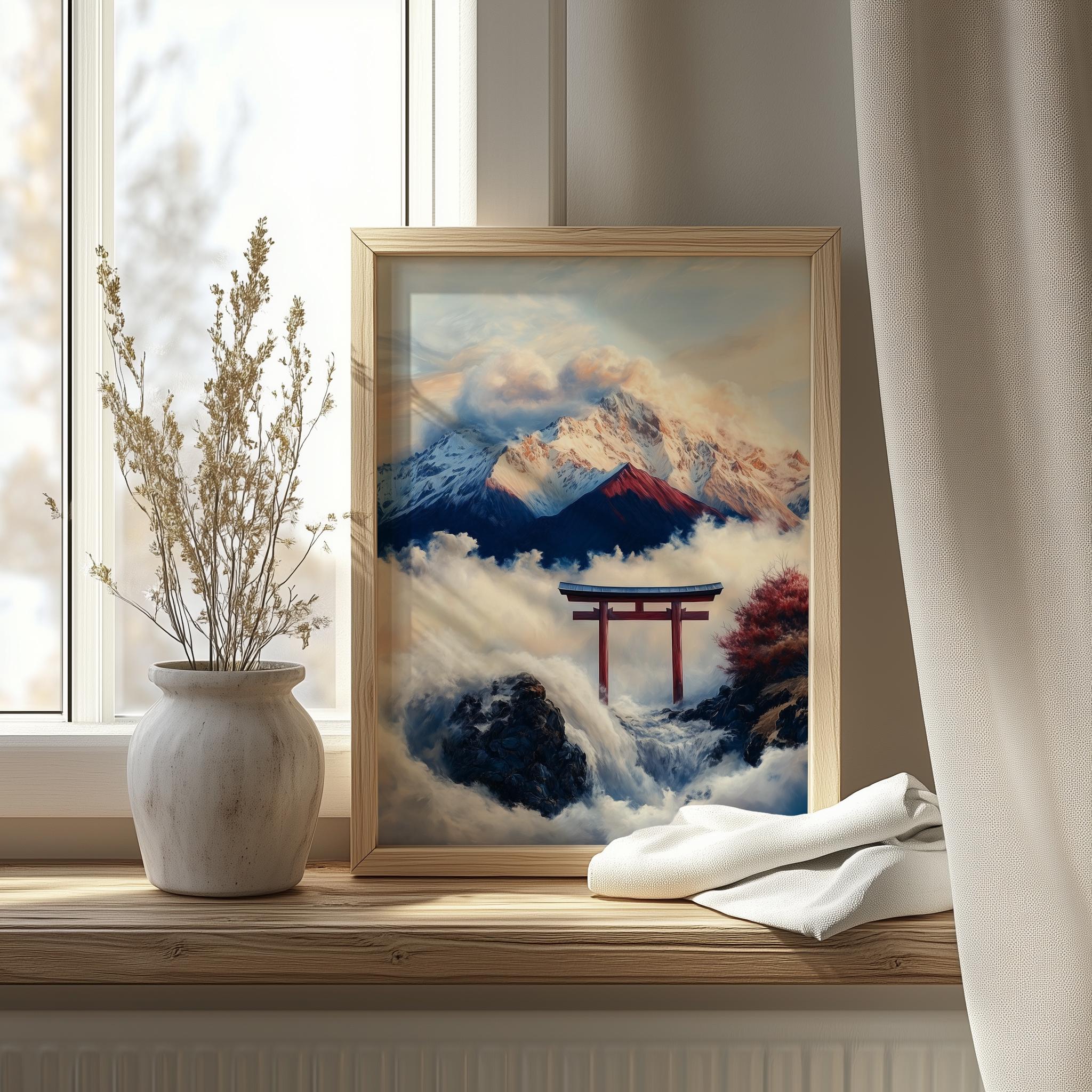 Immerse yourself in the charm of this painting of a solitary Shinto torii gate silhouetted against a vibrant sunset, surrounded by a tranquil cloudscape. An instantly downloadable print, it's perfect for elevating your decor with budget-friendly charm. This gives you the flexibility to customize the size, frame, and material according to your personal taste and space, ensuring a perfect fit for your walls.