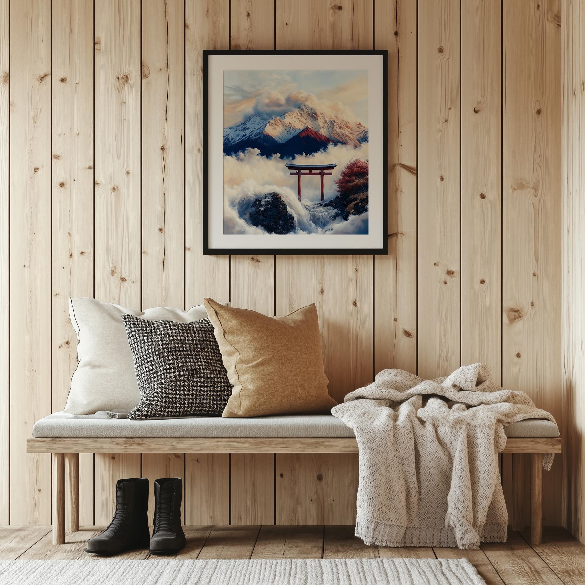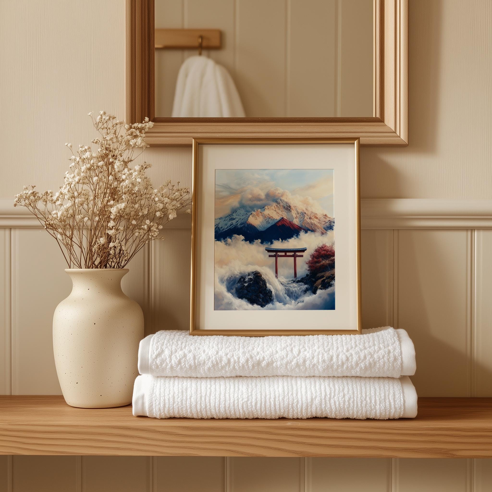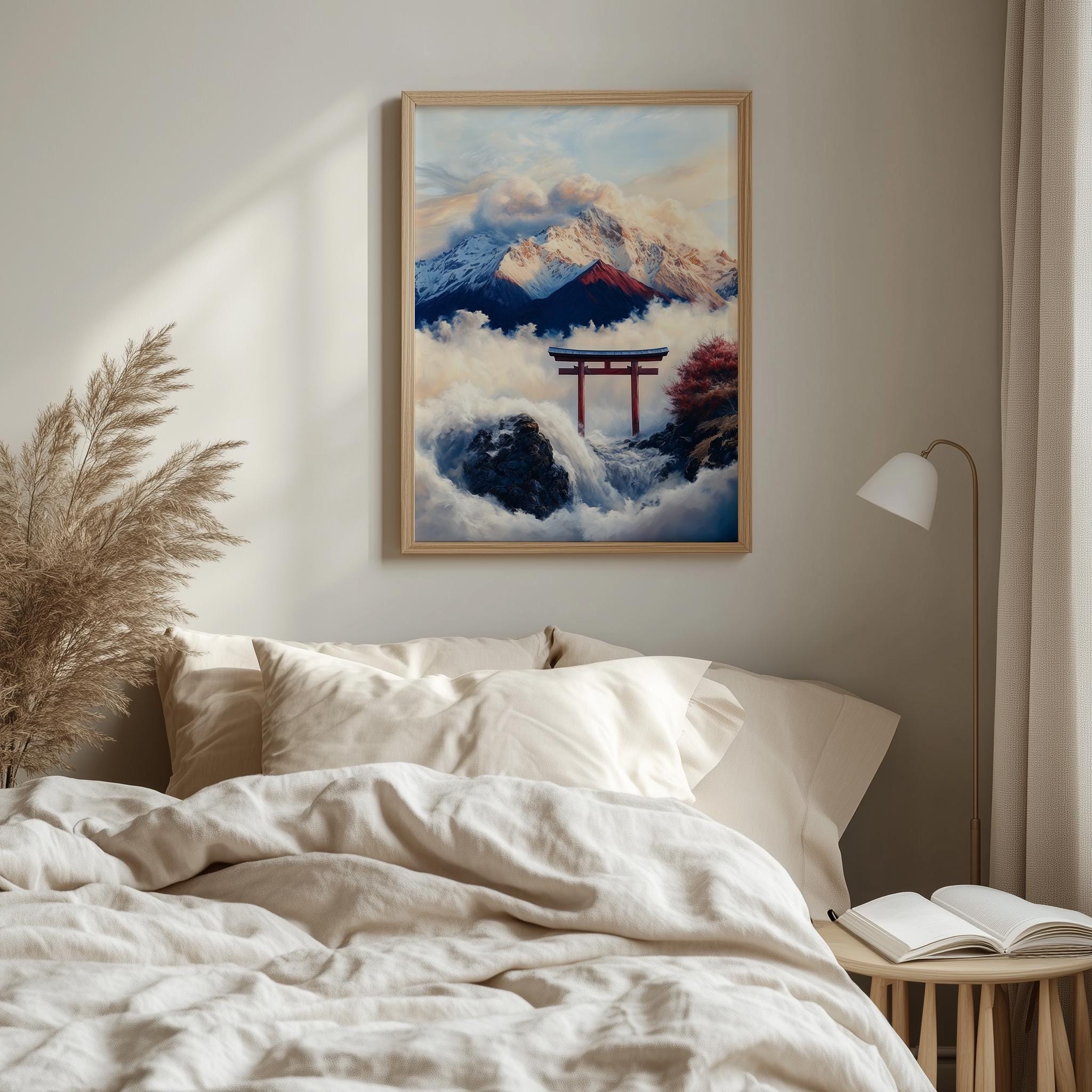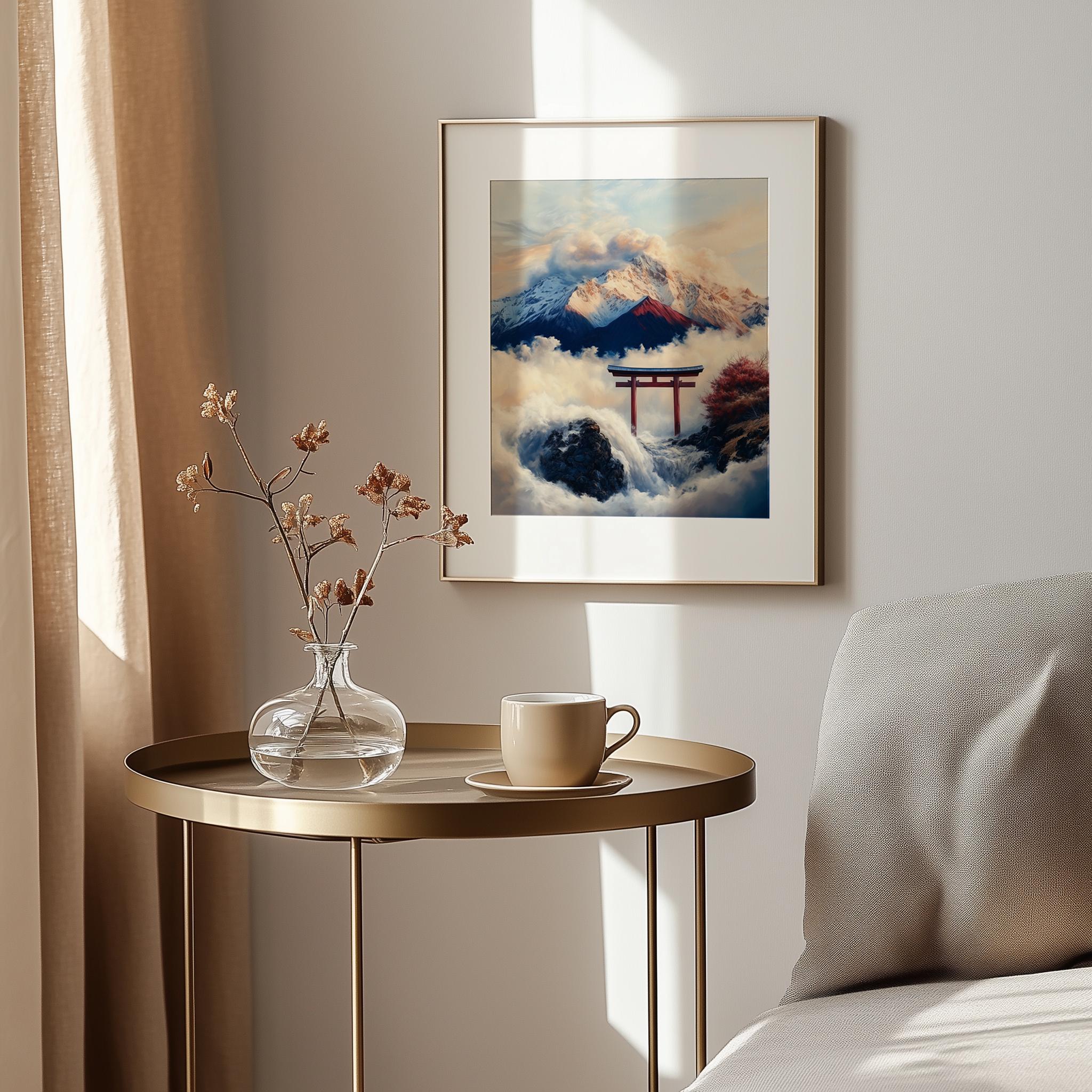 Immerse yourself in the charm of this painting of a solitary Shinto torii gate silhouetted against a vibrant sunset, surrounded by a tranquil cloudscape. An instantly downloadable print, it's perfect for elevating your decor with budget-friendly charm. This gives you the flexibility to customize the size, frame, and material according to your personal taste and space, ensuring a perfect fit for your walls.