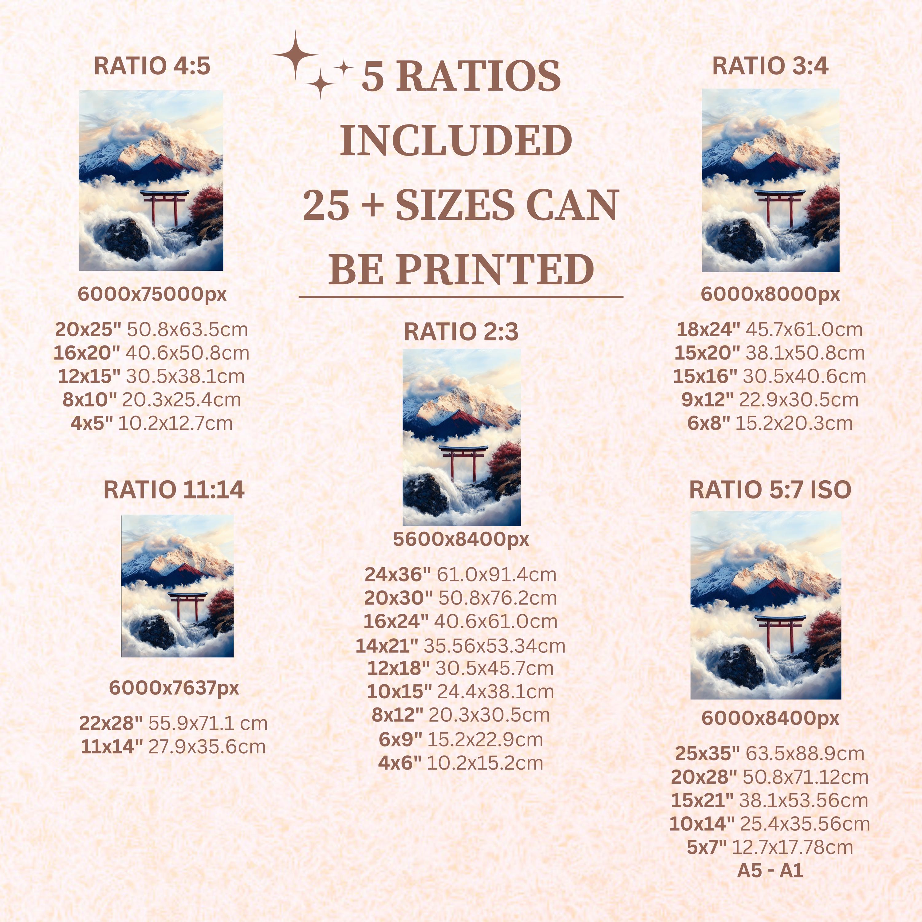 Each artwork includes 5 aspect ratios with 25+ print sizes. Most standard frames are covered. One custom resize per purchase available—message before ordering.