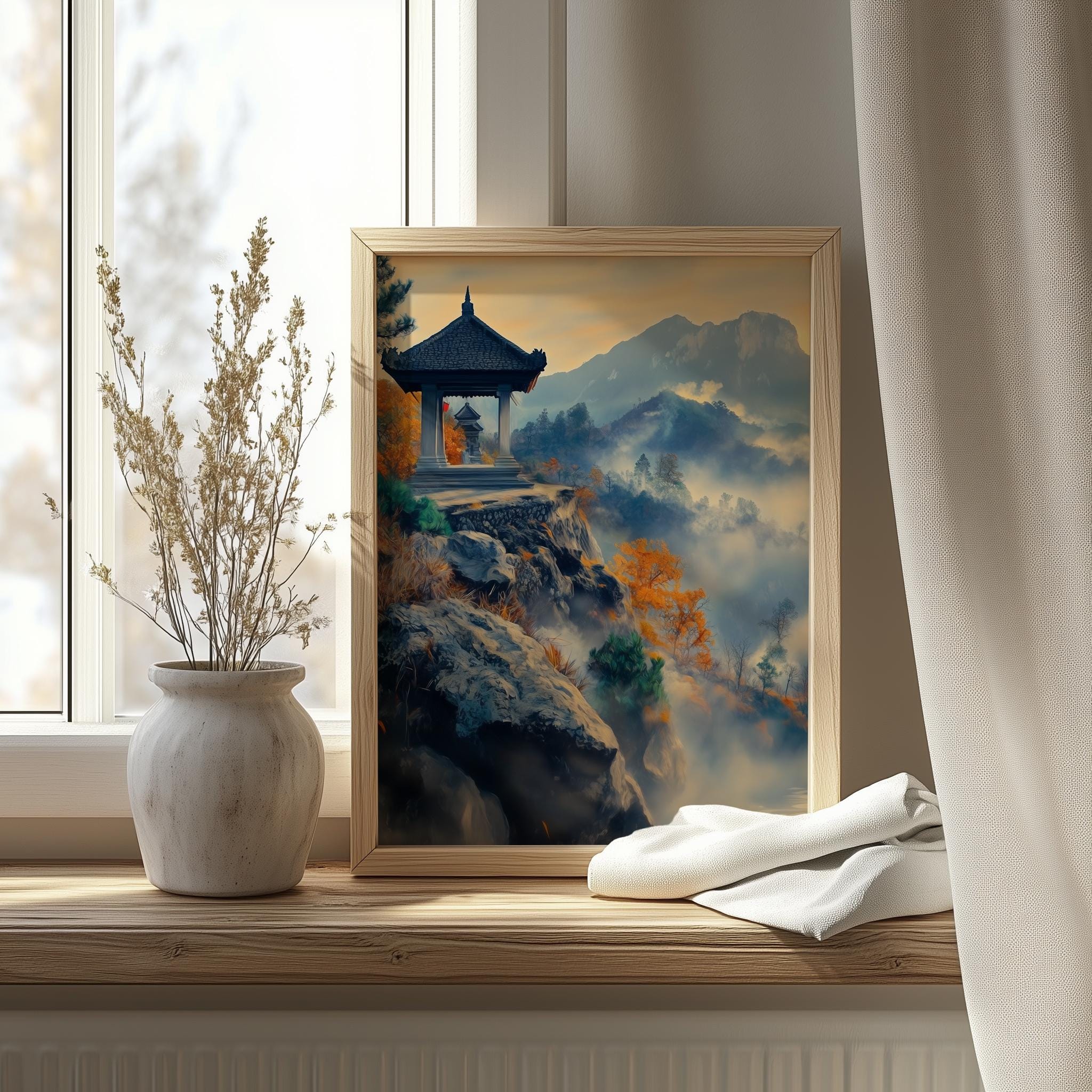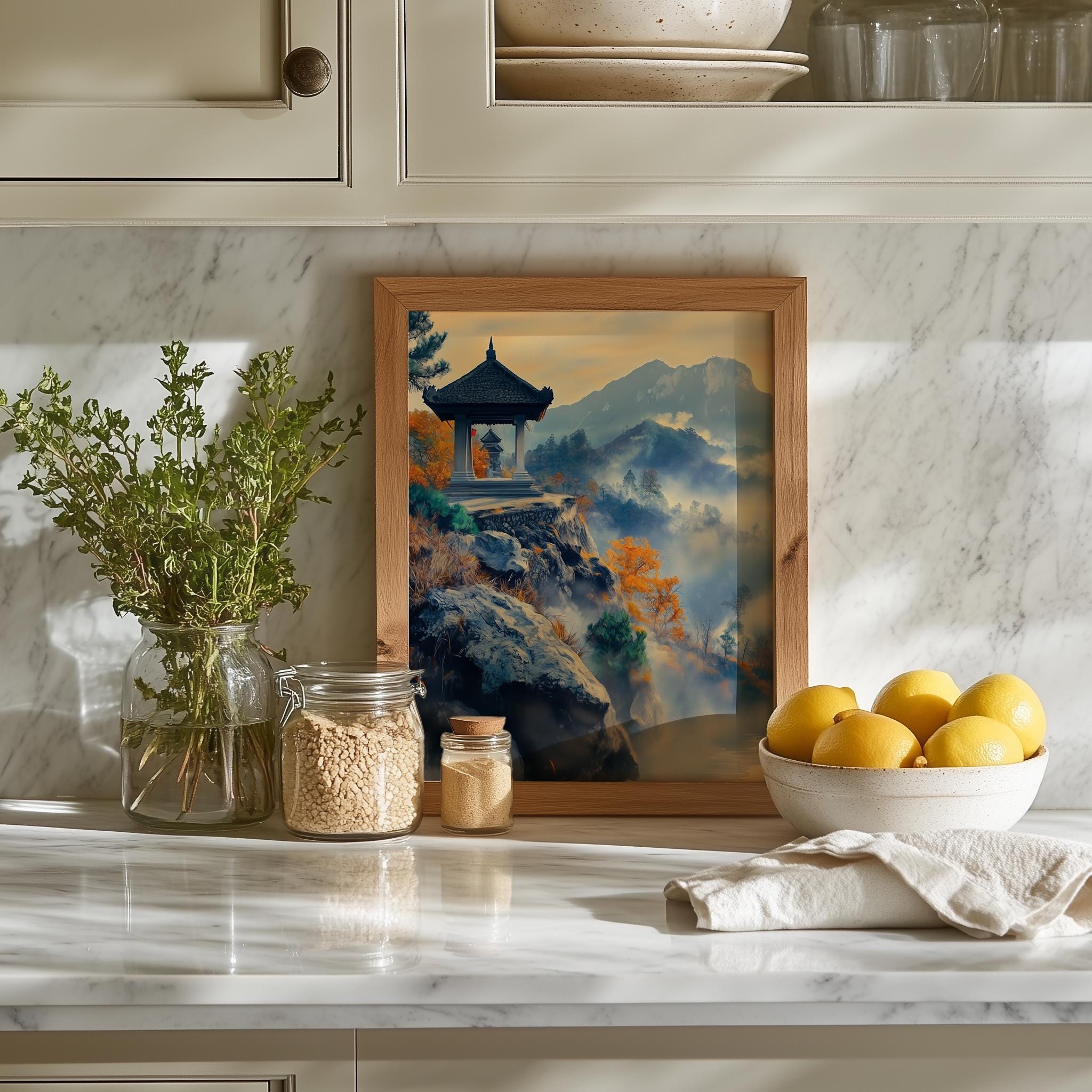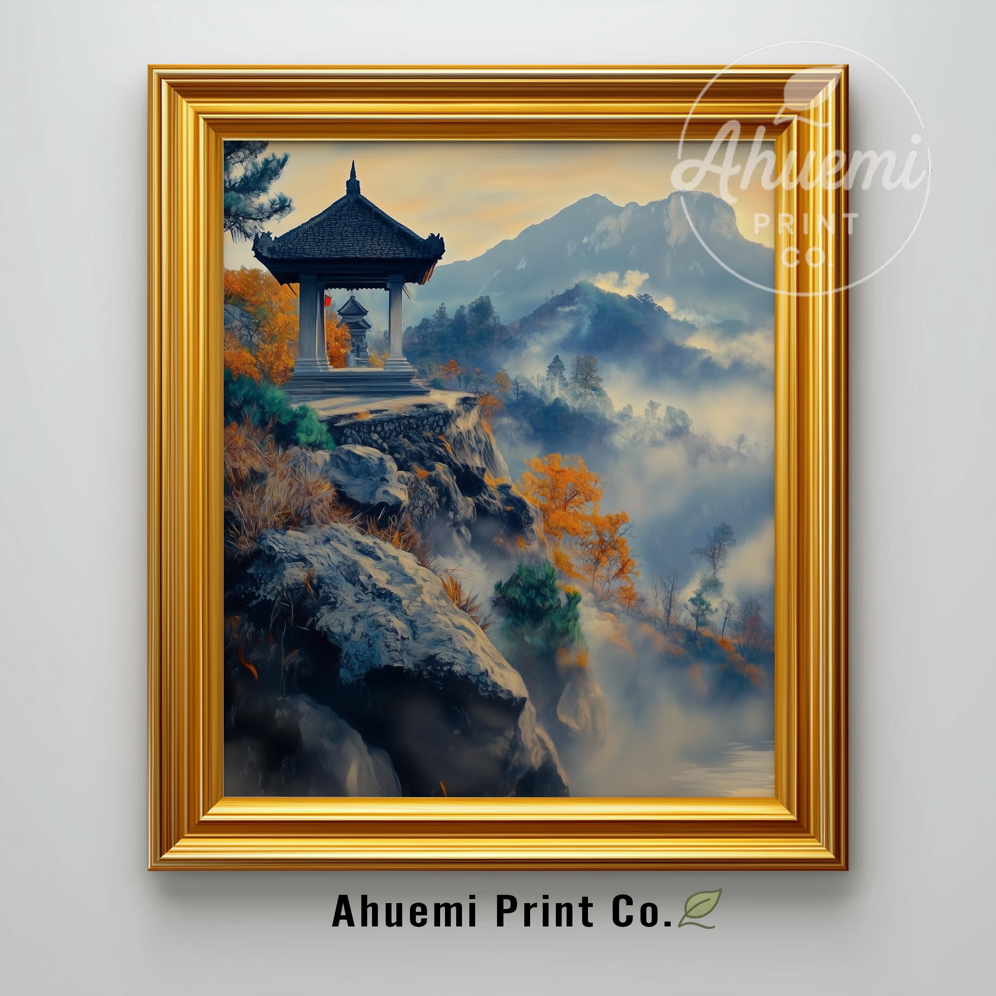 Immerse yourself in the charm of this painting of a tranquil Balinese stone temple nestled among autumn-colored mountains. An instantly downloadable print, it's perfect for elevating your decor with budget-friendly charm. This gives you the flexibility to customize the size, frame, and material according to your personal taste and space, ensuring a perfect fit for your walls.