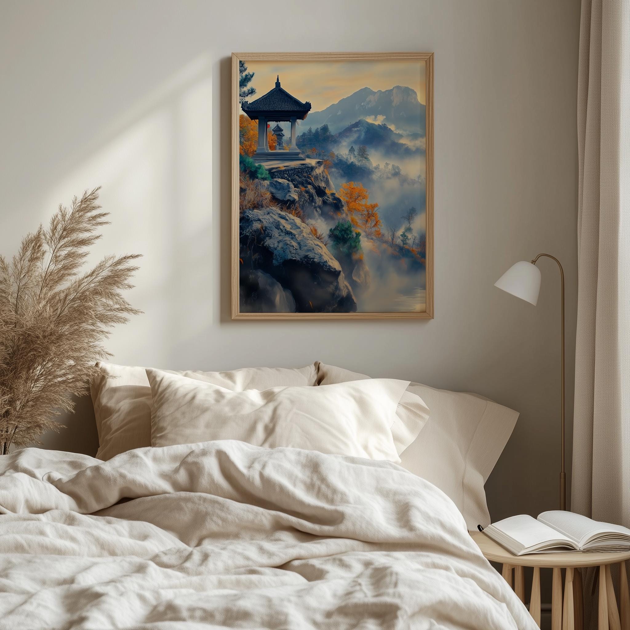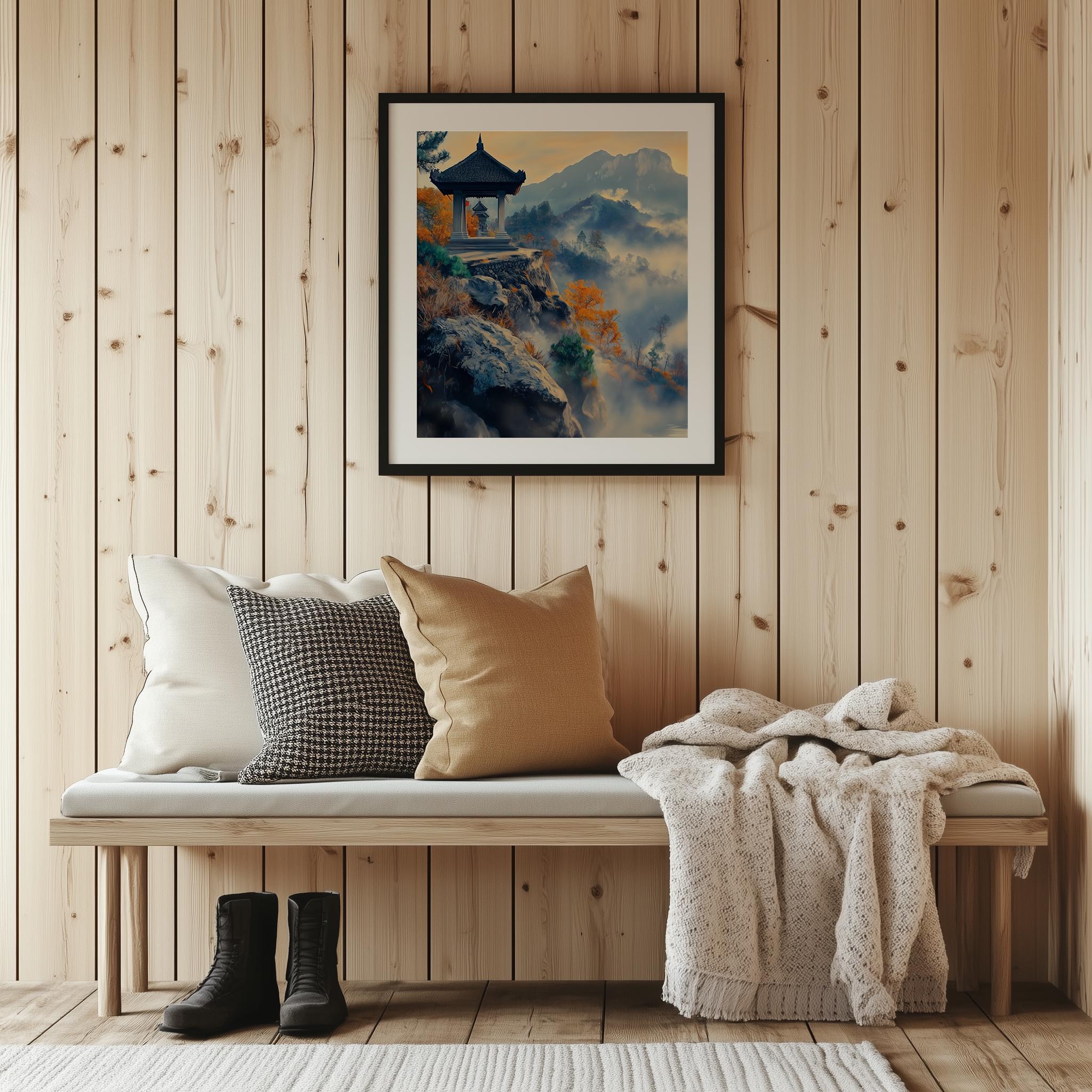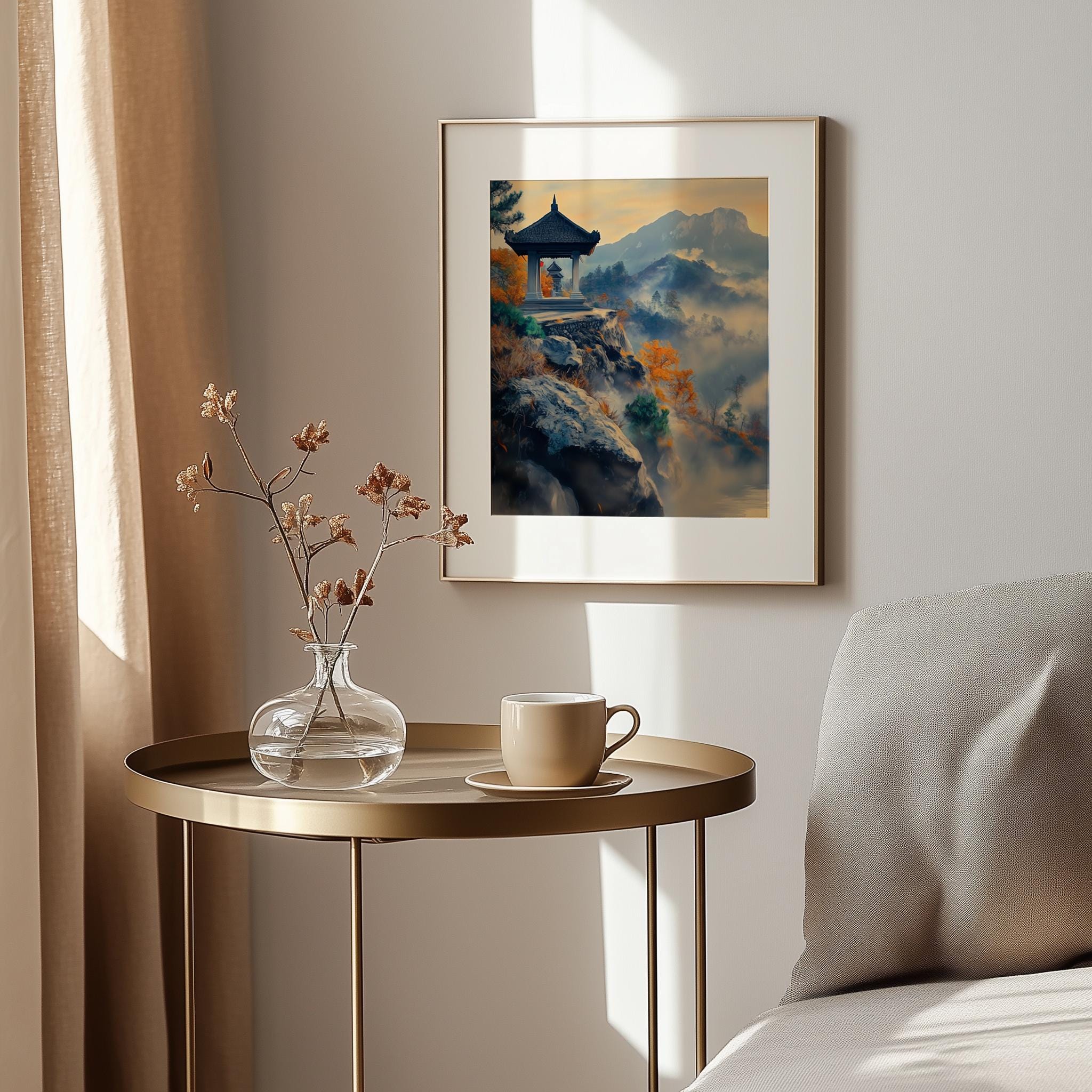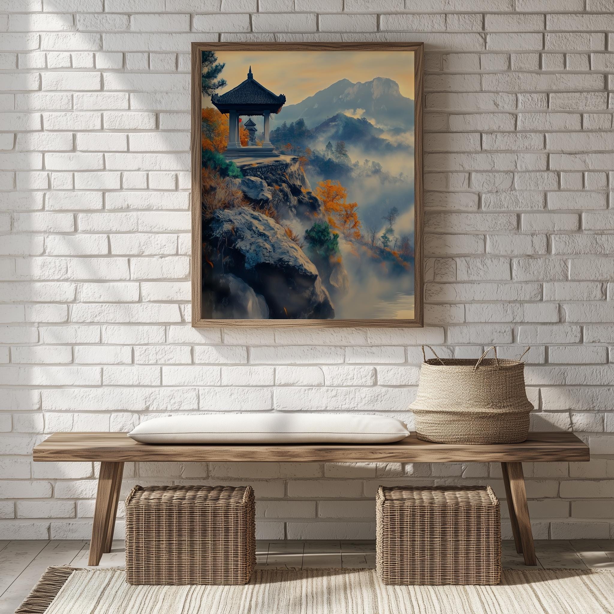Immerse yourself in the charm of this painting of a tranquil Balinese stone temple nestled among autumn-colored mountains. An instantly downloadable print, it's perfect for elevating your decor with budget-friendly charm. This gives you the flexibility to customize the size, frame, and material according to your personal taste and space, ensuring a perfect fit for your walls.