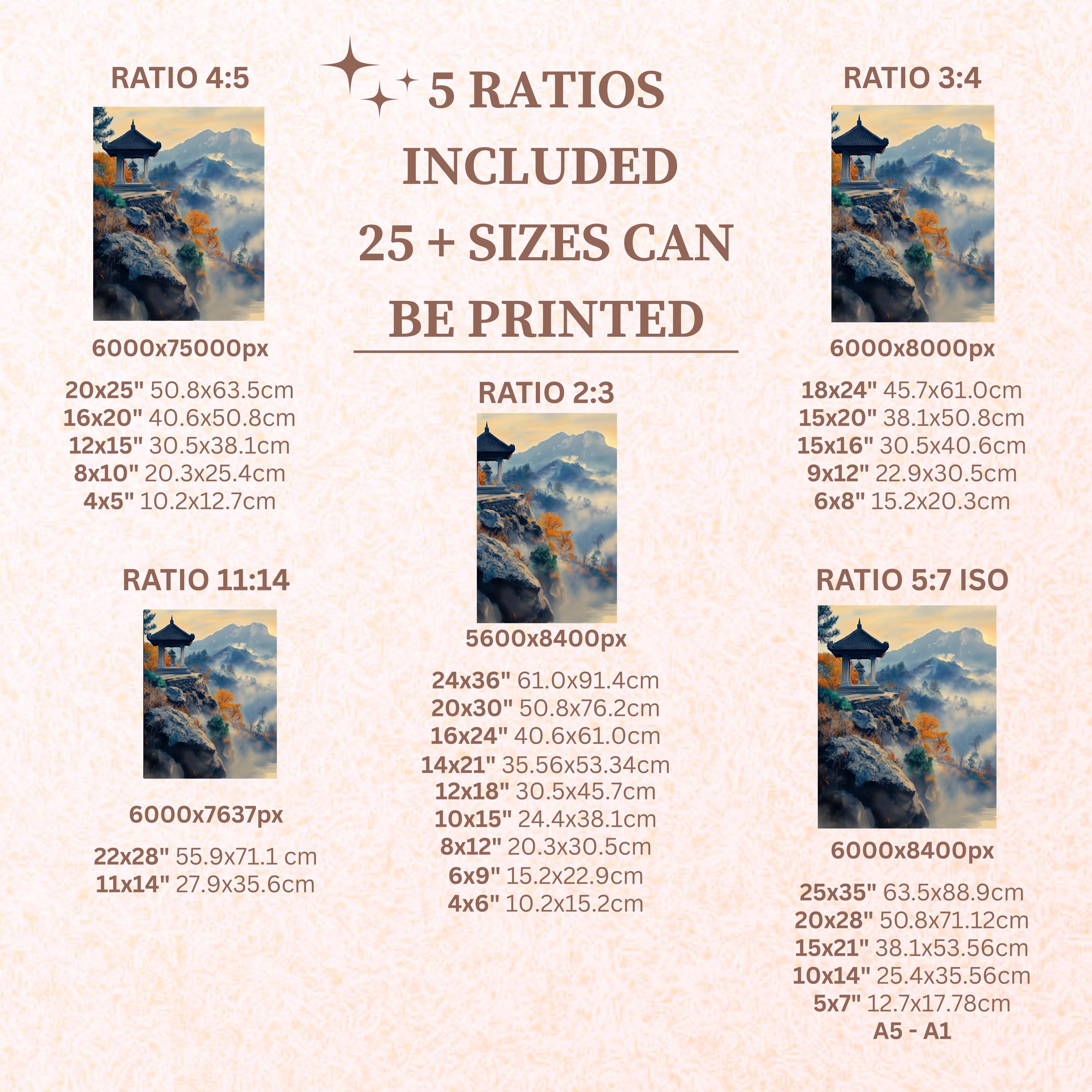 Each artwork includes 5 aspect ratios with 25+ print sizes. Most standard frames are covered. One custom resize per purchase available—message before ordering.