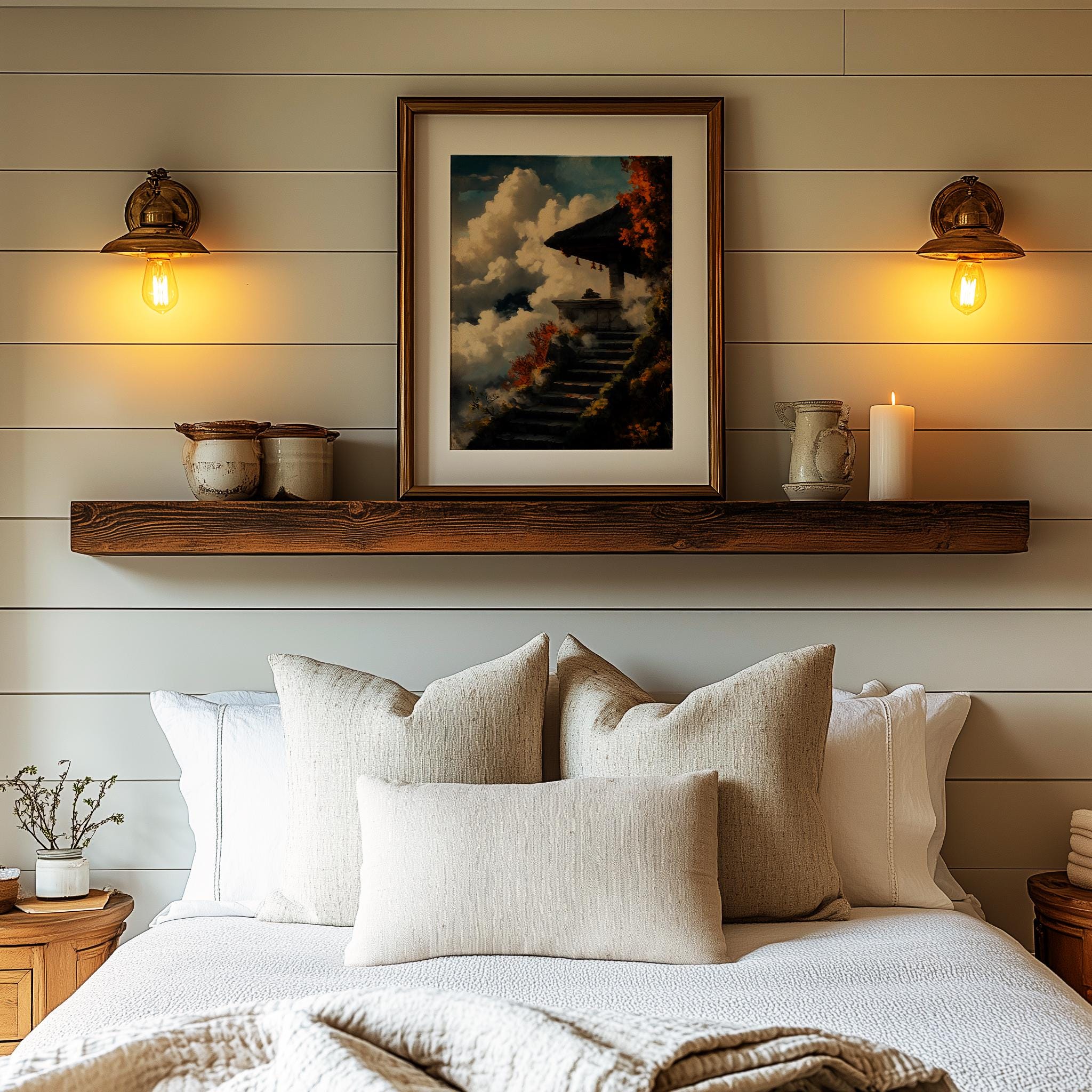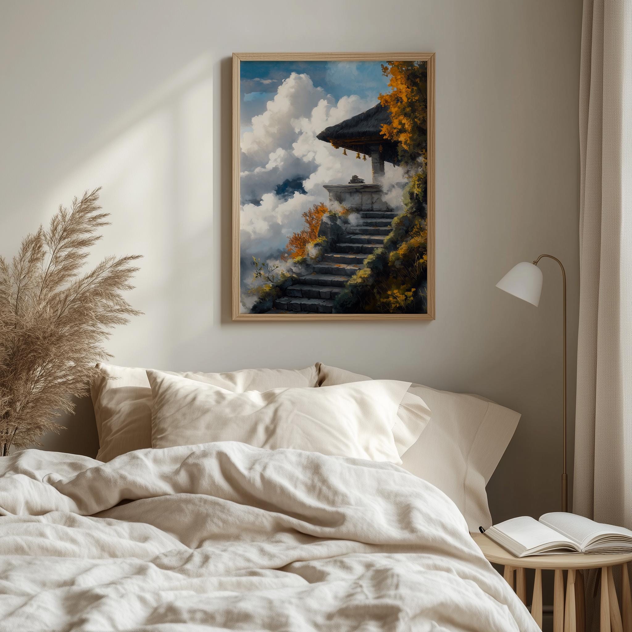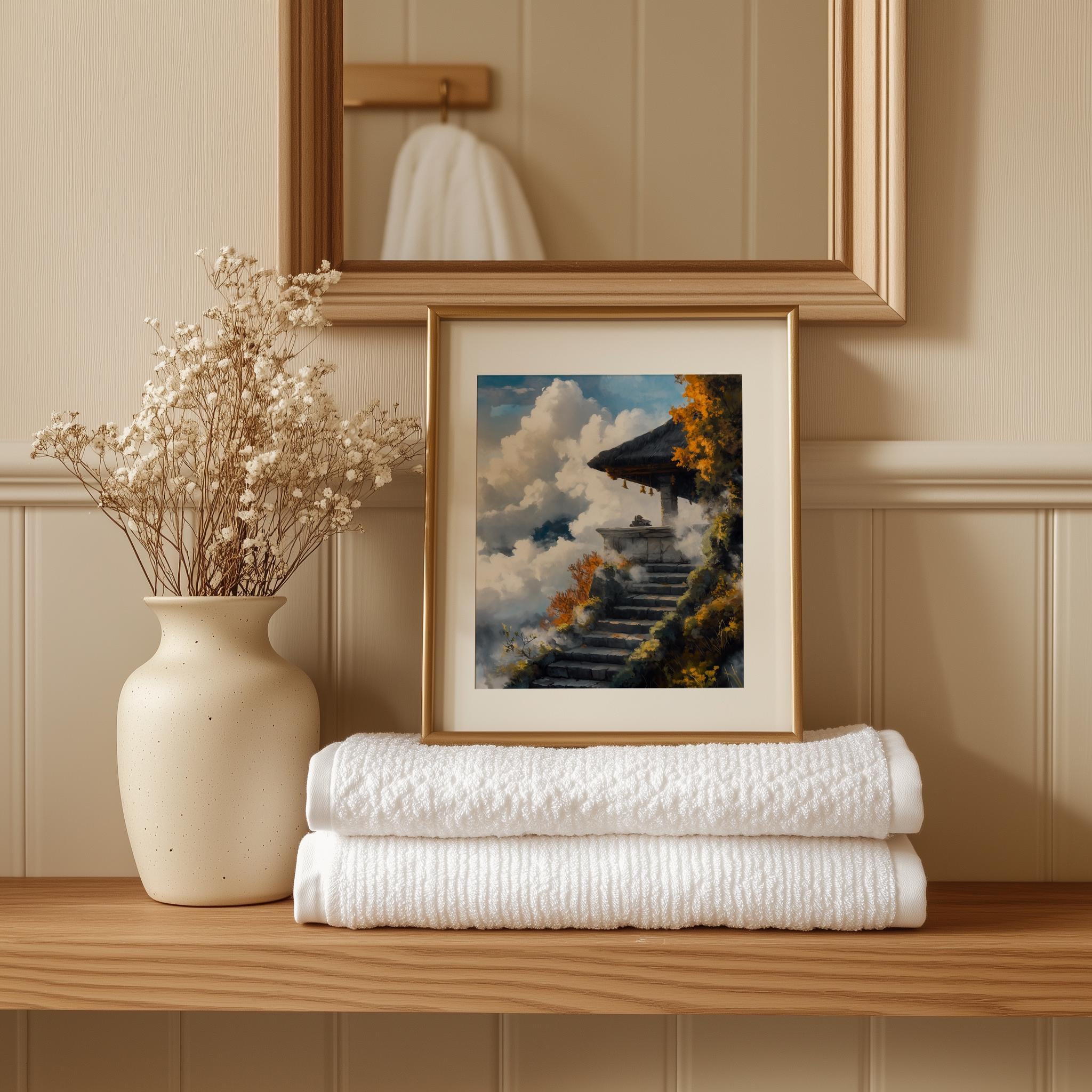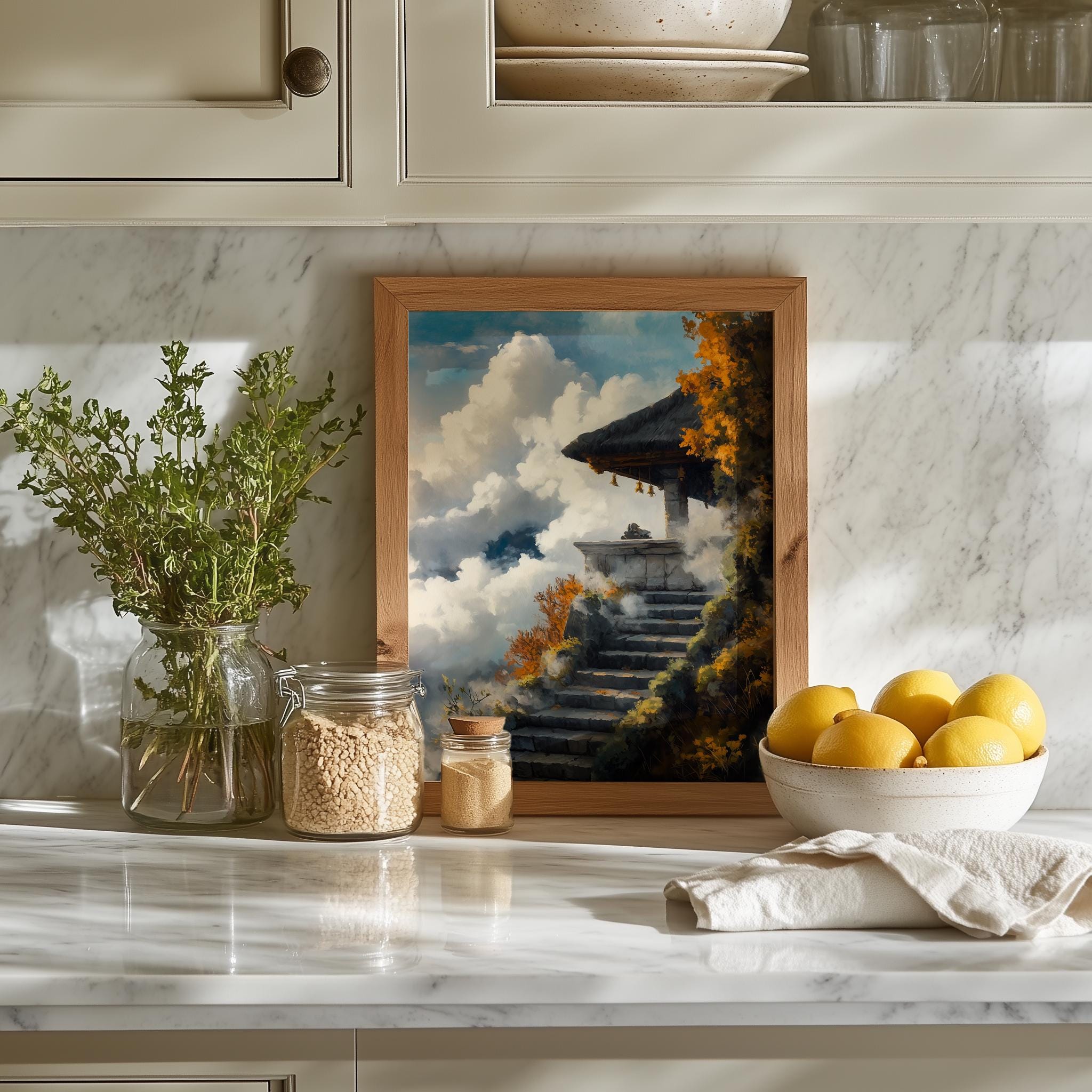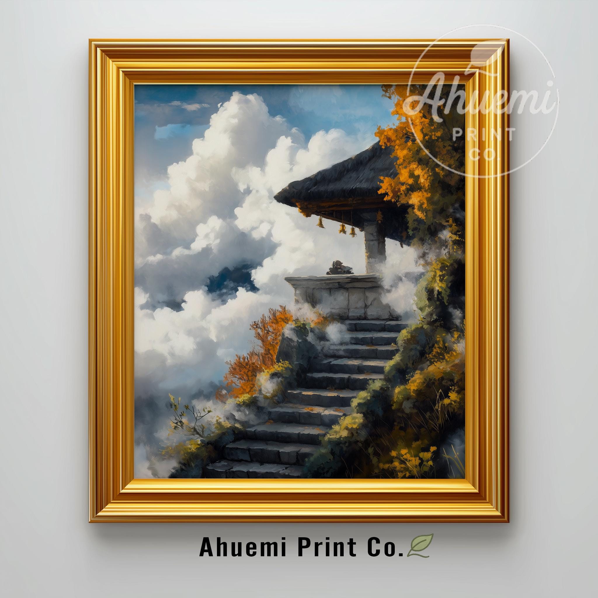 Immerse yourself in the charm of this painting of a serene Balinese temple nestled atop a misty mountain. An instantly downloadable print, it's perfect for elevating your decor with budget-friendly charm. This gives you the flexibility to customize the size, frame, and material according to your personal taste and space, ensuring a perfect fit for your walls.