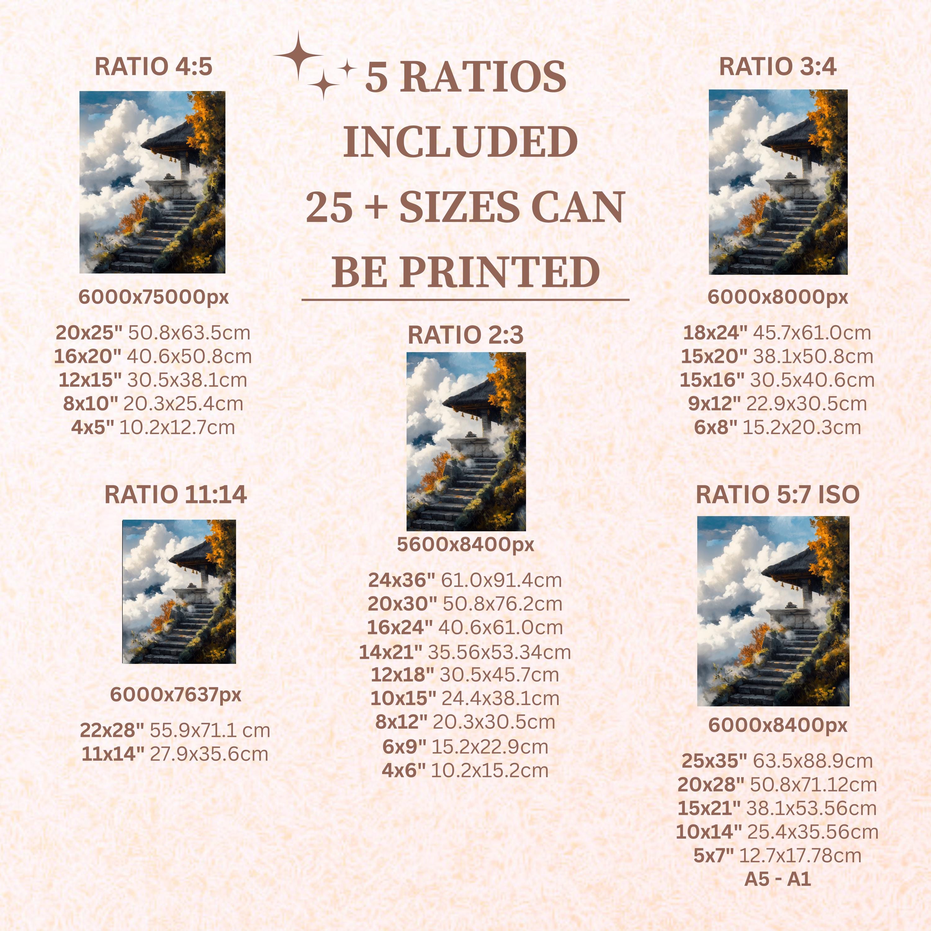 Each artwork includes 5 aspect ratios with 25+ print sizes. Most standard frames are covered. One custom resize per purchase available—message before ordering.