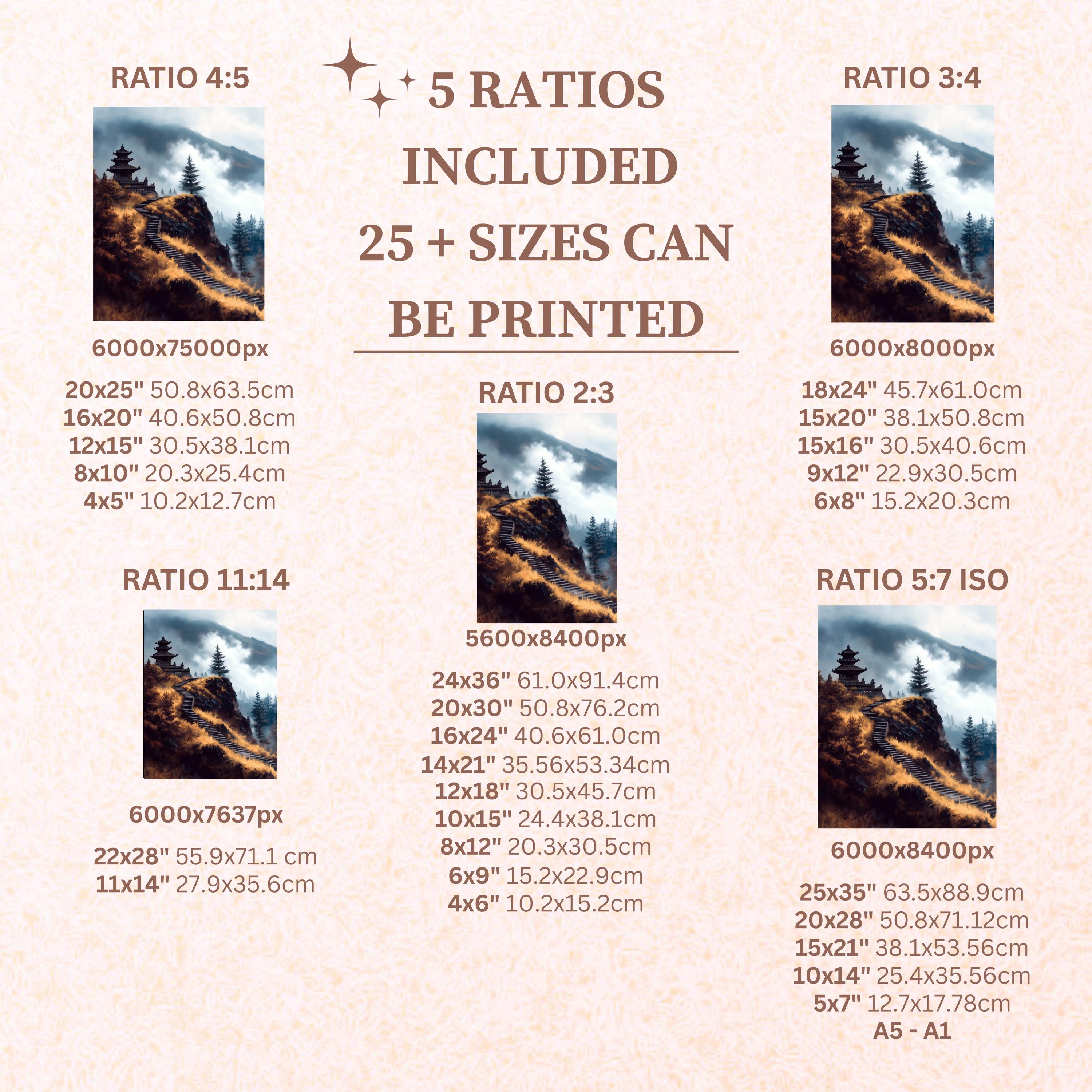 Each artwork includes 5 aspect ratios with 25+ print sizes. Most standard frames are covered. One custom resize per purchase available—message before ordering.