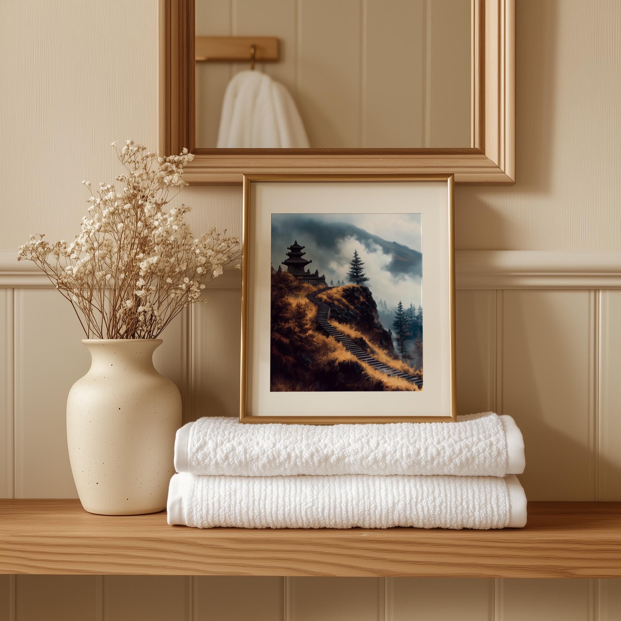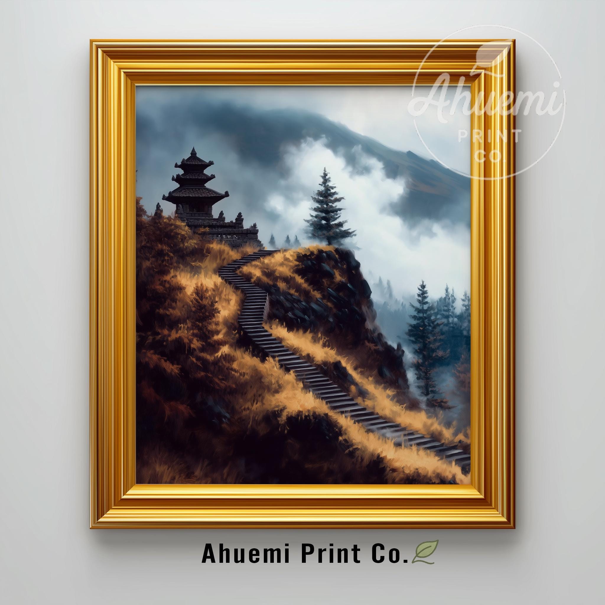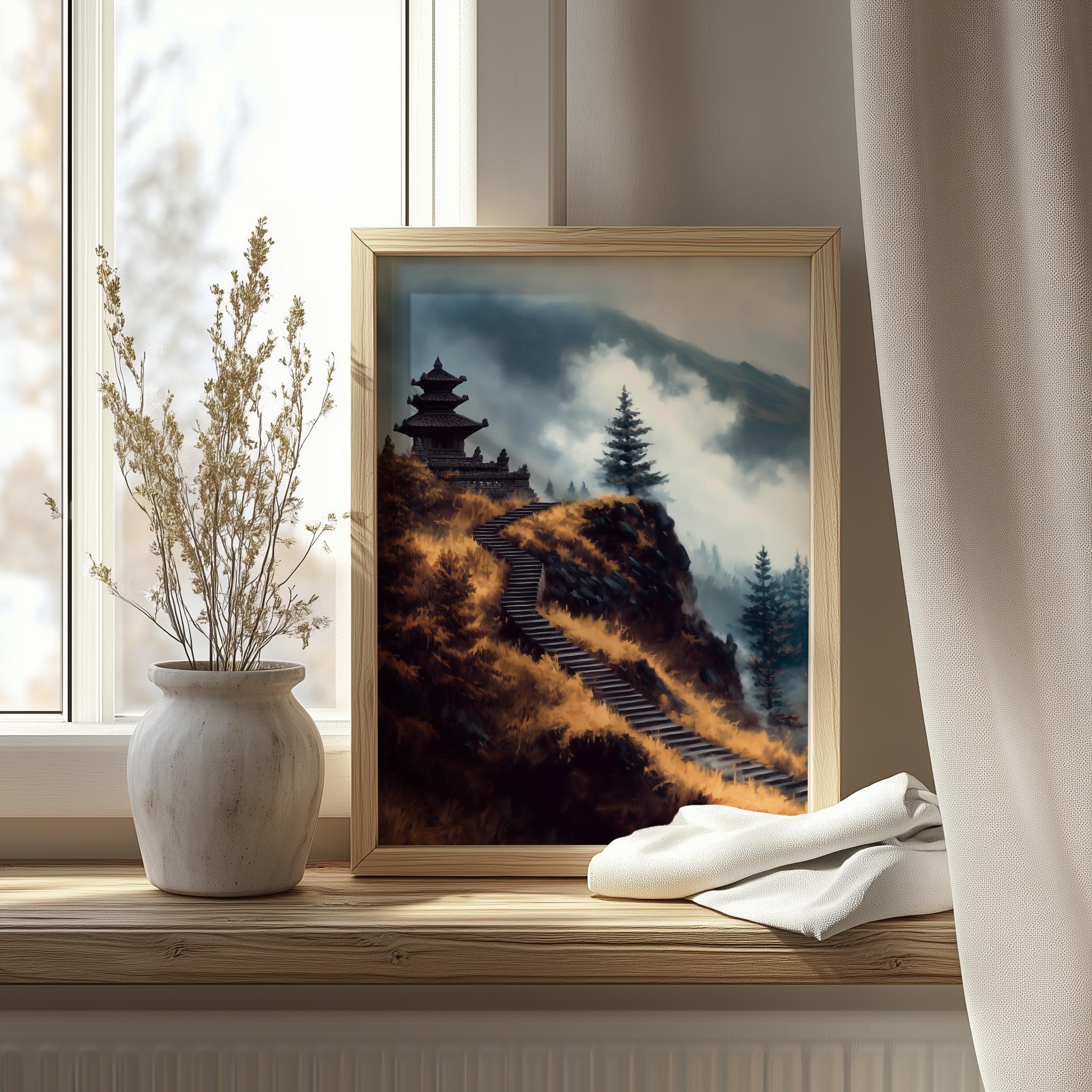 Immerse yourself in the charm of this painting of a serene Balinese temple perched on a cliffside, shrouded in mist. An instantly downloadable print, it's perfect for elevating your decor with budget-friendly charm. This gives you the flexibility to customize the size, frame, and material according to your personal taste and space, ensuring a perfect fit for your walls.