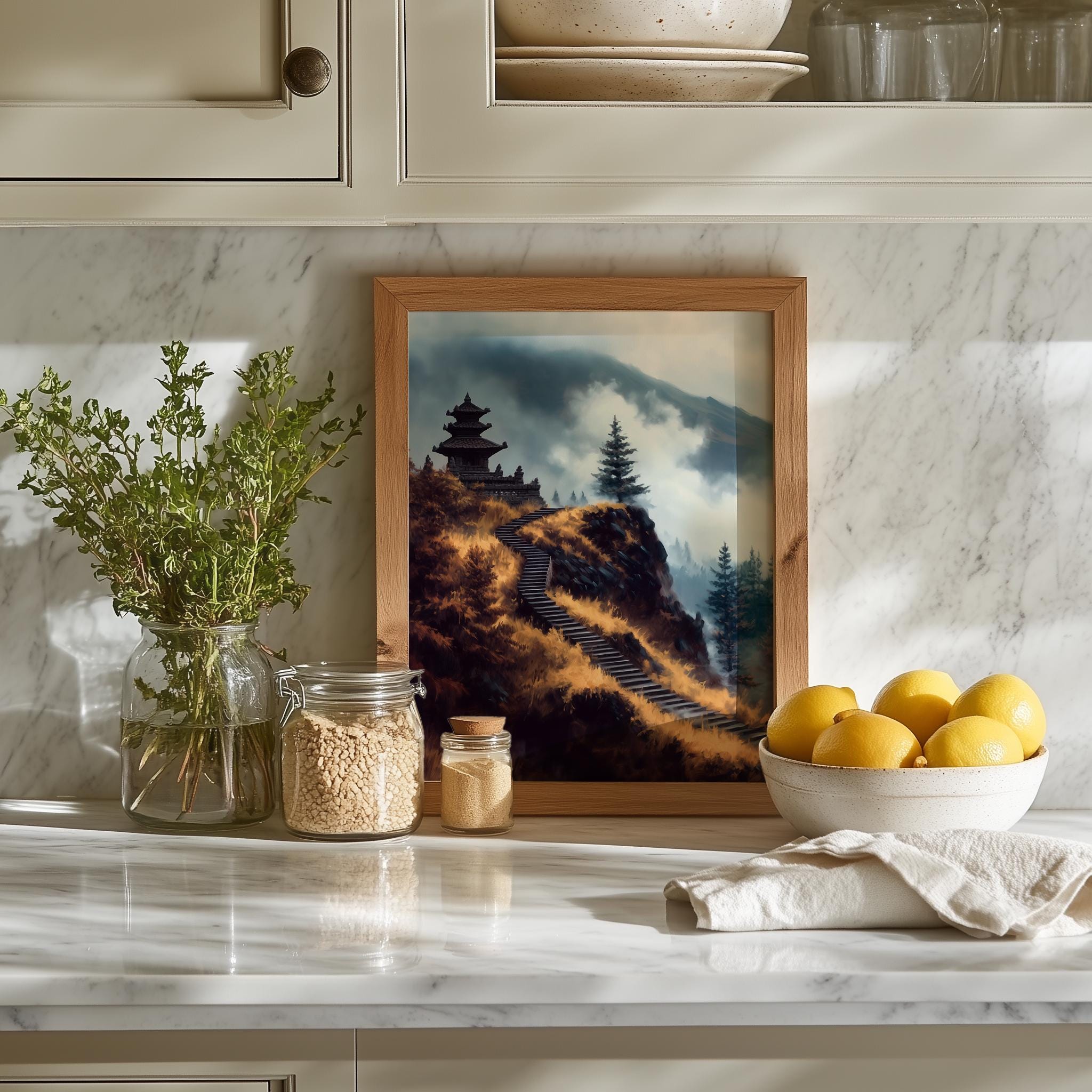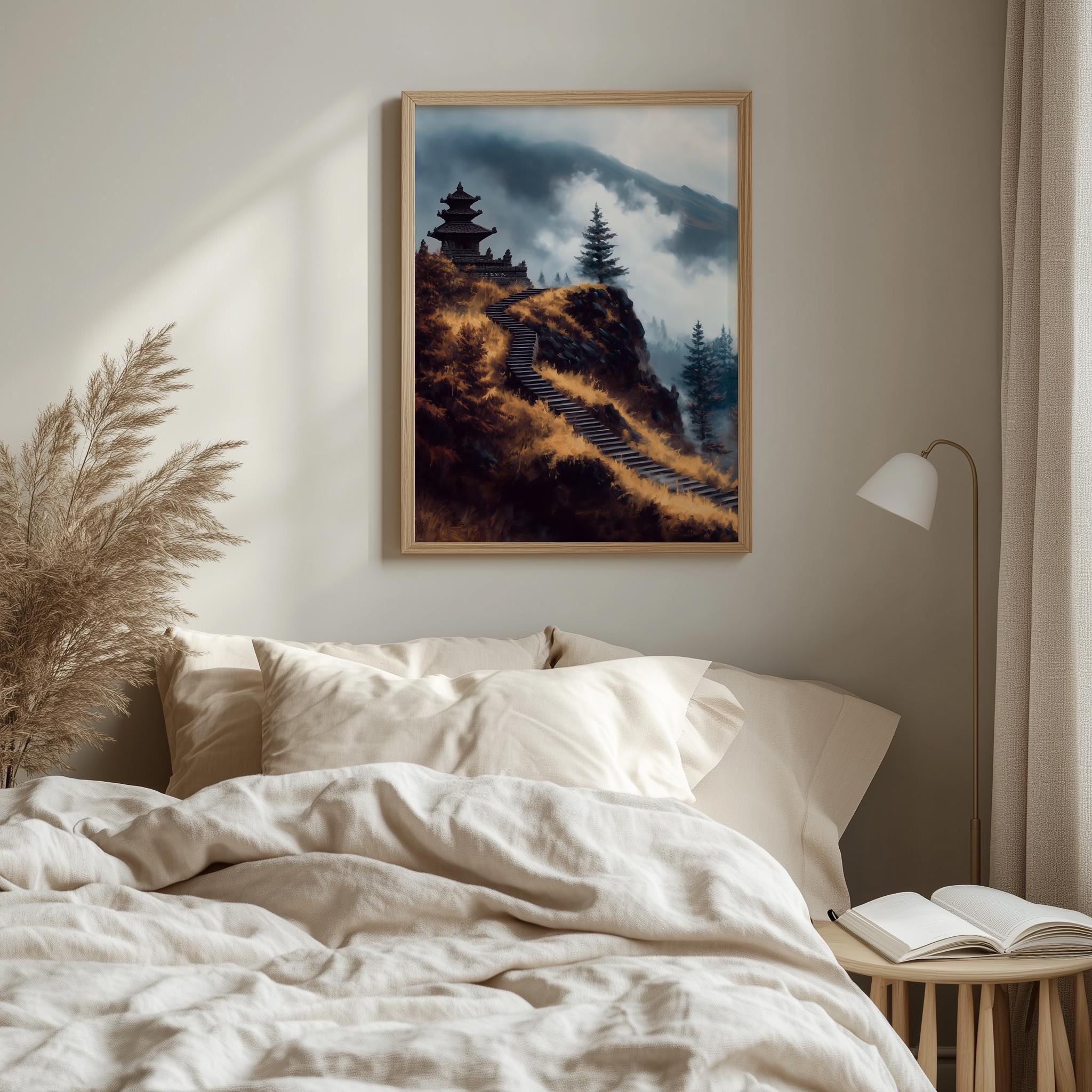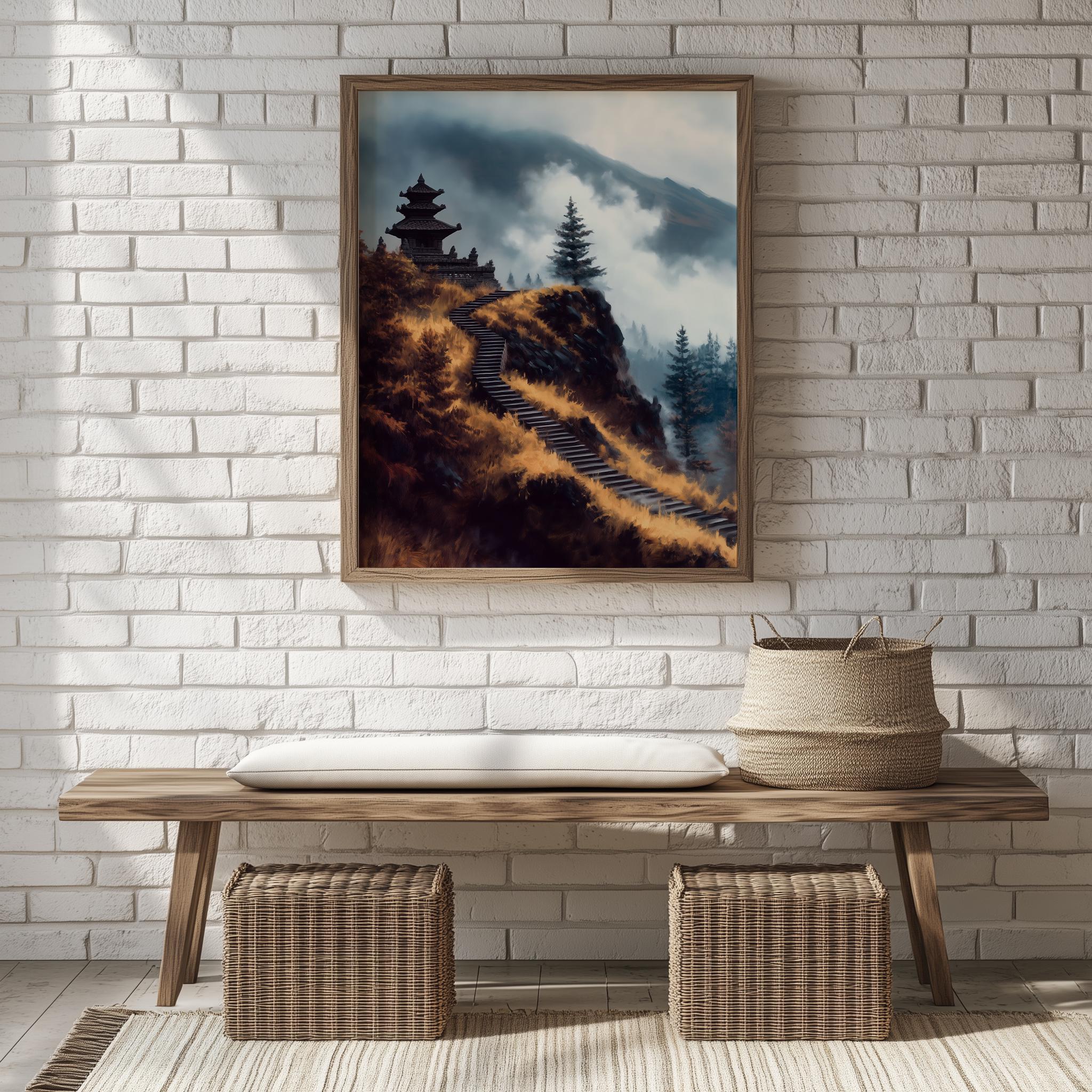 Immerse yourself in the charm of this painting of a serene Balinese temple perched on a cliffside, shrouded in mist. An instantly downloadable print, it's perfect for elevating your decor with budget-friendly charm. This gives you the flexibility to customize the size, frame, and material according to your personal taste and space, ensuring a perfect fit for your walls.