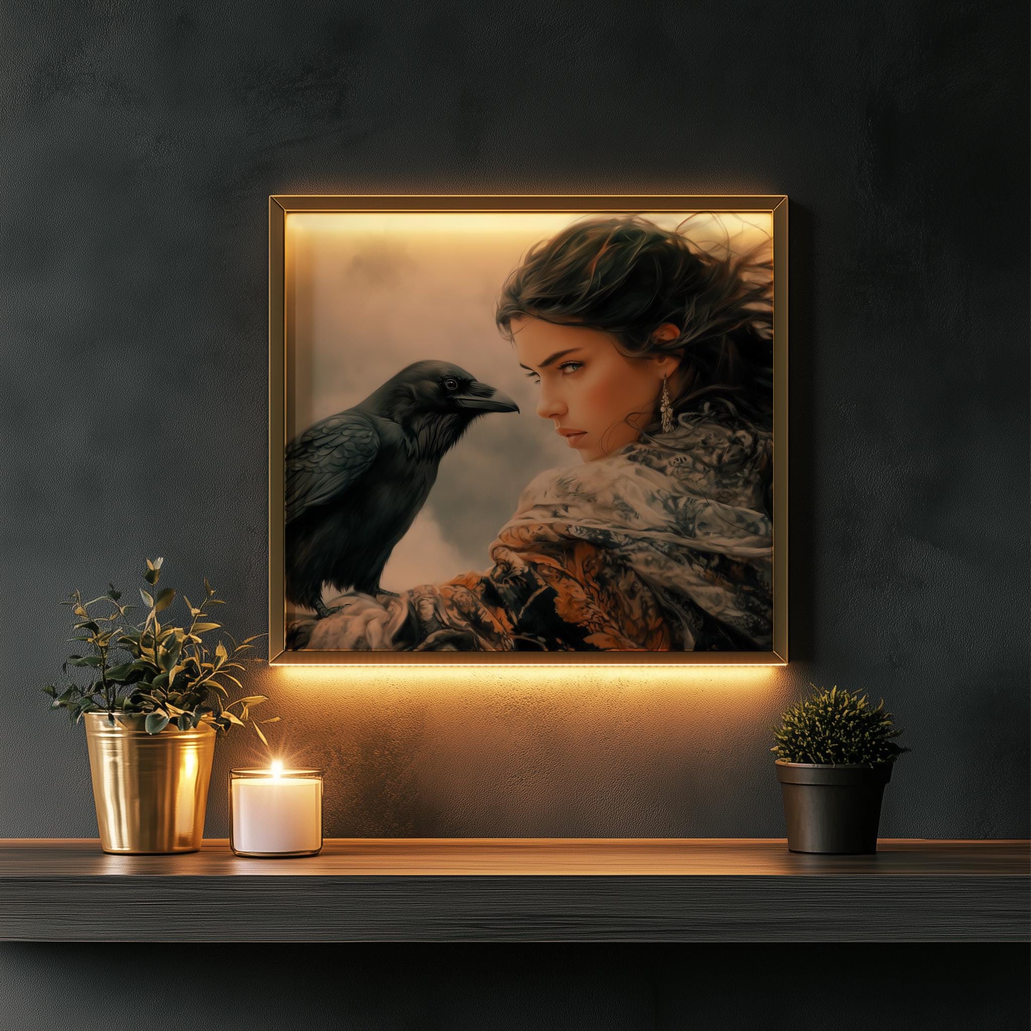 Immerse yourself in the charm with this painting of a mysterious woman accompanied by a majestic raven. An instantly downloadable print, it's perfect for elevating your decor with budget-friendly charm. This gives you the flexibility to customize the size, frame, and material according to your personal taste and space, ensuring a perfect fit for your walls.