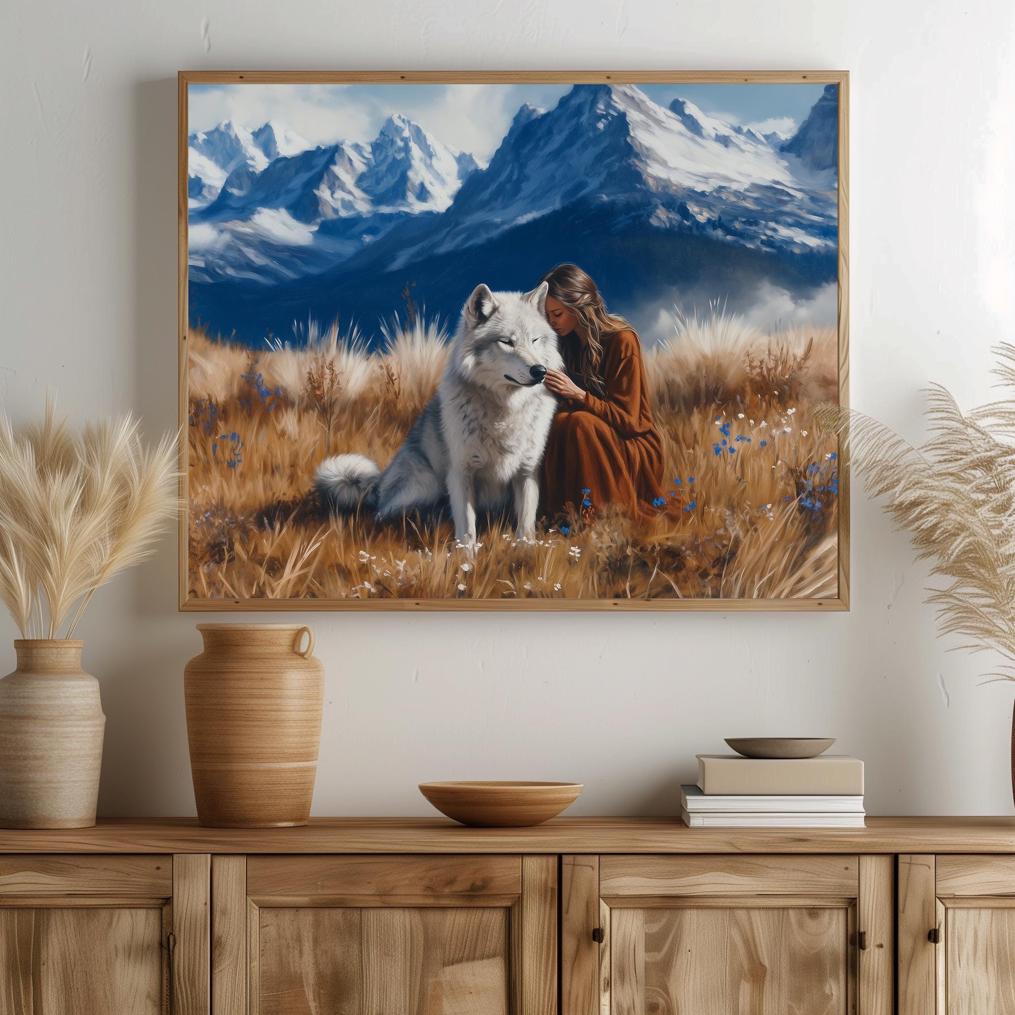 Immerse yourself in the charm with this painting of a mystical woman accompanied by a majestic wolf in a serene alpine meadow. An instantly downloadable print, it's perfect for elevating your decor with budget-friendly charm. This gives you the flexibility to customize the size, frame, and material according to your personal taste and space, ensuring a perfect fit for your walls.