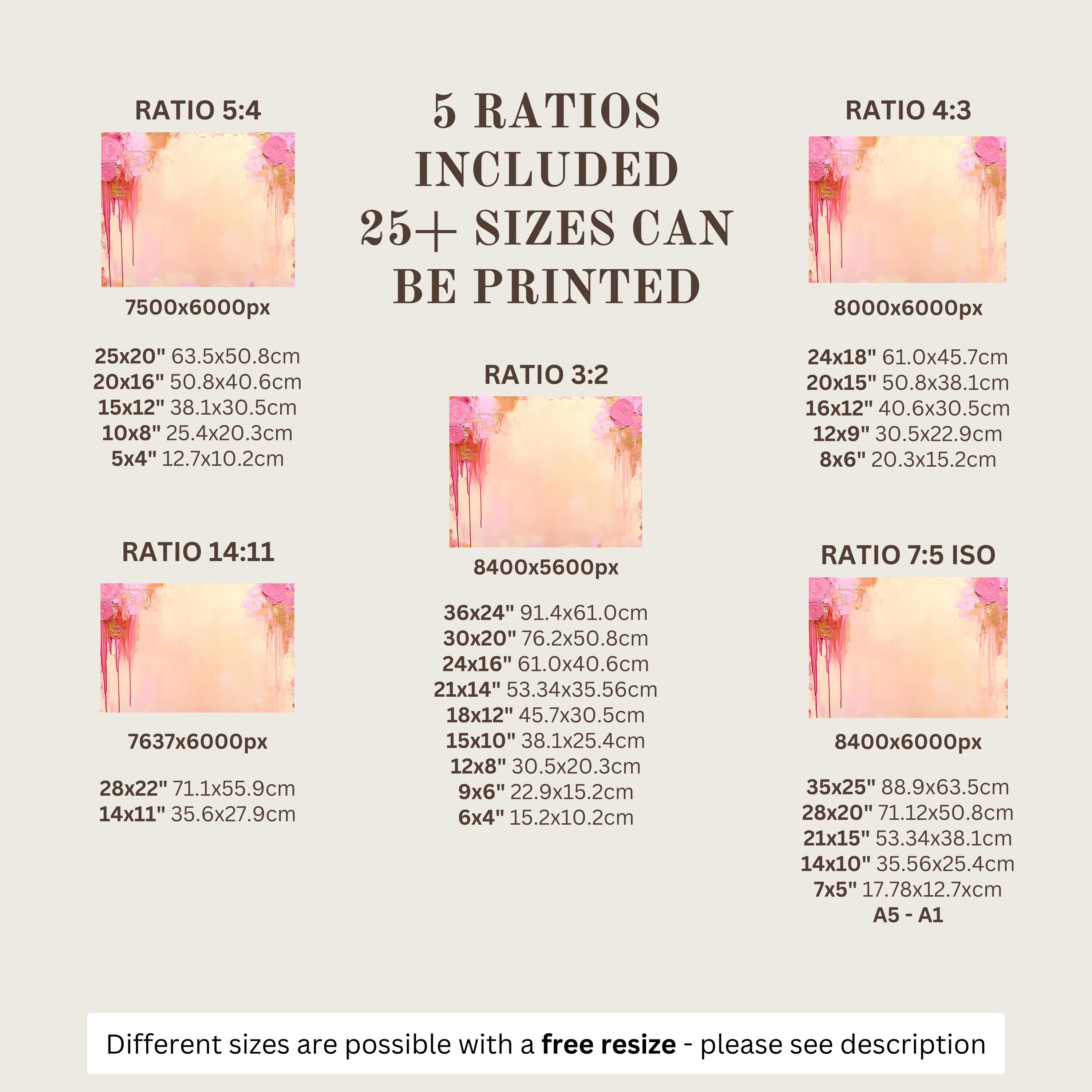 Each artwork includes 5 aspect ratios with 25+ print sizes. Most standard frames are covered. One custom resize per purchase available—message before ordering.