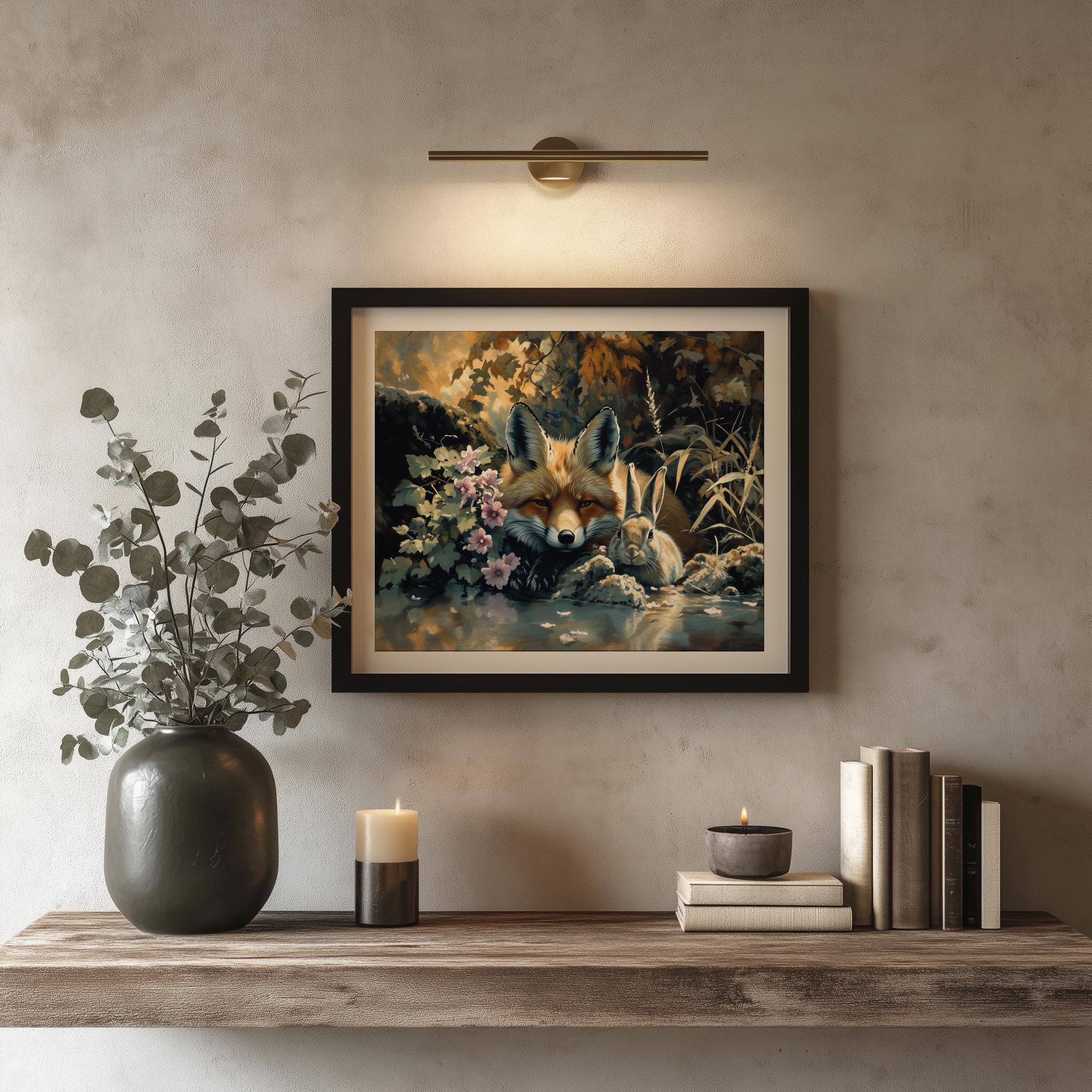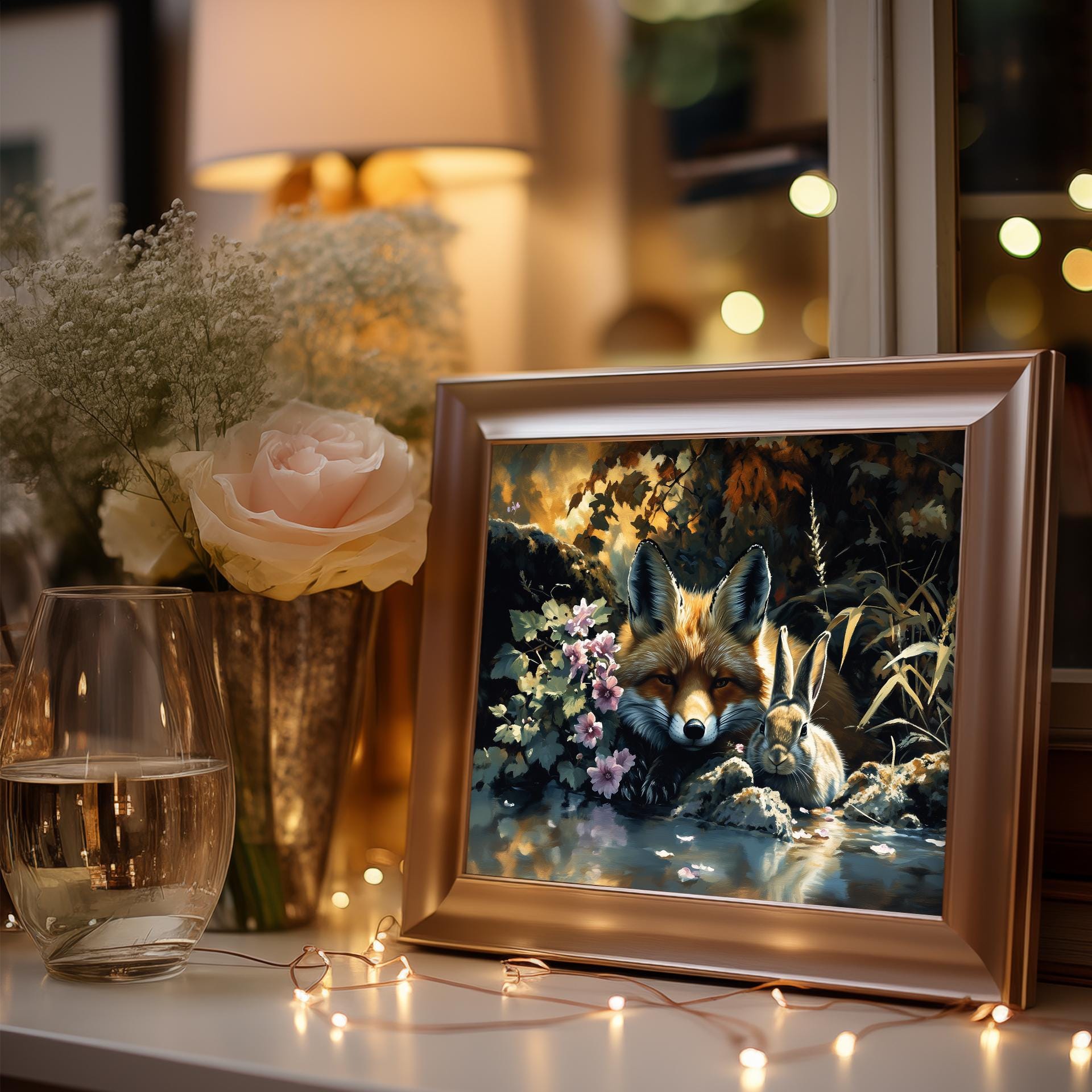 Immerse yourself in the charm with this painting of a cozy fox and rabbit nestled together under a canopy of blooming vines. An instantly downloadable print, it's perfect for elevating your decor with budget-friendly charm. This gives you the flexibility to customize the size, frame, and material according to your personal taste and space, ensuring a perfect fit for your walls.