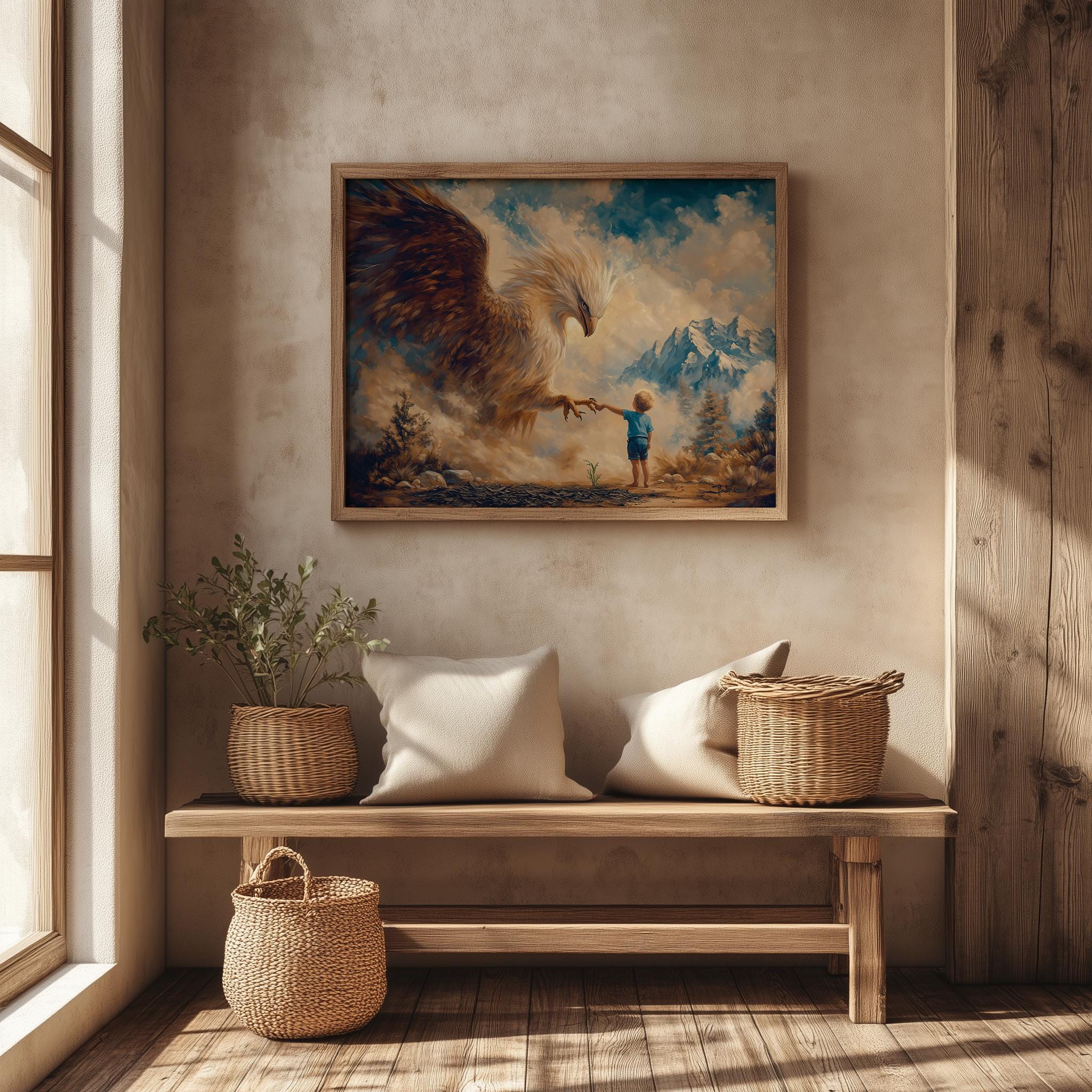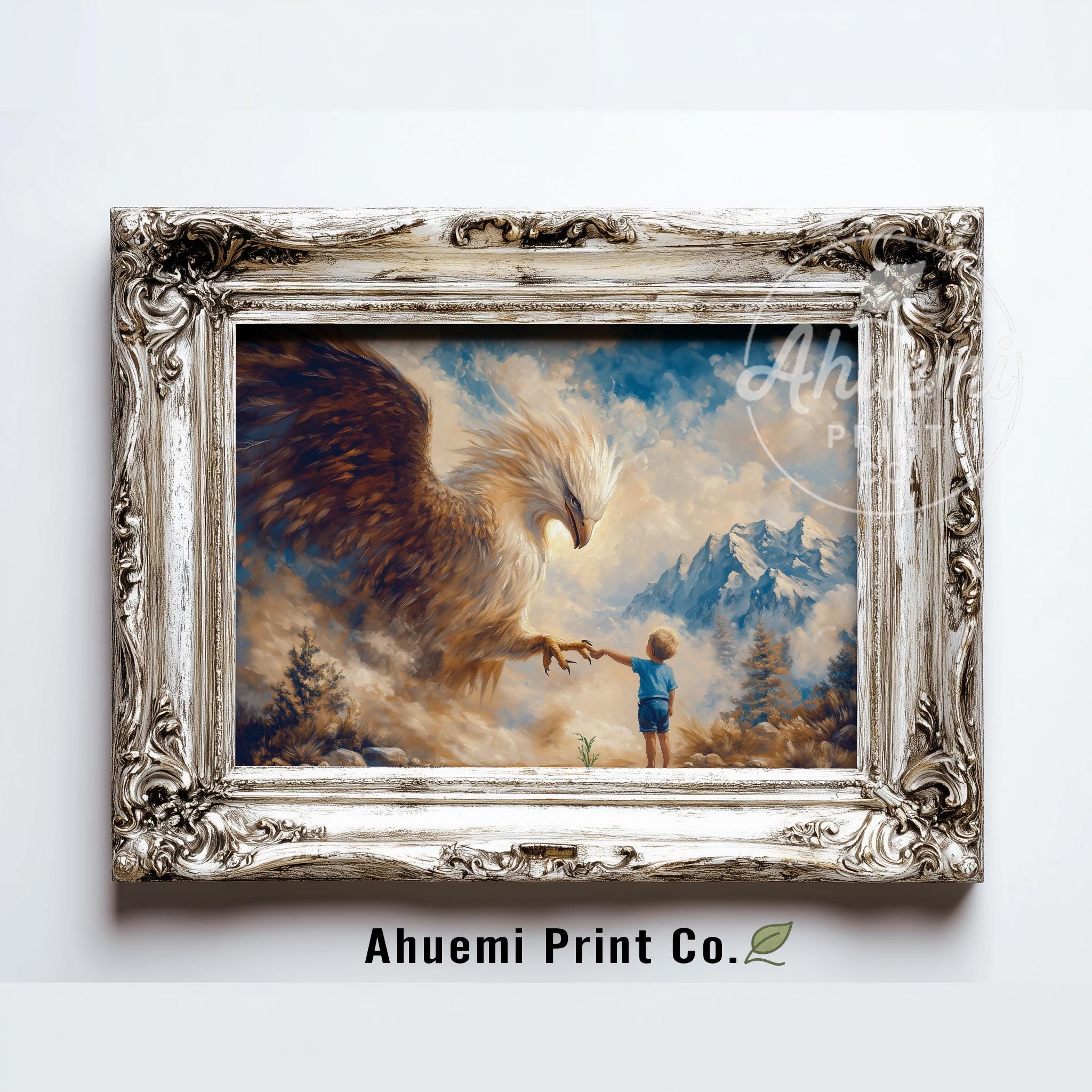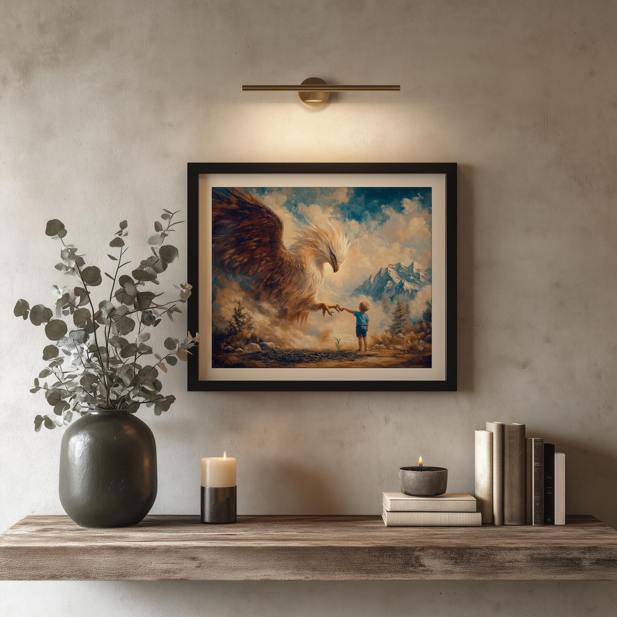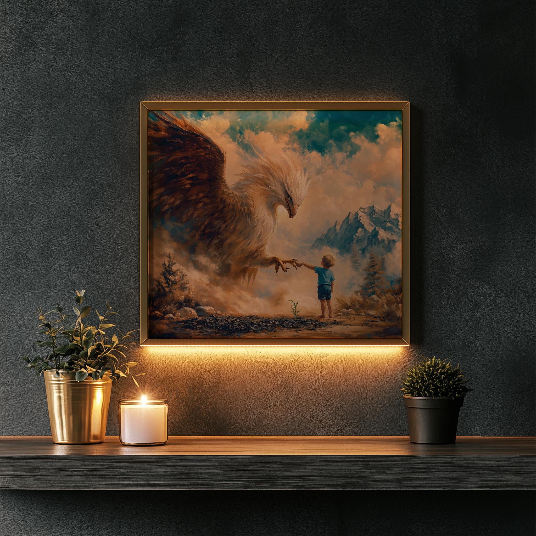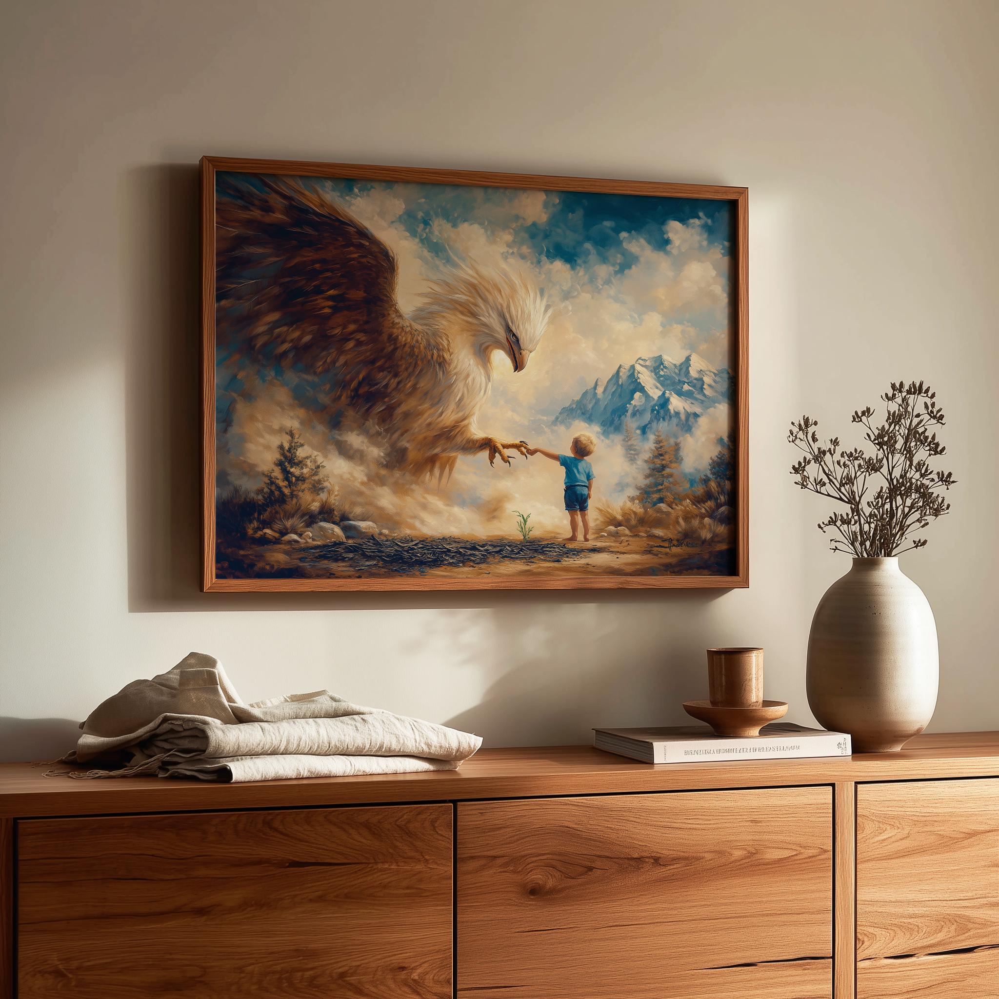 Immerse yourself in the charm with this painting of a majestic eagle protecting a child. An instantly downloadable print, it's perfect for elevating your decor with budget-friendly charm. This gives you the flexibility to customize the size, frame, and material according to your personal taste and space, ensuring a perfect fit for your walls.