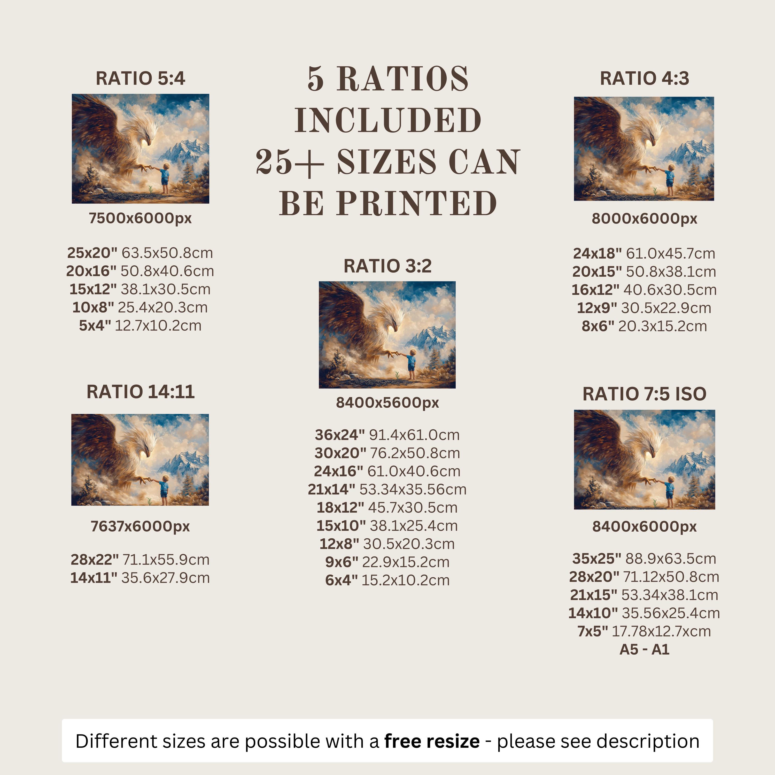 Each artwork includes 5 aspect ratios with 25+ print sizes. Most standard frames are covered. One custom resize per purchase available—message before ordering.