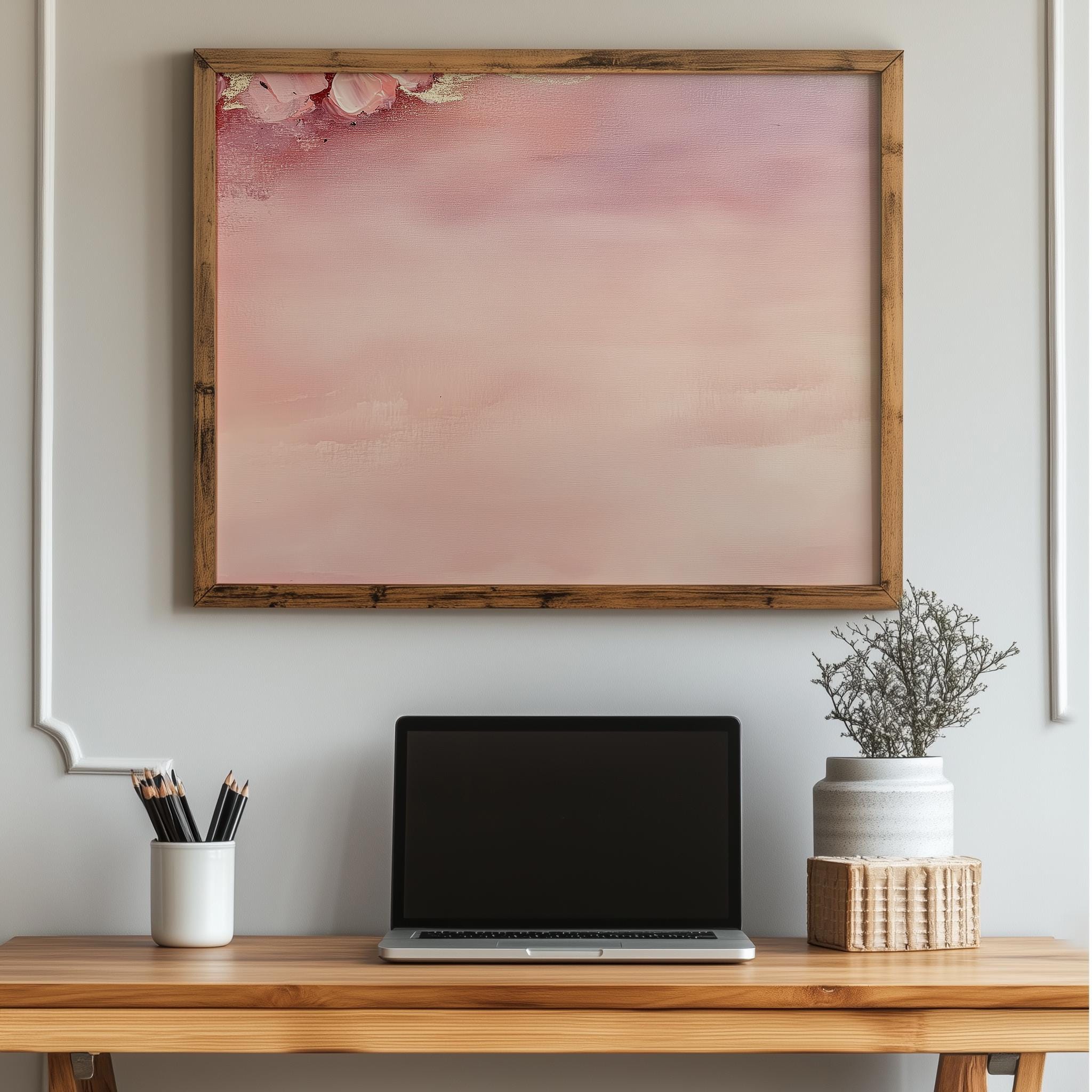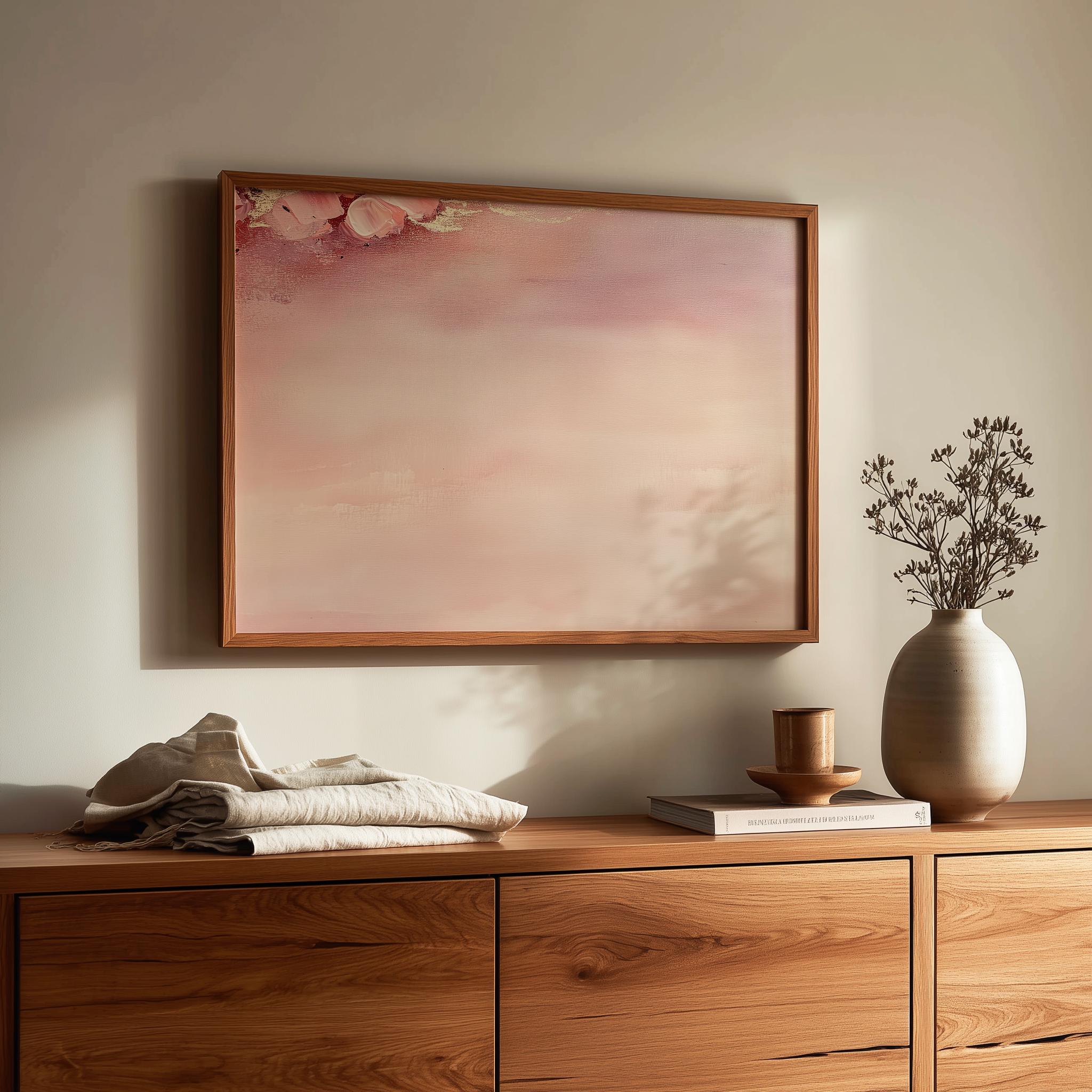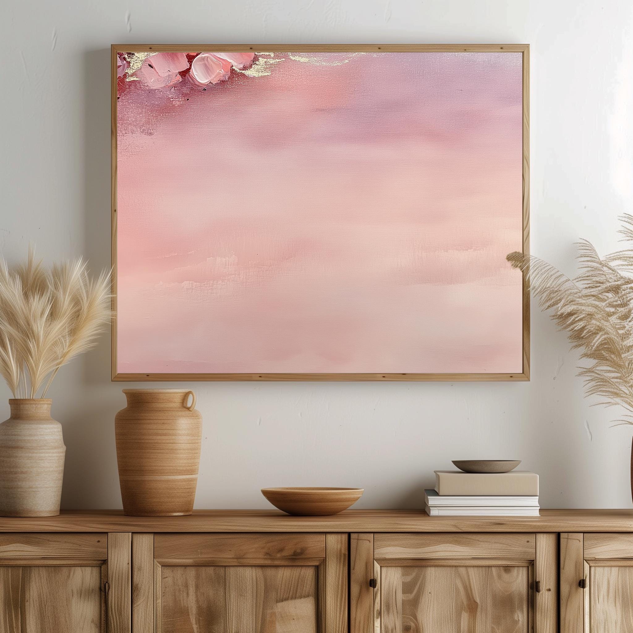 Immerse yourself in the charm with this painting of a soft blush gradient that evokes tranquility and elegance. An instantly downloadable print, it's perfect for elevating your decor with budget-friendly charm. This gives you the flexibility to customize the size, frame, and material according to your personal taste and space, ensuring a perfect fit for your walls.