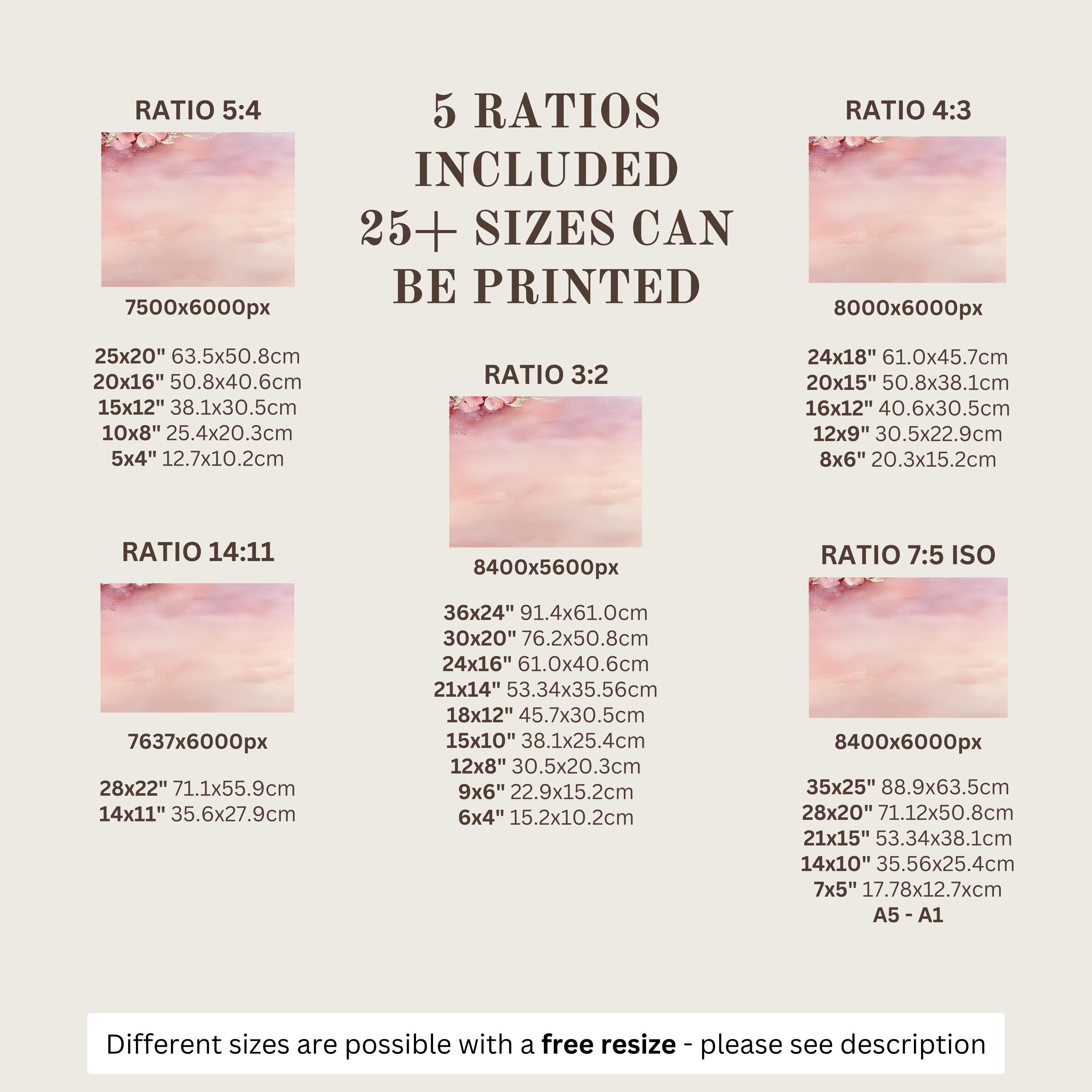 Each artwork includes 5 aspect ratios with 25+ print sizes. Most standard frames are covered. One custom resize per purchase available—message before ordering.