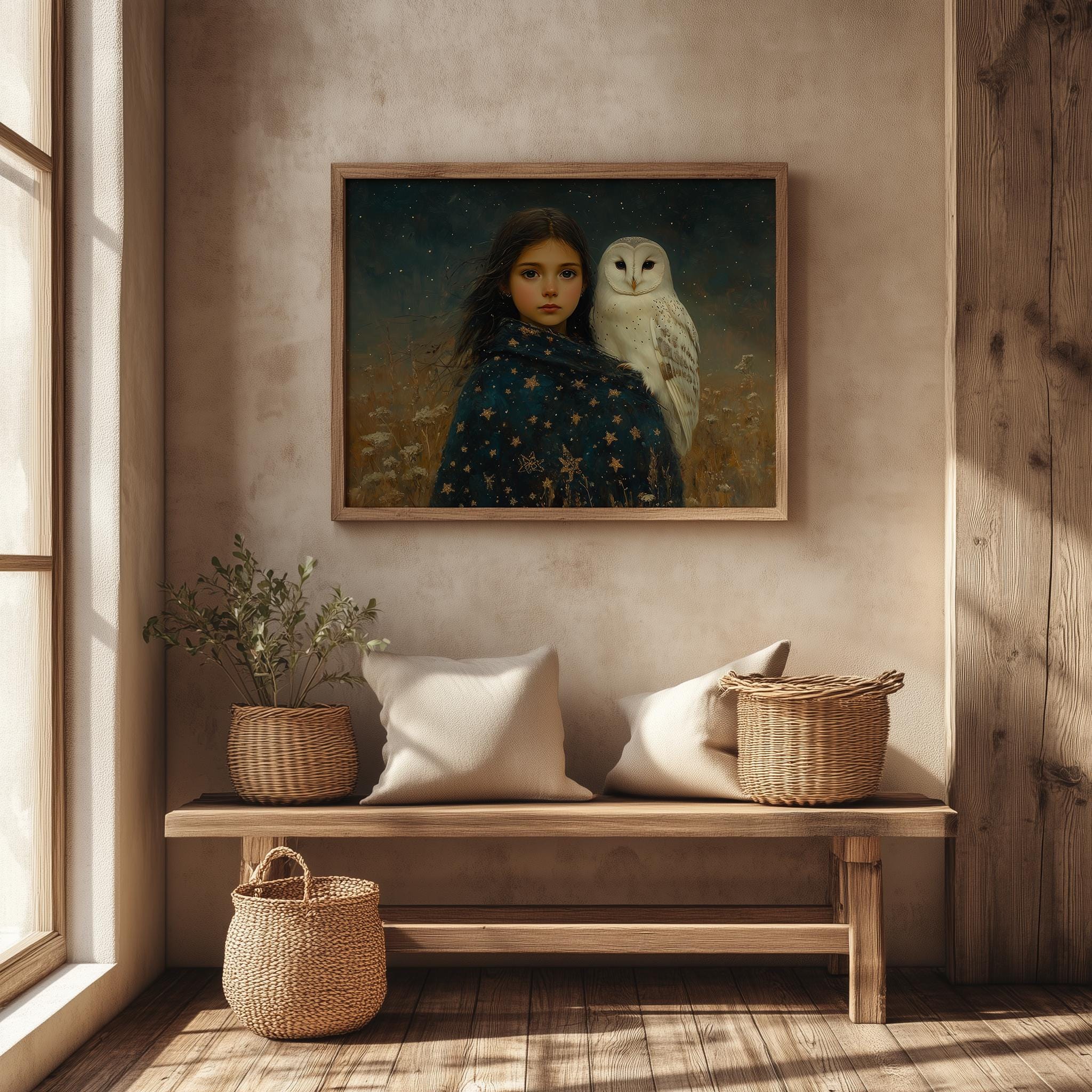 Immerse yourself in the charm with this painting of a mystical girl and her enchanting owl companion. An instantly downloadable print, it's perfect for elevating your decor with budget-friendly charm. This gives you the flexibility to customize the size, frame, and material according to your personal taste and space, ensuring a perfect fit for your walls.