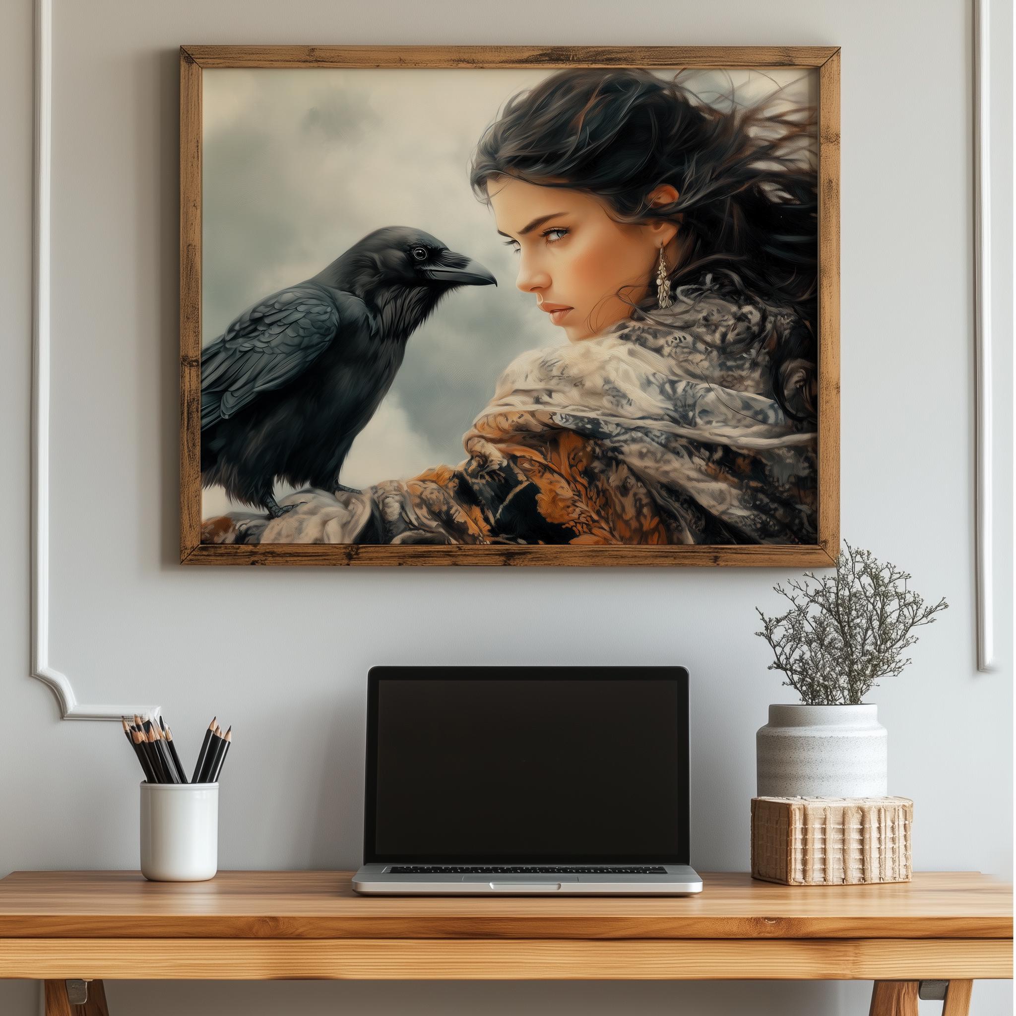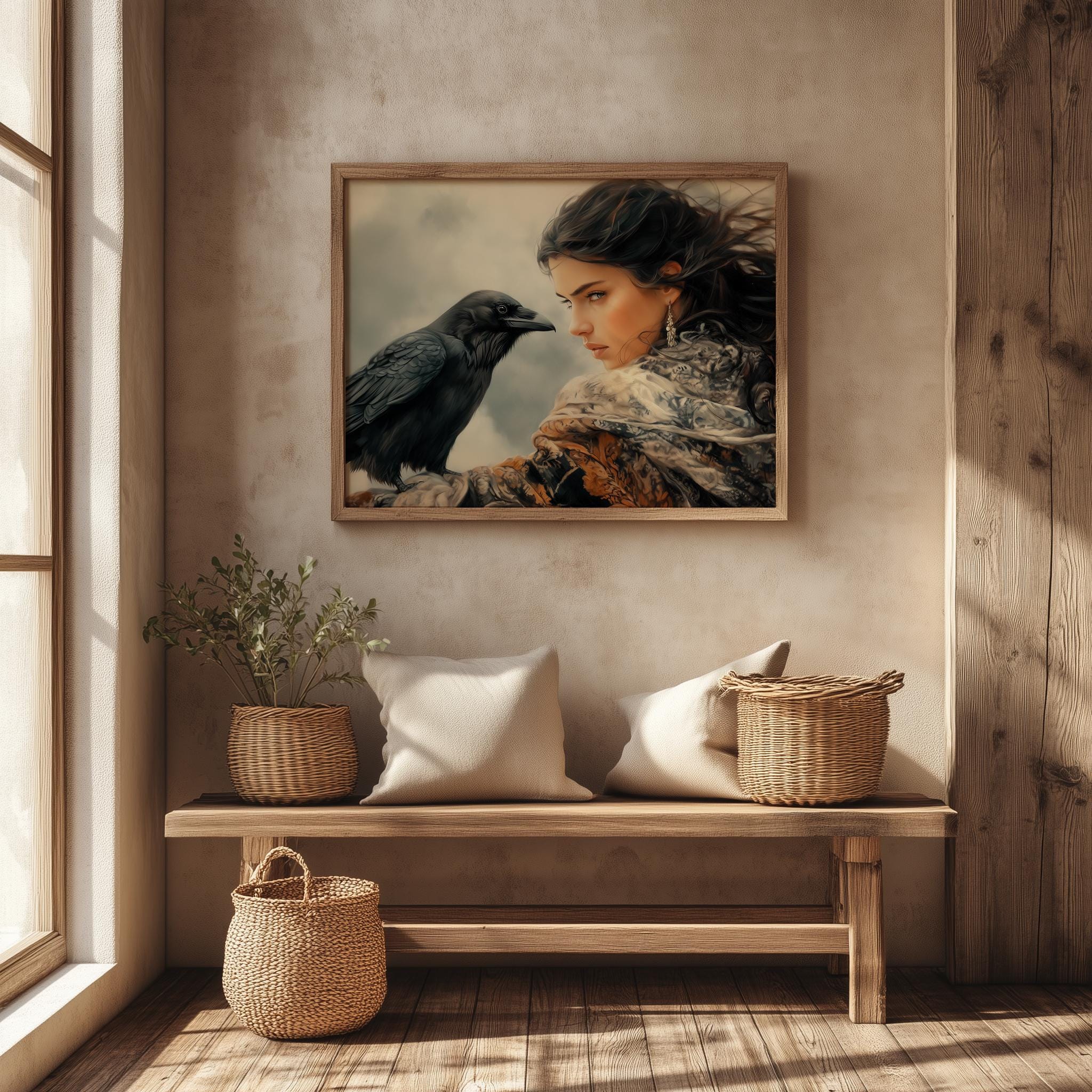 Immerse yourself in the charm with this painting of a mysterious woman accompanied by a majestic raven. An instantly downloadable print, it's perfect for elevating your decor with budget-friendly charm. This gives you the flexibility to customize the size, frame, and material according to your personal taste and space, ensuring a perfect fit for your walls.