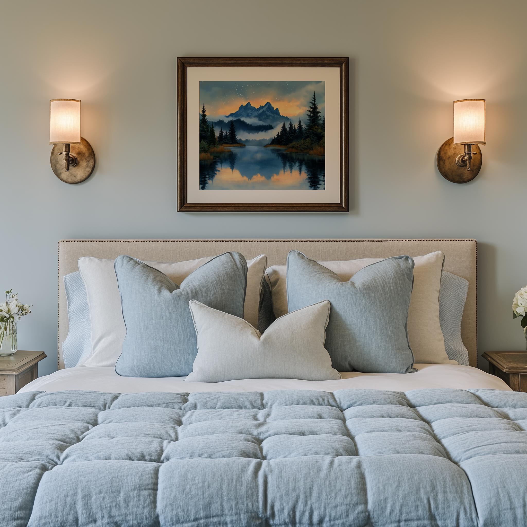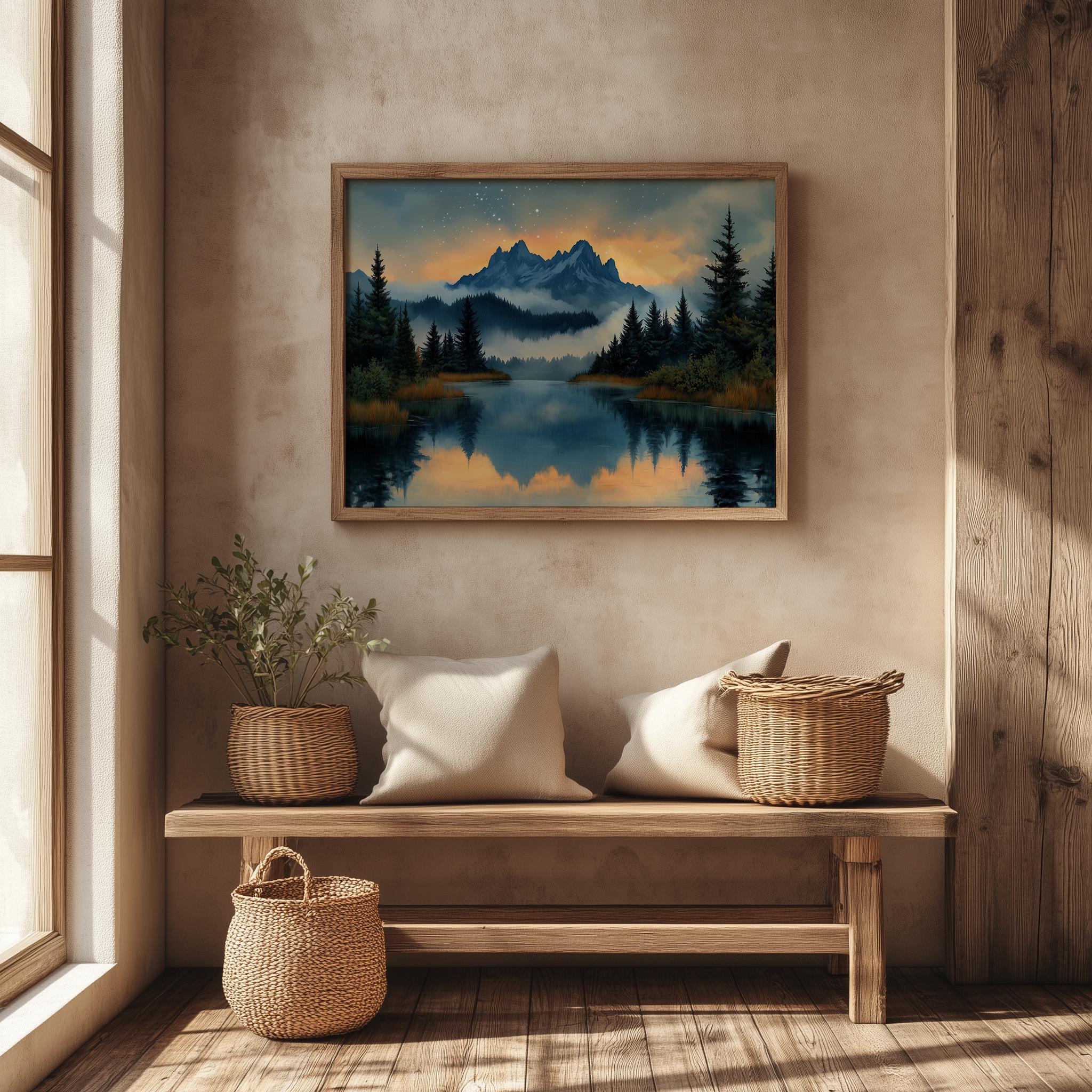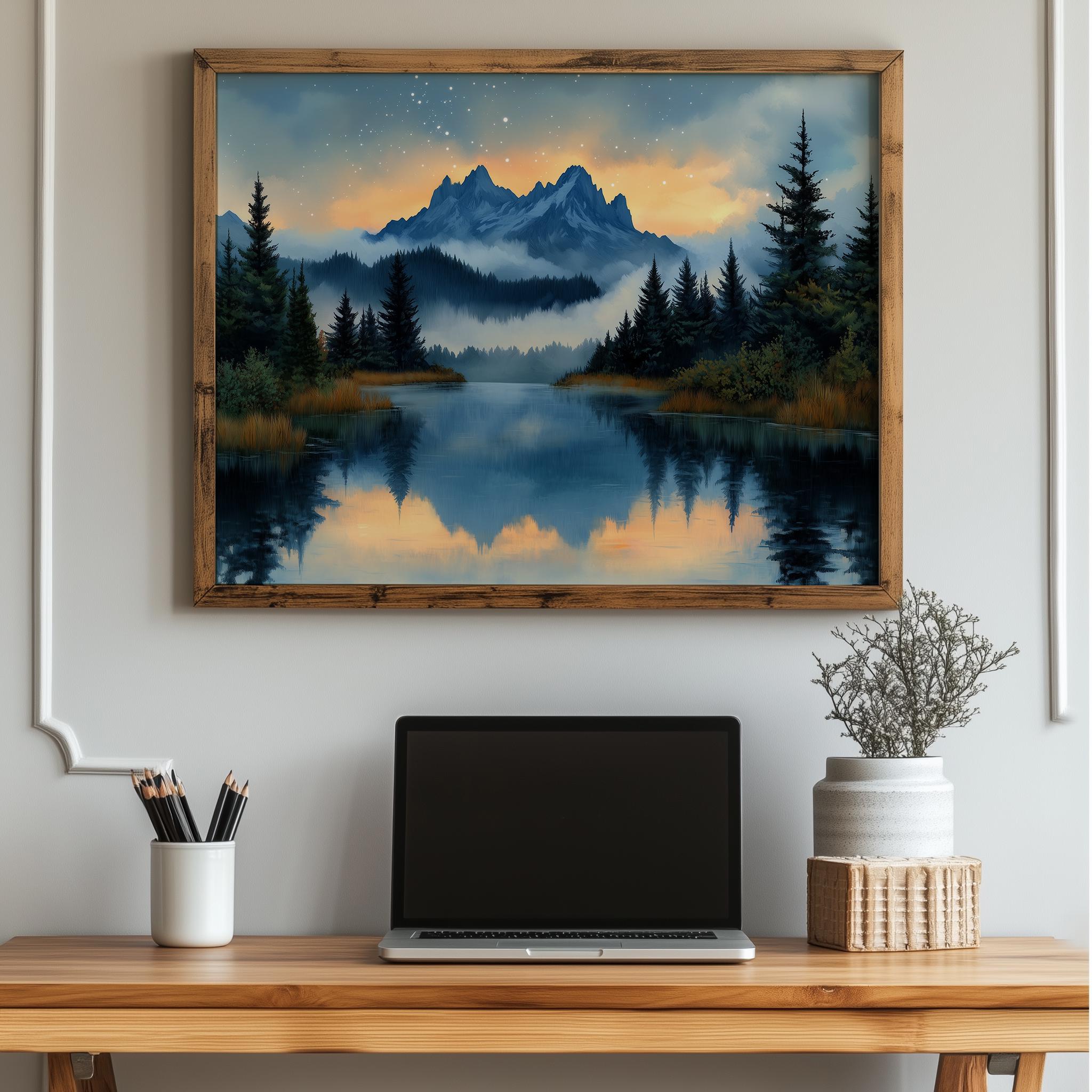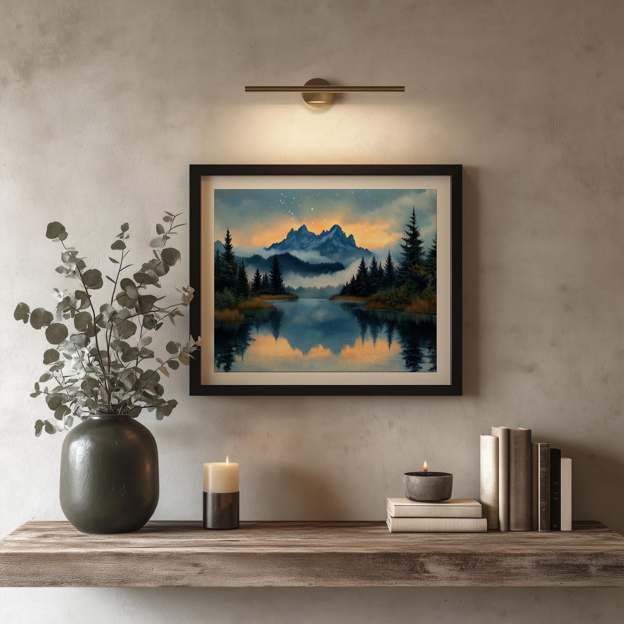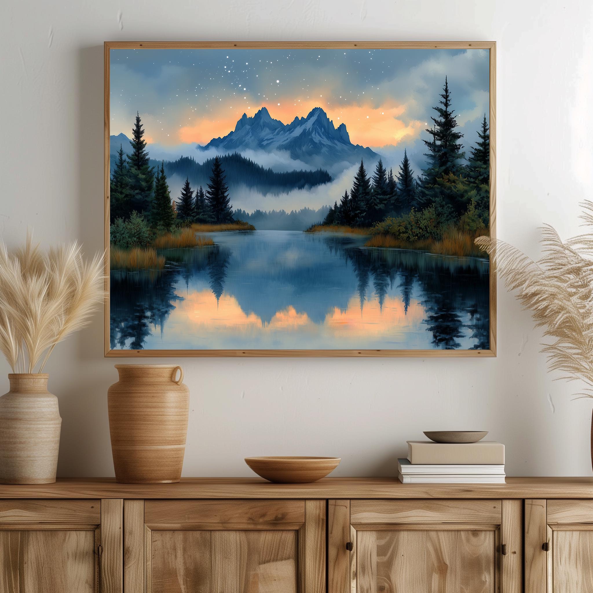 Immerse yourself in the charm with this painting of a serene alpine lake at sunset. An instantly downloadable print, it's perfect for elevating your decor with budget-friendly charm. This gives you the flexibility to customize the size, frame, and material according to your personal taste and space, ensuring a perfect fit for your walls.