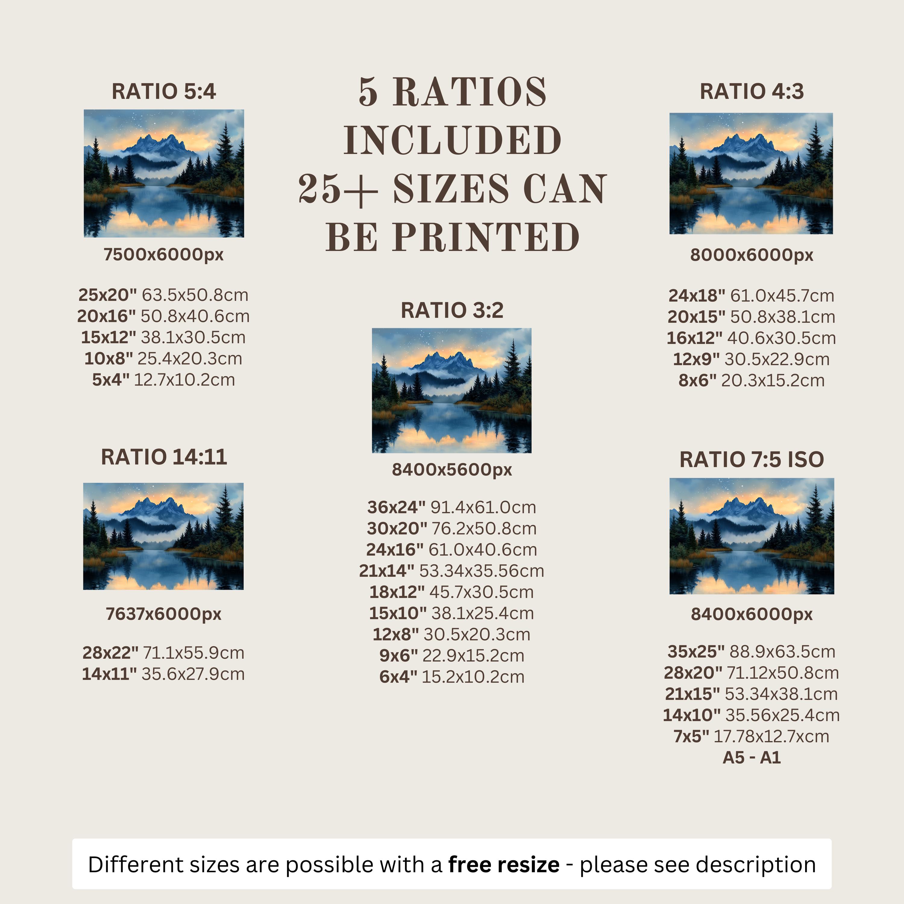 Each artwork includes 5 aspect ratios with 25+ print sizes. Most standard frames are covered. One custom resize per purchase available—message before ordering.