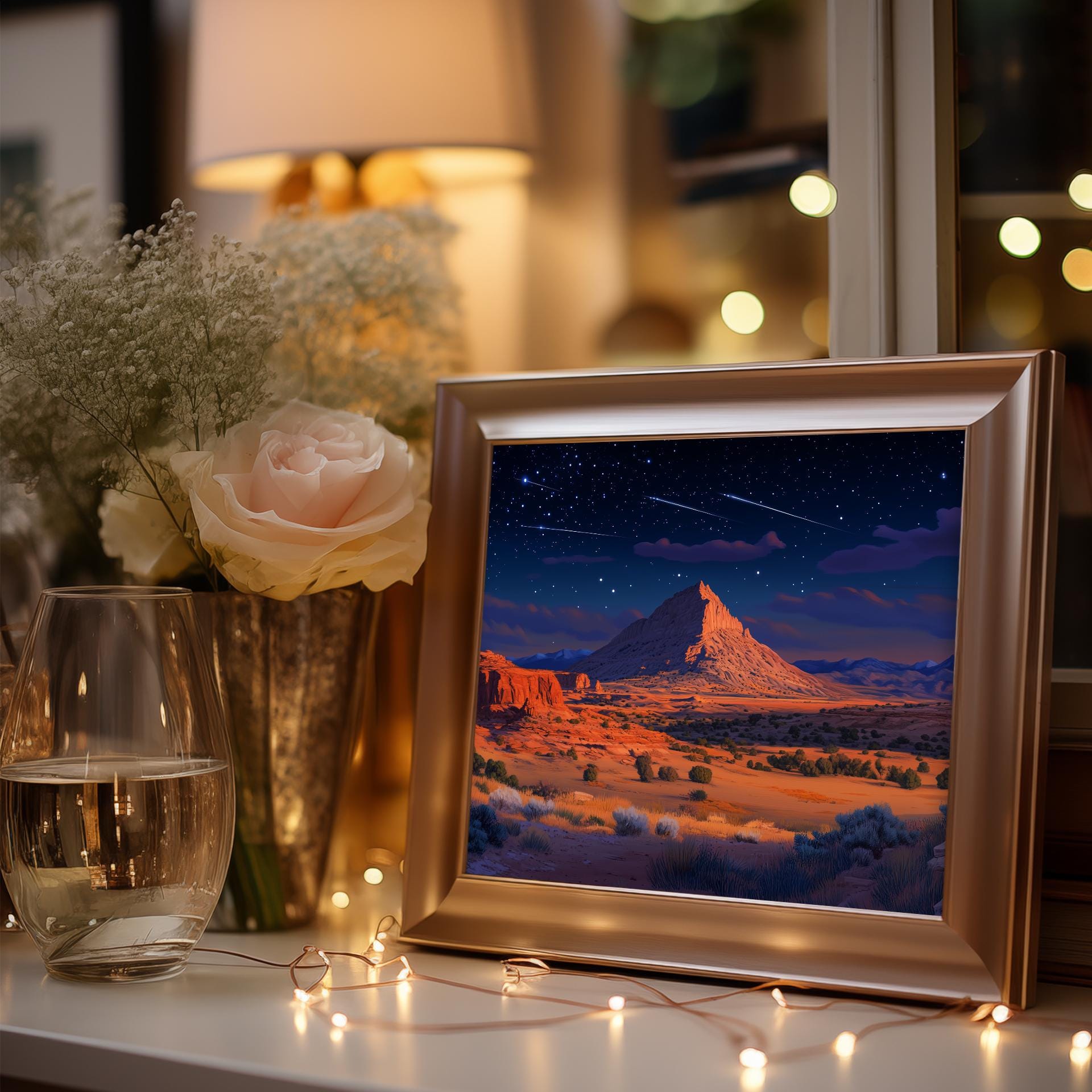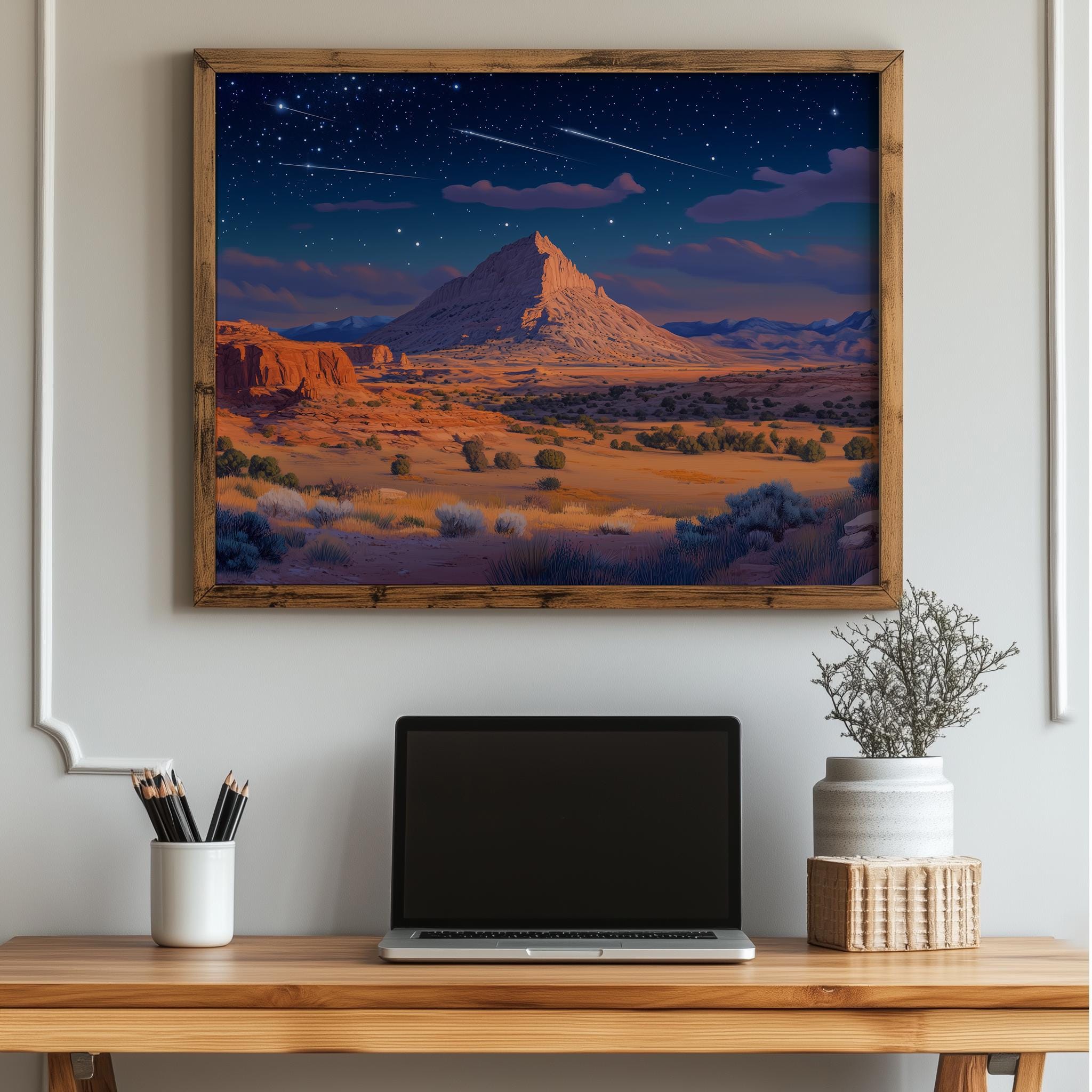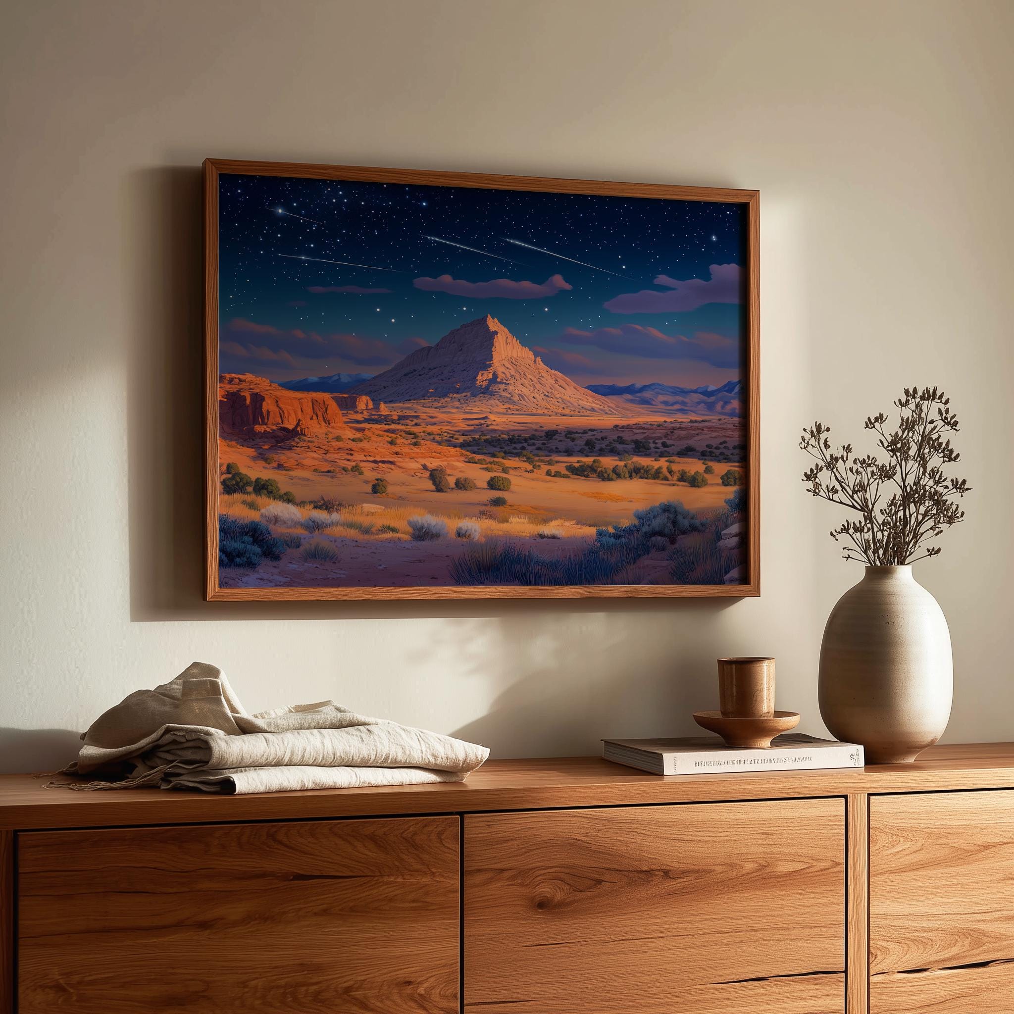 Immerse yourself in the charm with this painting of a dramatic desert landscape illuminated by a cosmic sky. An instantly downloadable print, it's perfect for elevating your decor with budget-friendly charm. This gives you the flexibility to customize the size, frame, and material according to your personal taste and space, ensuring a perfect fit for your walls.
