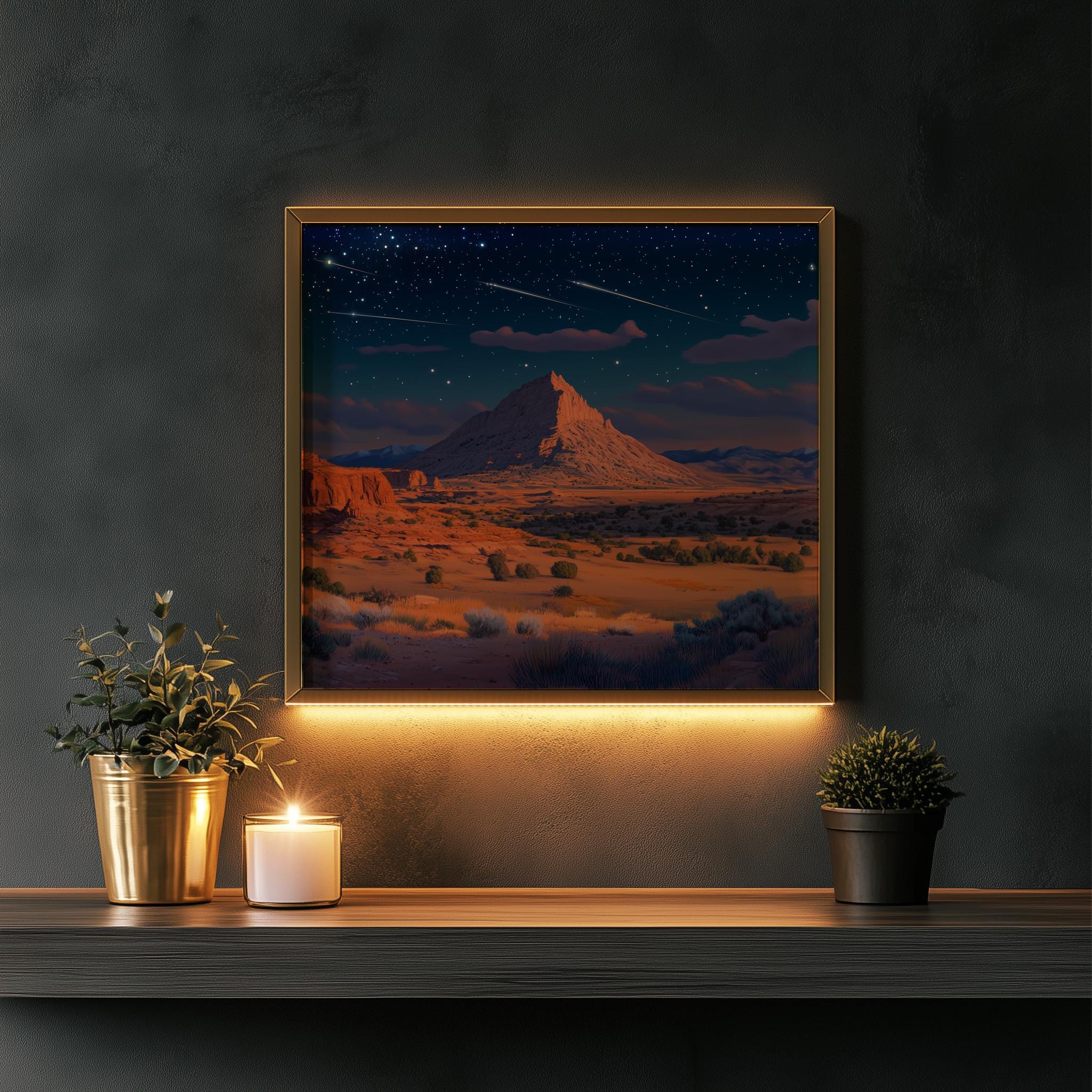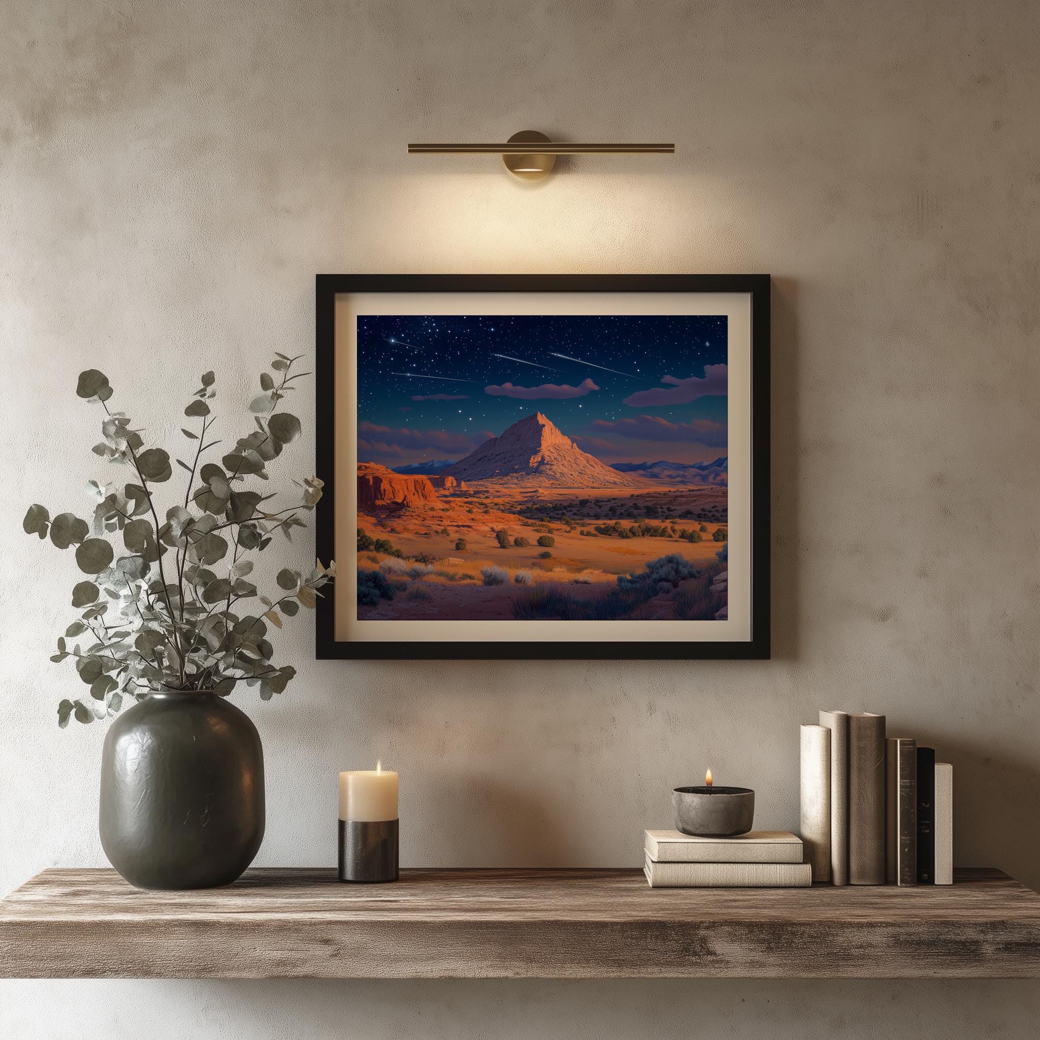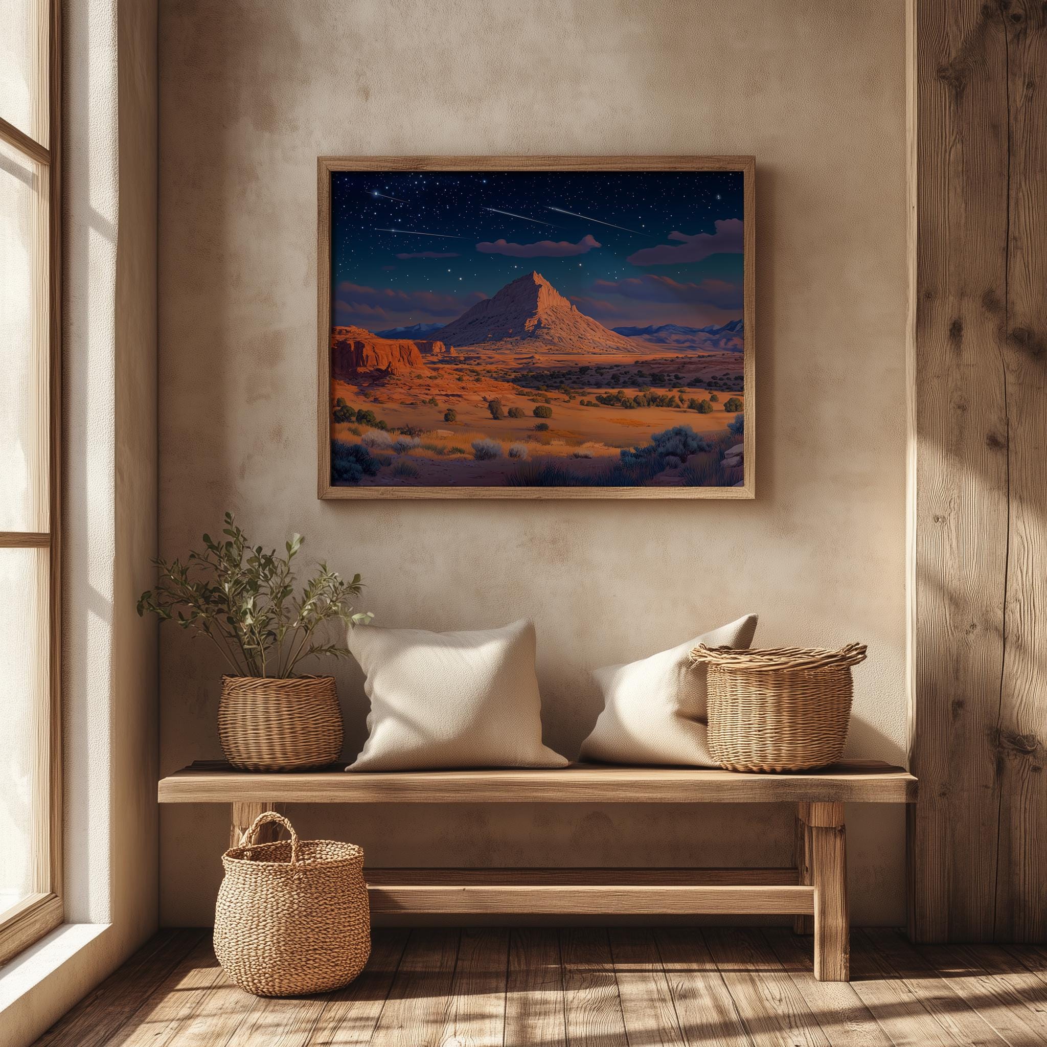 Immerse yourself in the charm with this painting of a dramatic desert landscape illuminated by a cosmic sky. An instantly downloadable print, it's perfect for elevating your decor with budget-friendly charm. This gives you the flexibility to customize the size, frame, and material according to your personal taste and space, ensuring a perfect fit for your walls.