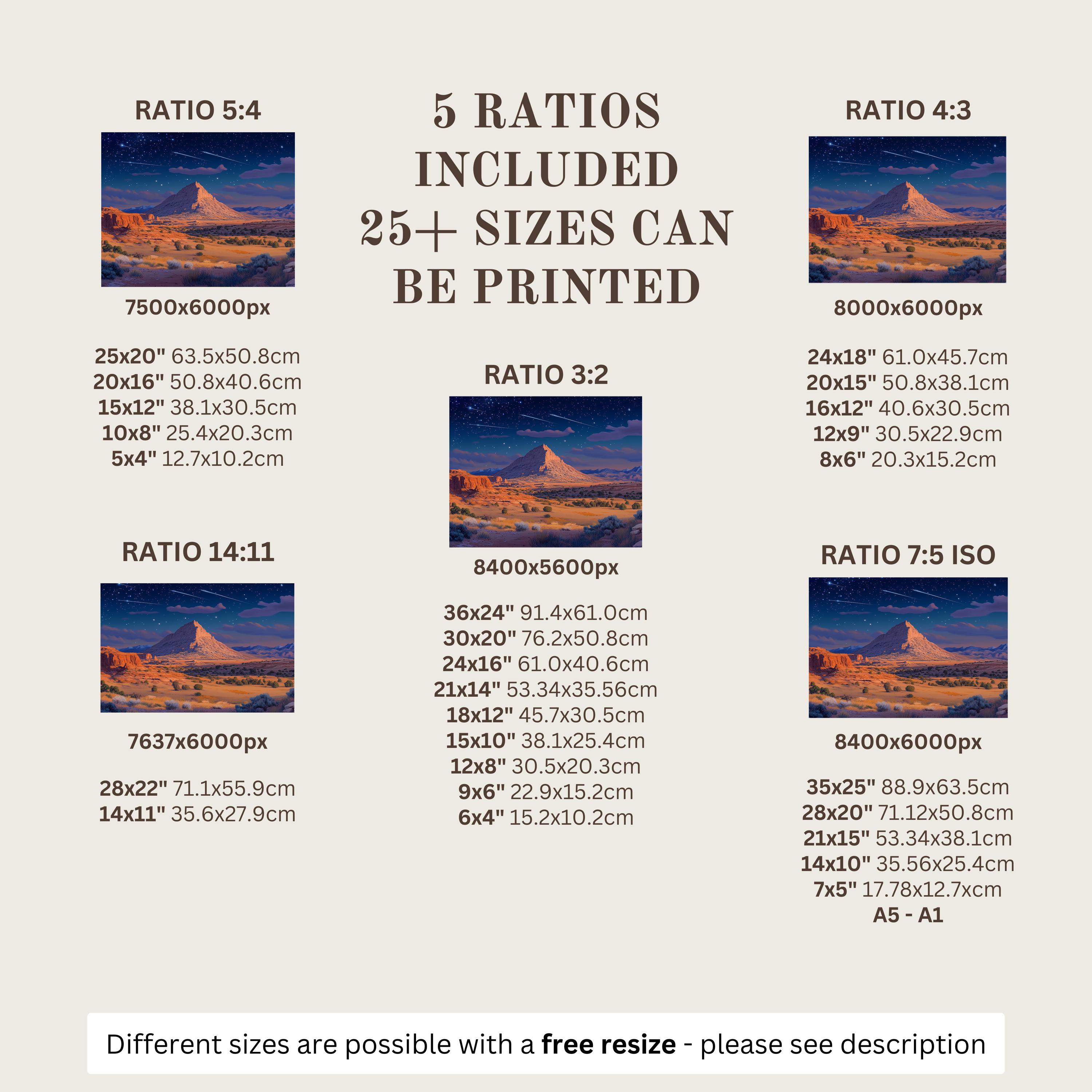 Each artwork includes 5 aspect ratios with 25+ print sizes. Most standard frames are covered. One custom resize per purchase available—message before ordering.
