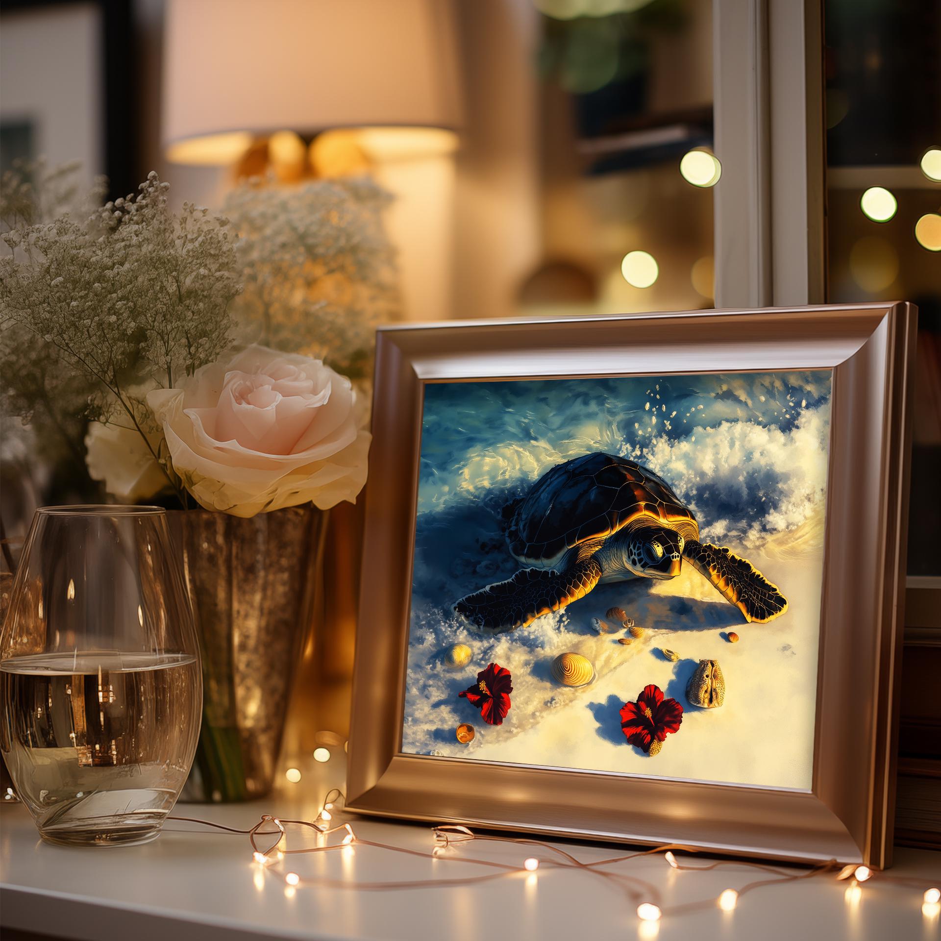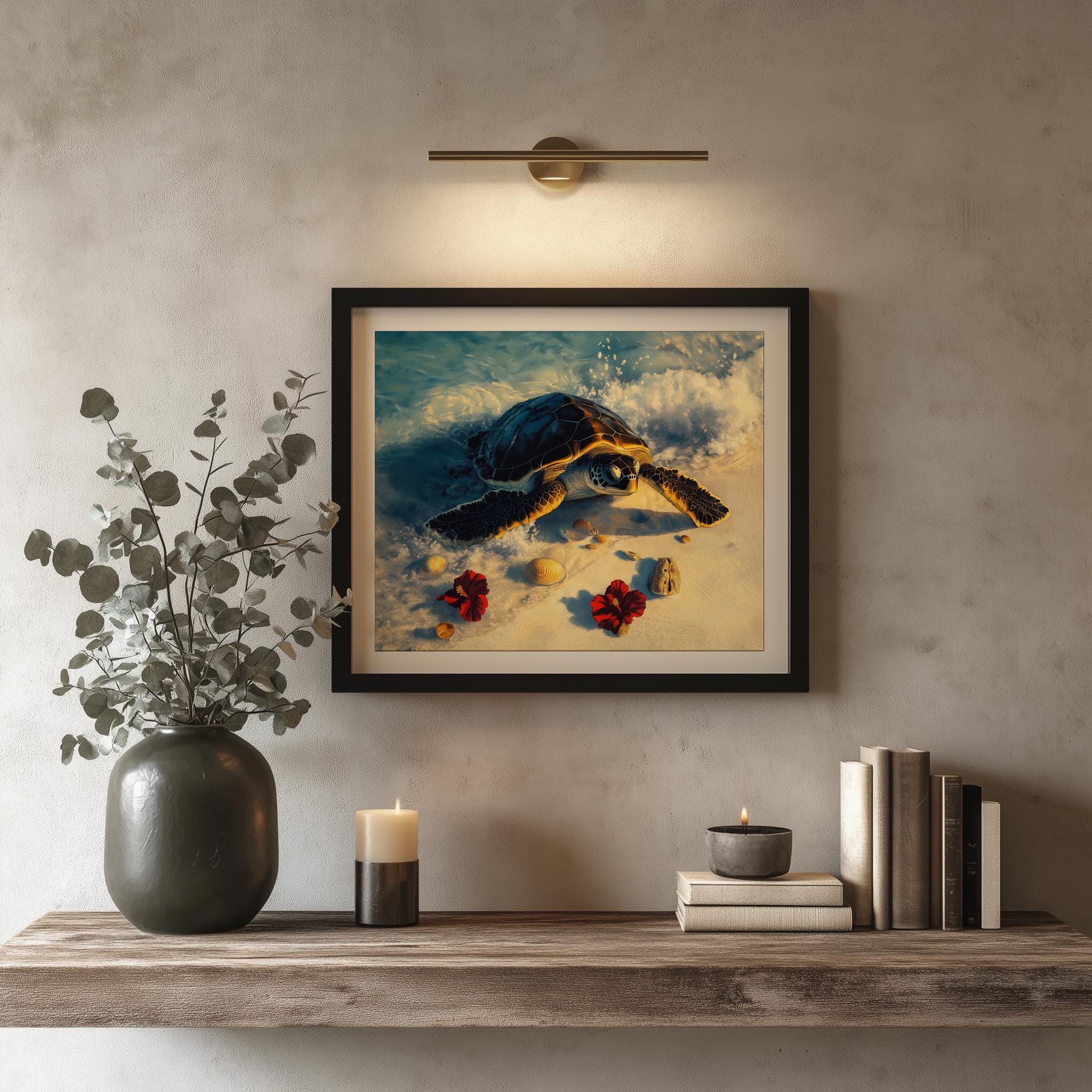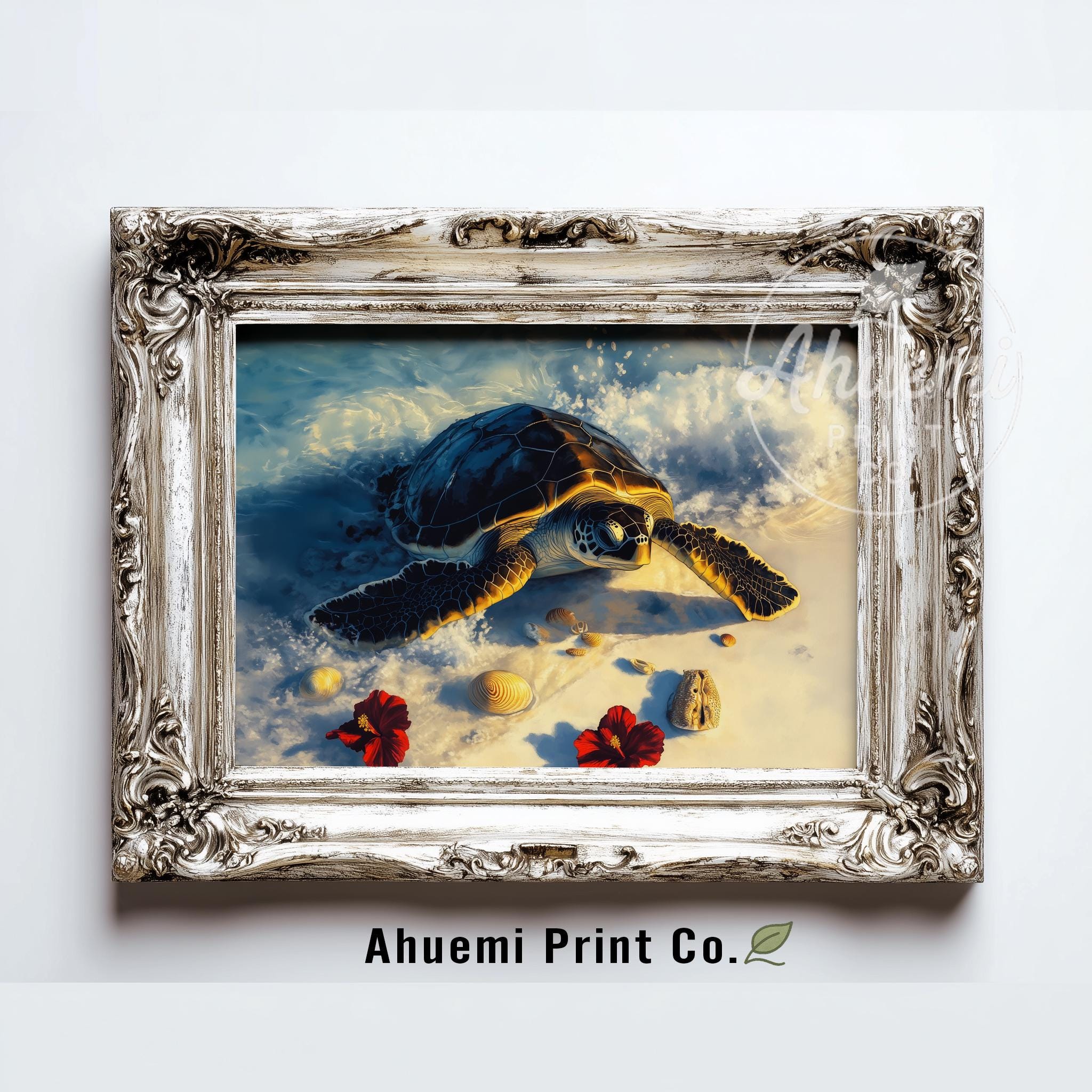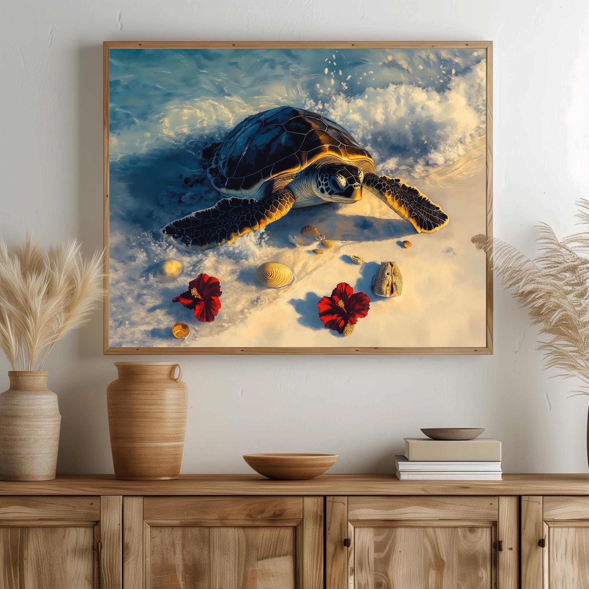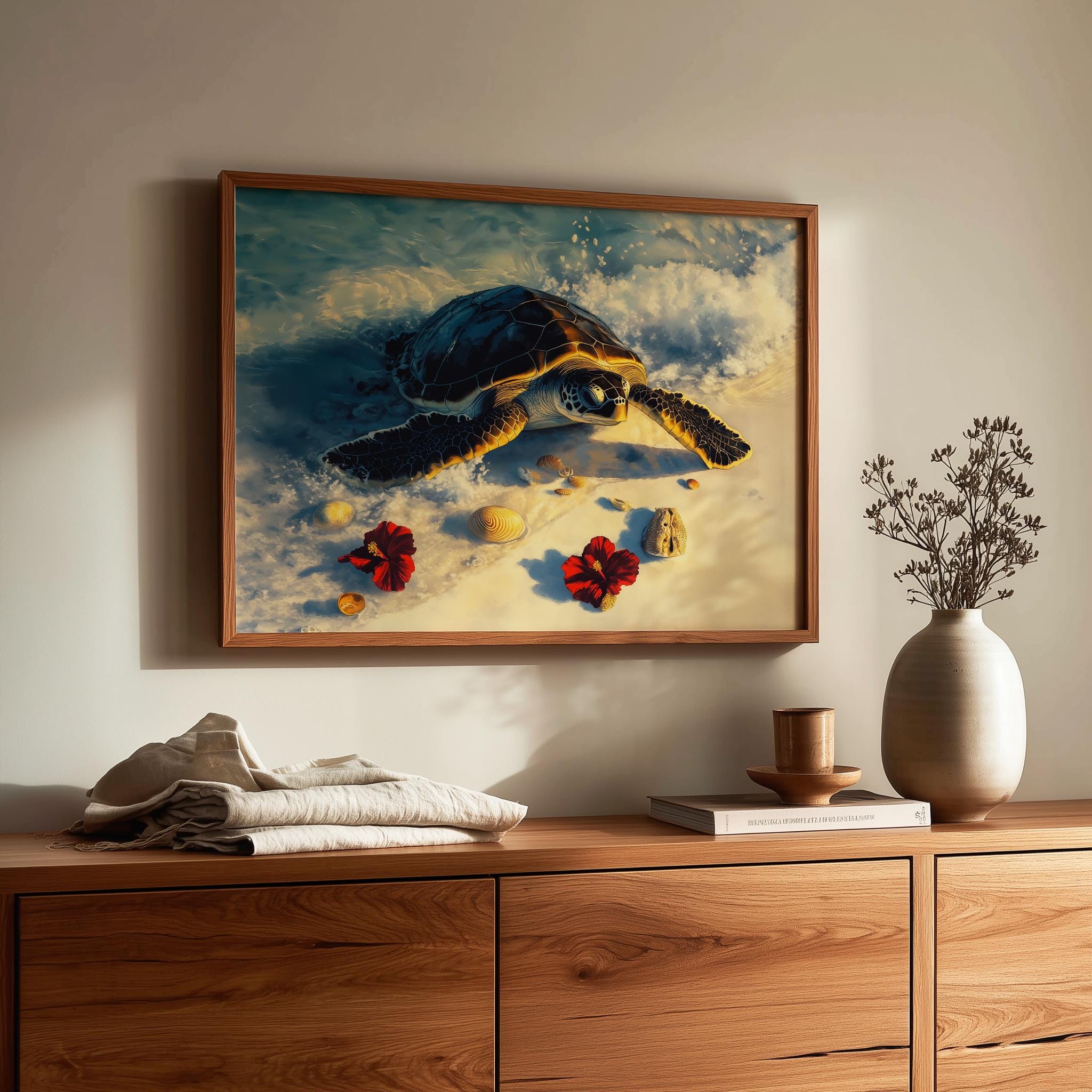 Immerse yourself in the charm with this painting of a adorable baby sea turtle gliding through a serene ocean landscape. An instantly downloadable print, it's perfect for elevating your decor with budget-friendly charm. This gives you the flexibility to customize the size, frame, and material according to your personal taste and space, ensuring a perfect fit for your walls.