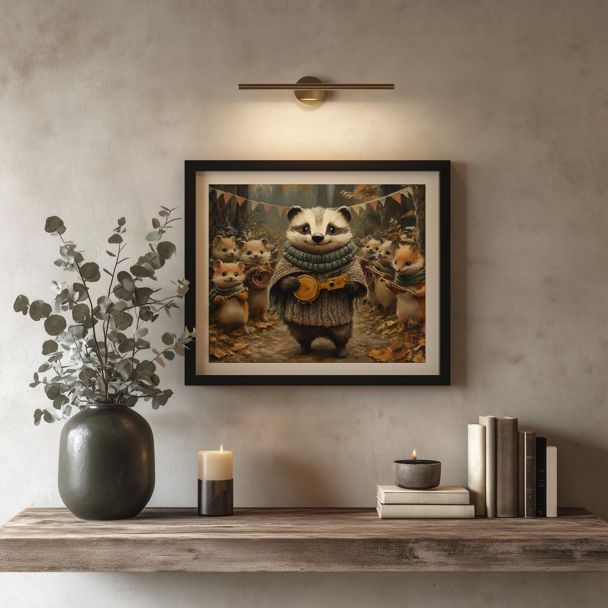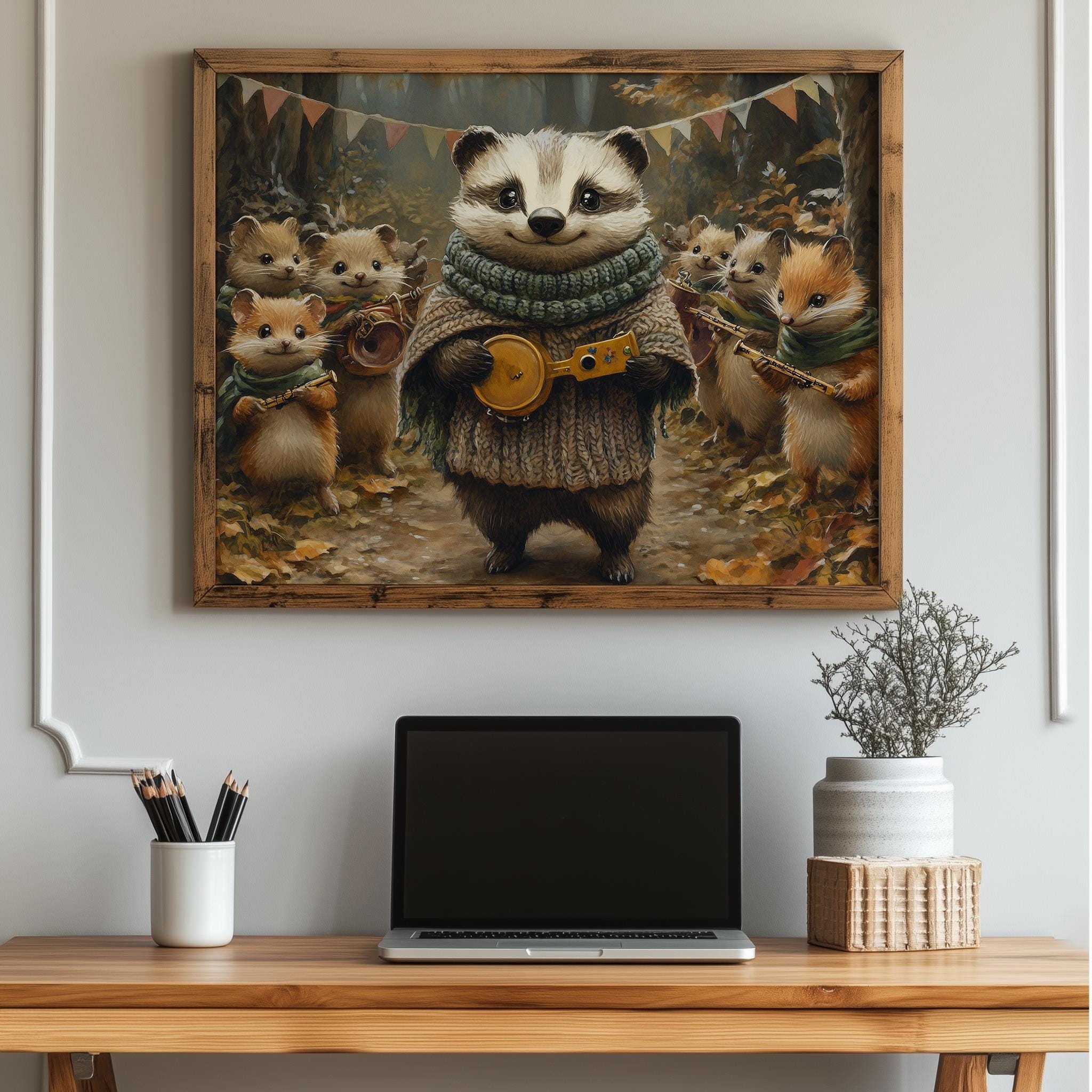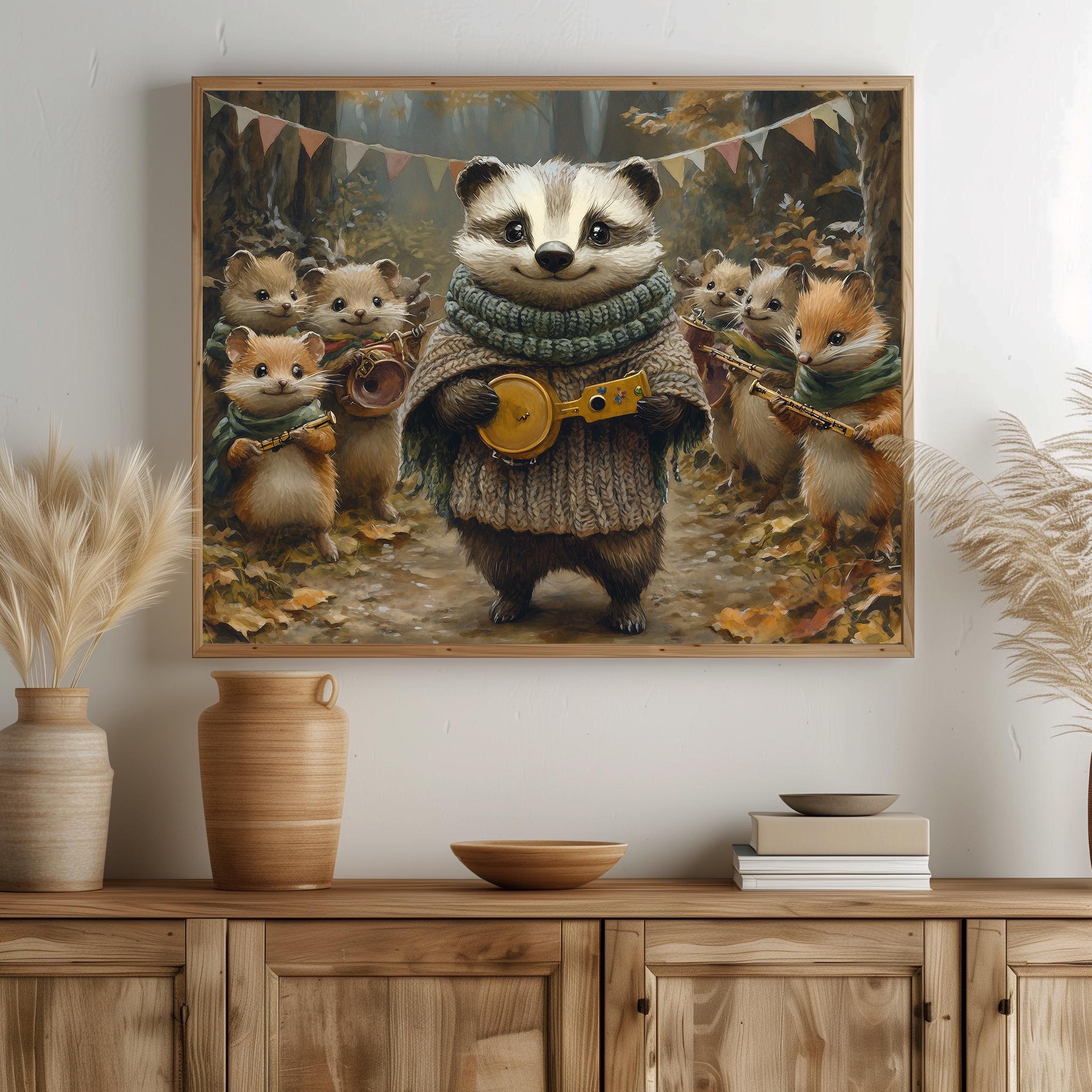 Immerse yourself in the charm with this painting of a badger and its woodland friends, dressed in cozy knitted scarves. An instantly downloadable print, it's perfect for elevating your decor with budget-friendly charm. This gives you the flexibility to customize the size, frame, and material according to your personal taste and space, ensuring a perfect fit for your walls.