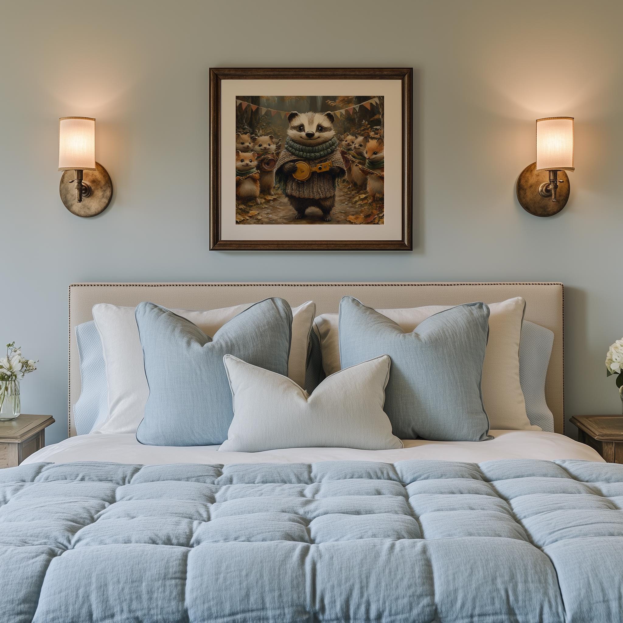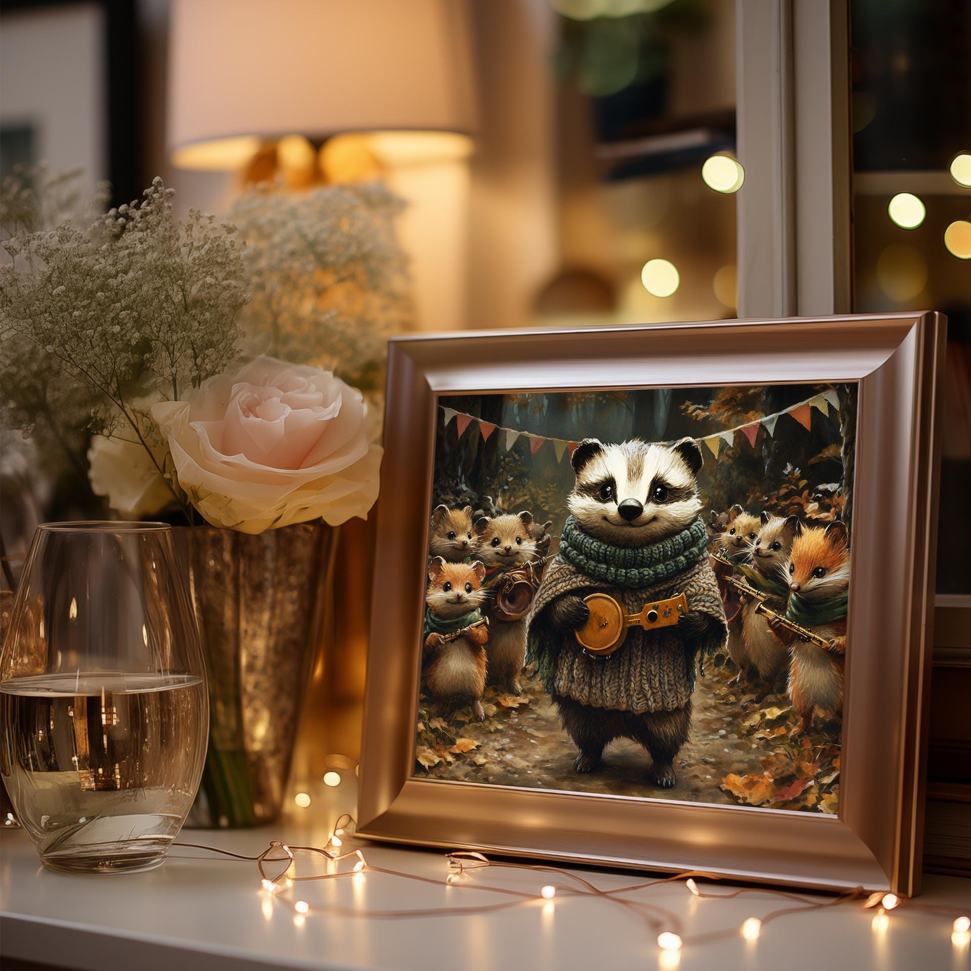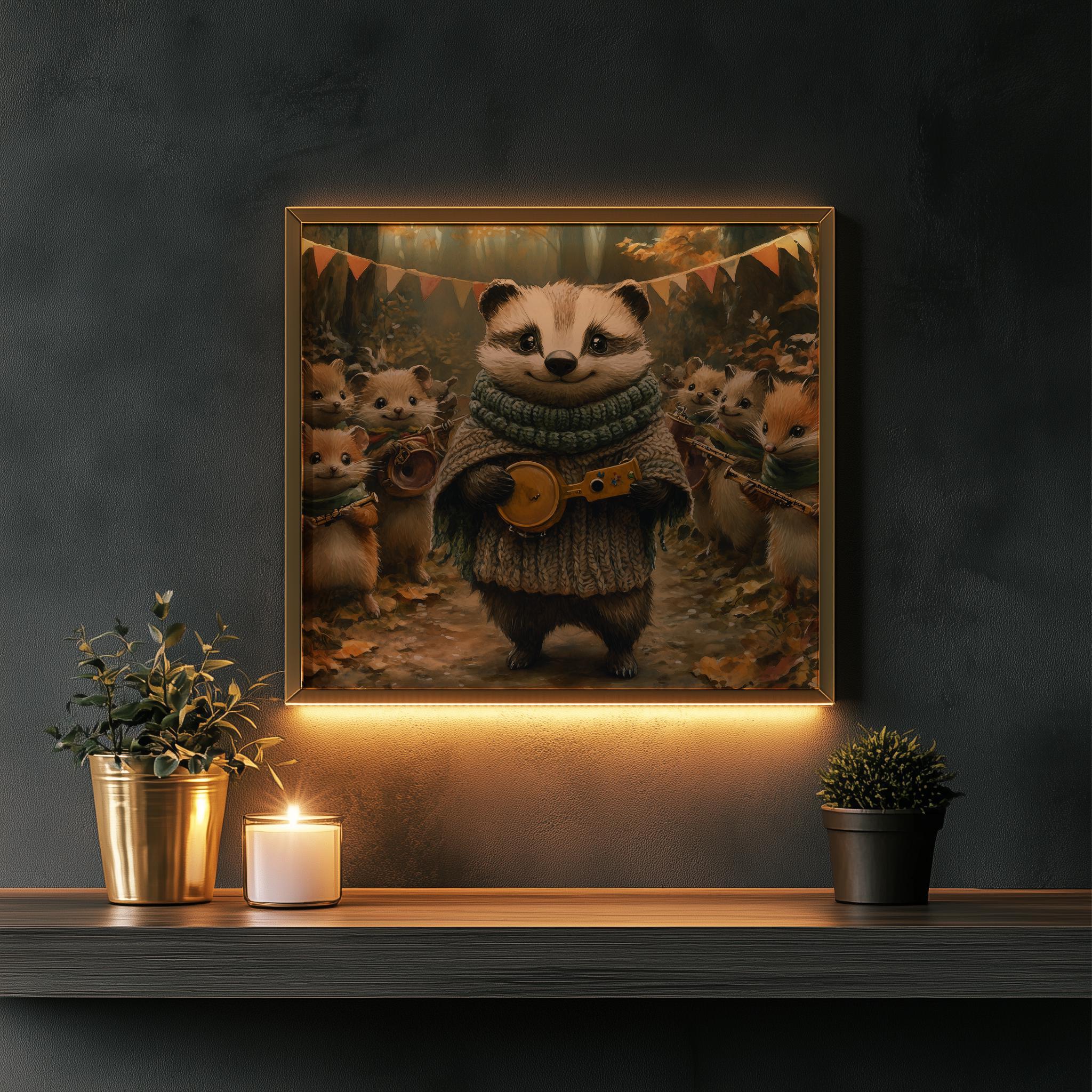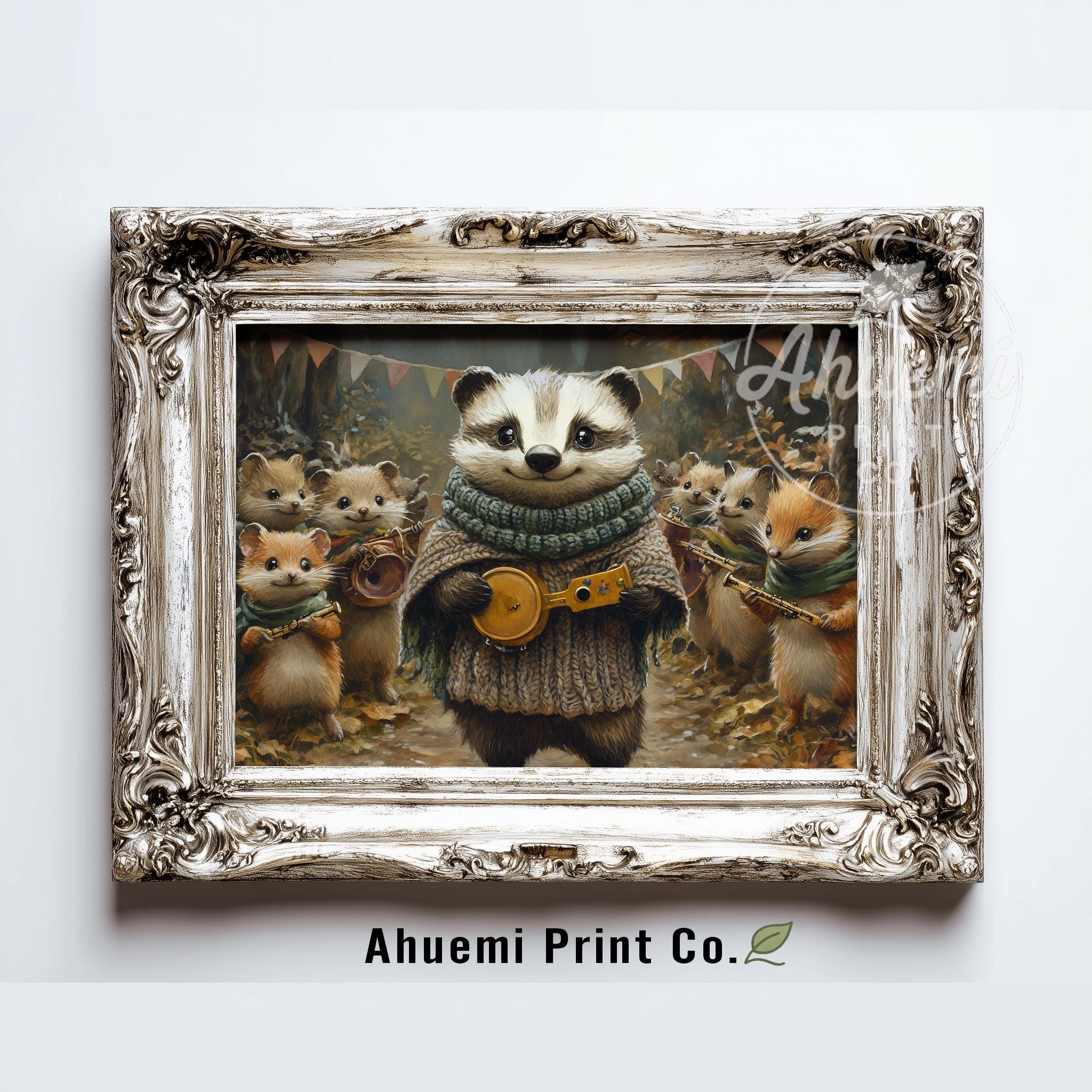 Immerse yourself in the charm with this painting of a badger and its woodland friends, dressed in cozy knitted scarves. An instantly downloadable print, it's perfect for elevating your decor with budget-friendly charm. This gives you the flexibility to customize the size, frame, and material according to your personal taste and space, ensuring a perfect fit for your walls.