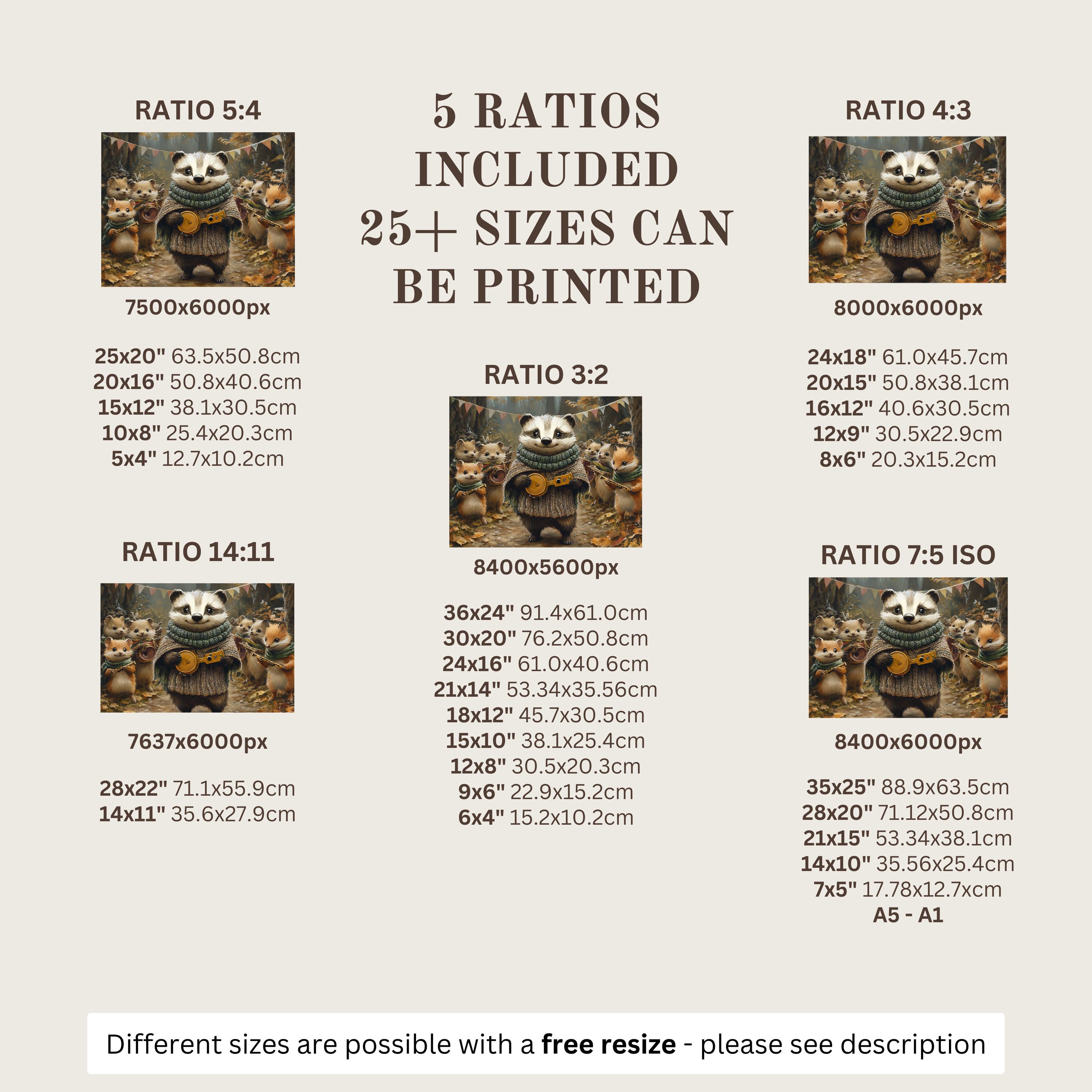 Each artwork includes 5 aspect ratios with 25+ print sizes. Most standard frames are covered. One custom resize per purchase available—message before ordering.